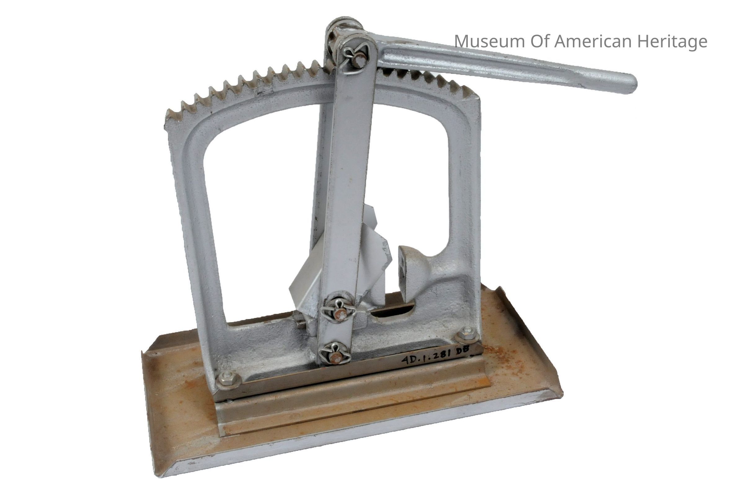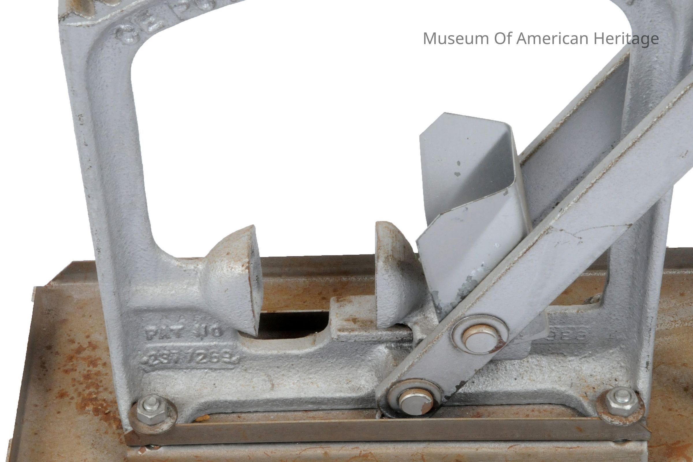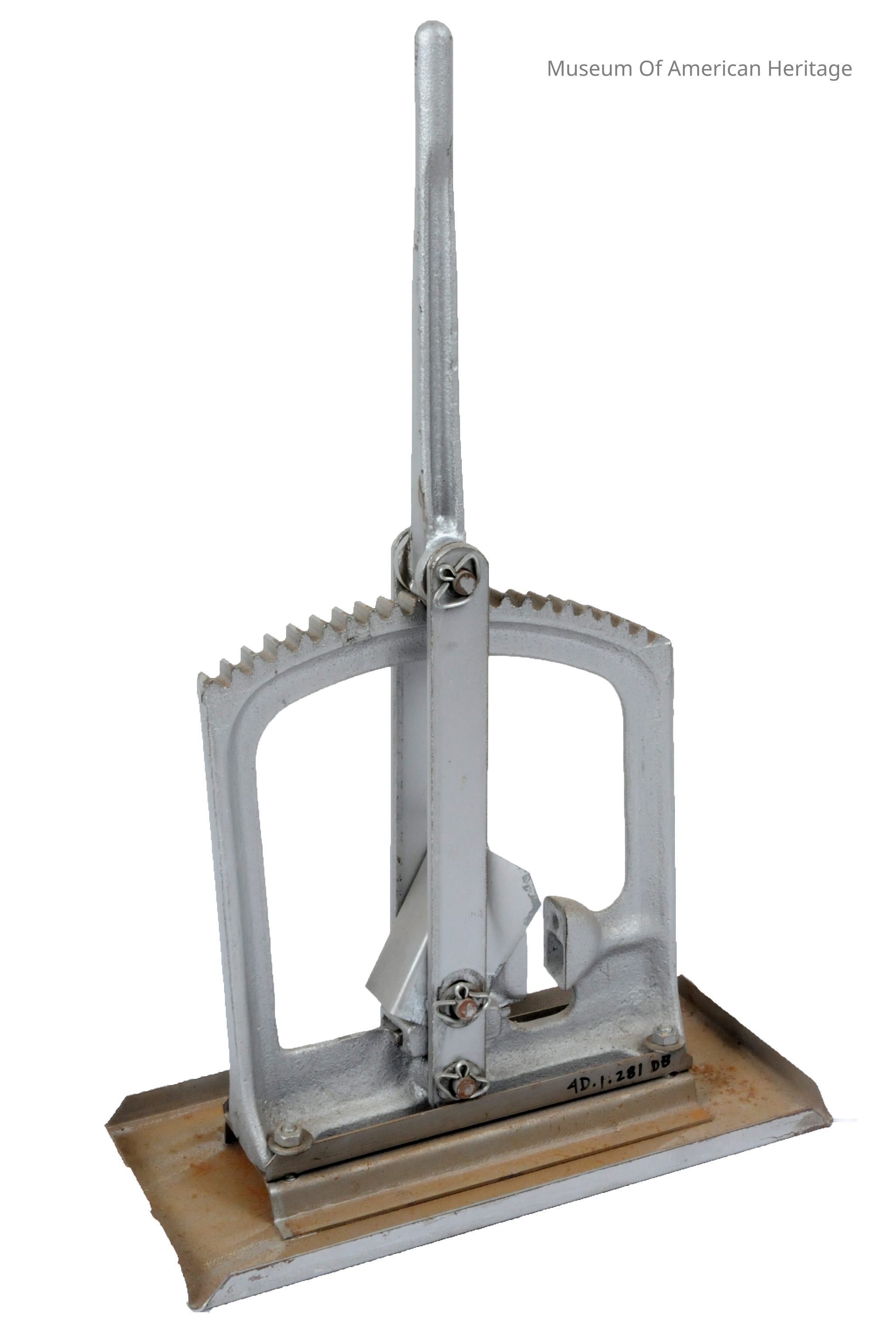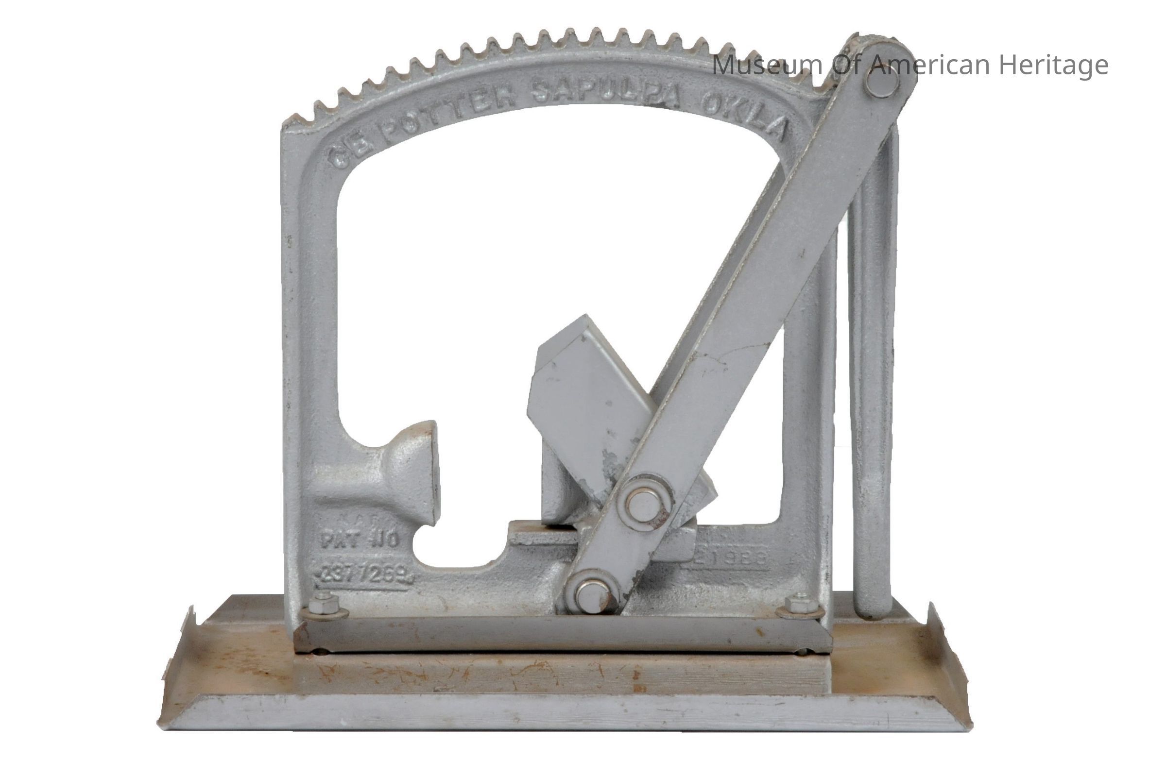 Horizontal action, nut pushed against stationery piece, handle has ratchet to hold position.