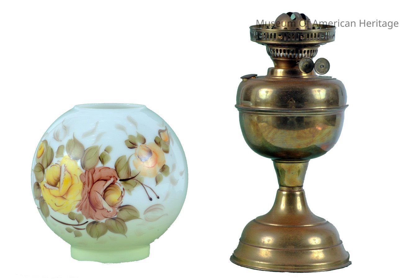 Floral glass shade, two wicks, built-in snuffer.