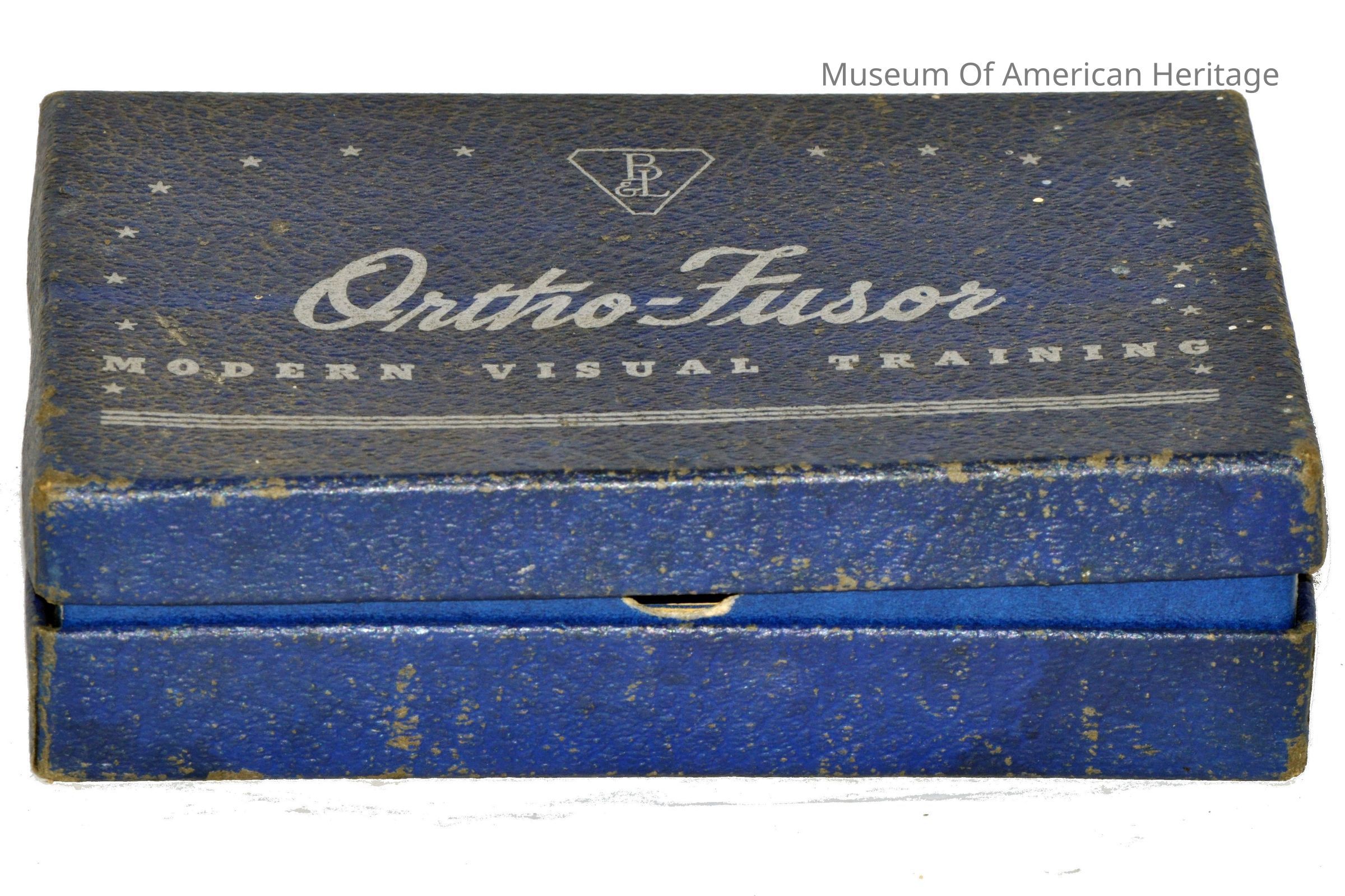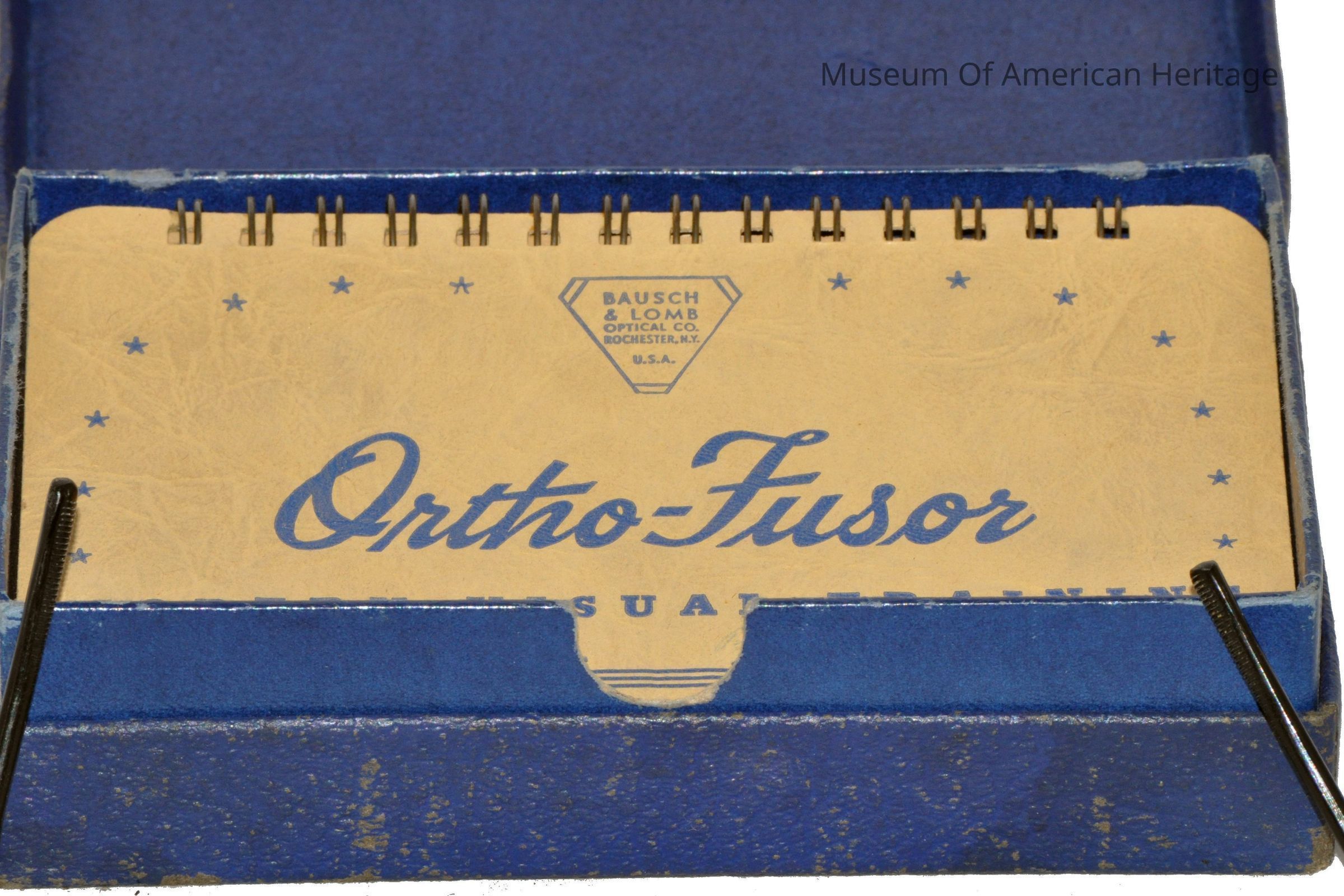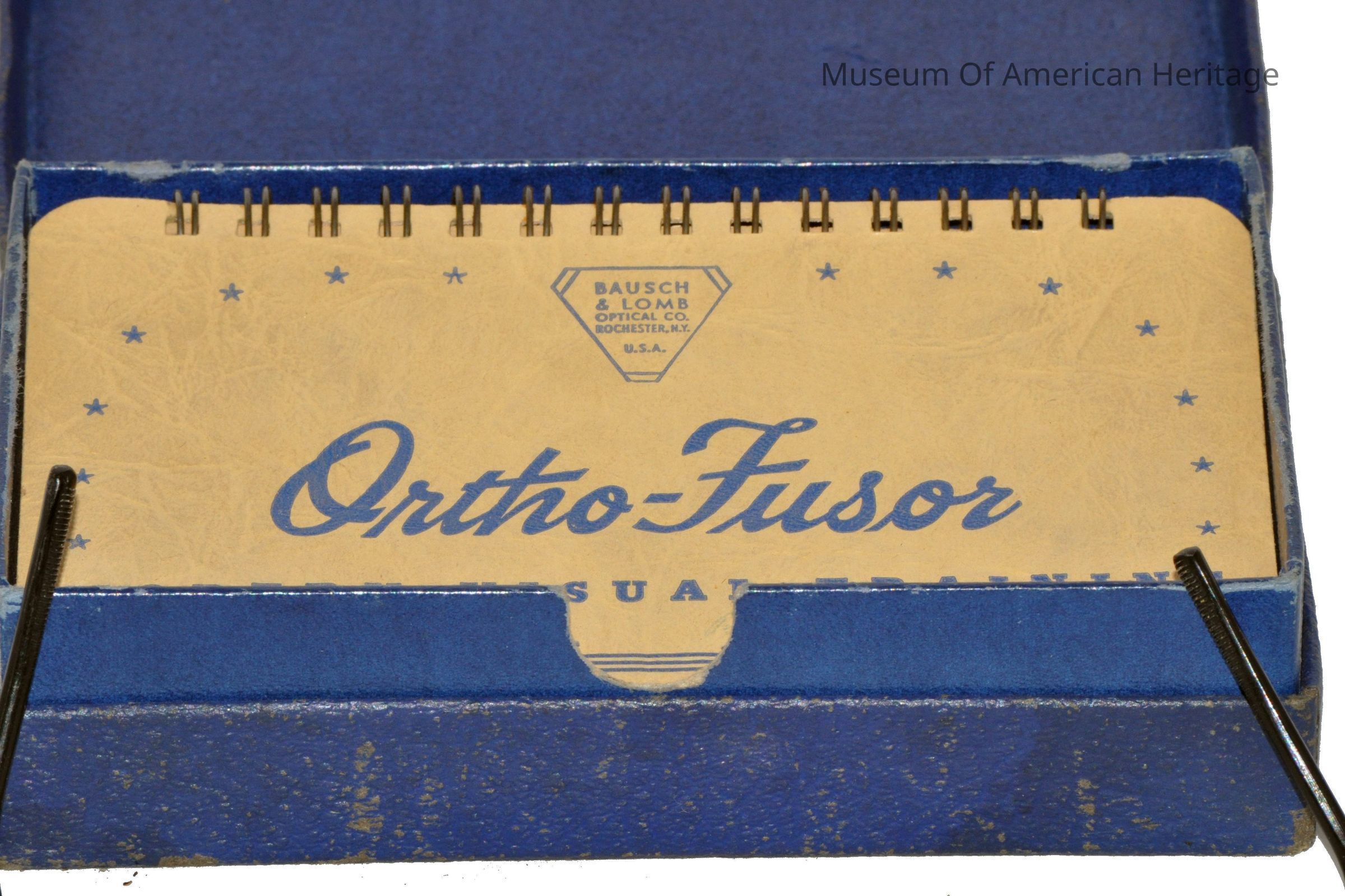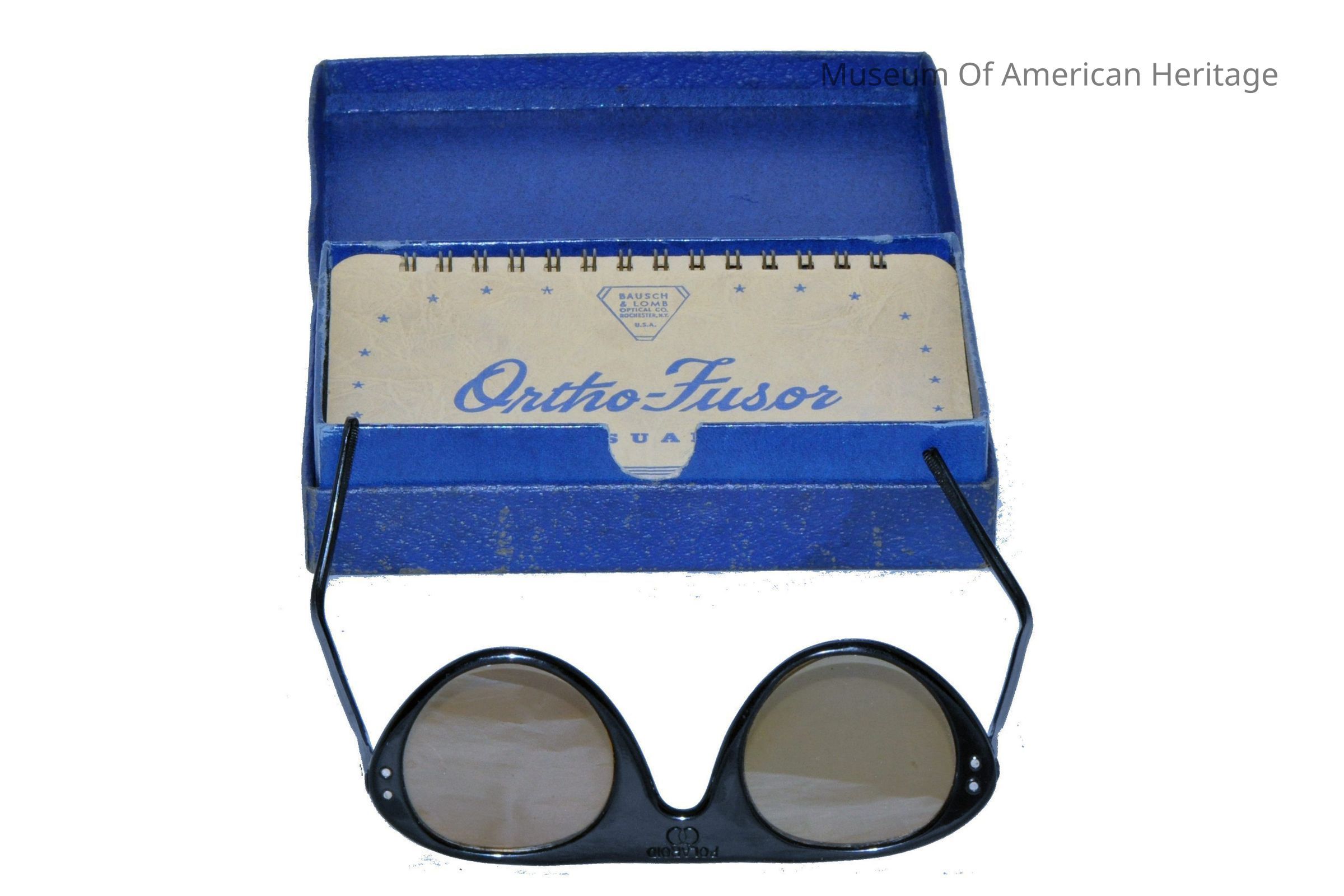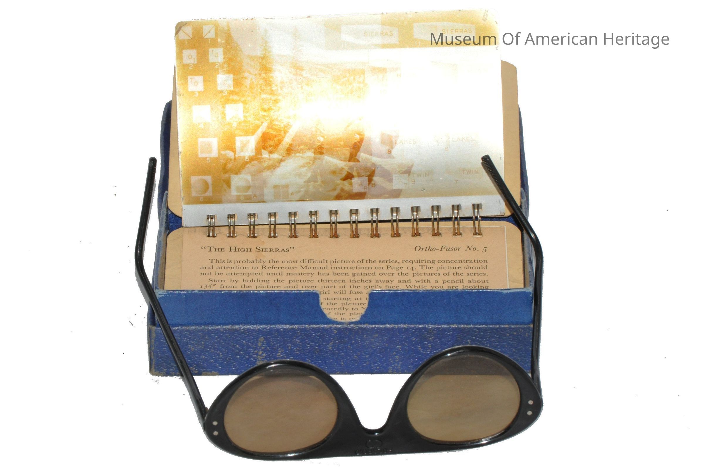 Polaroid glasses, blue cardboard box, instruction booklets with 3-D photos for training eyes.