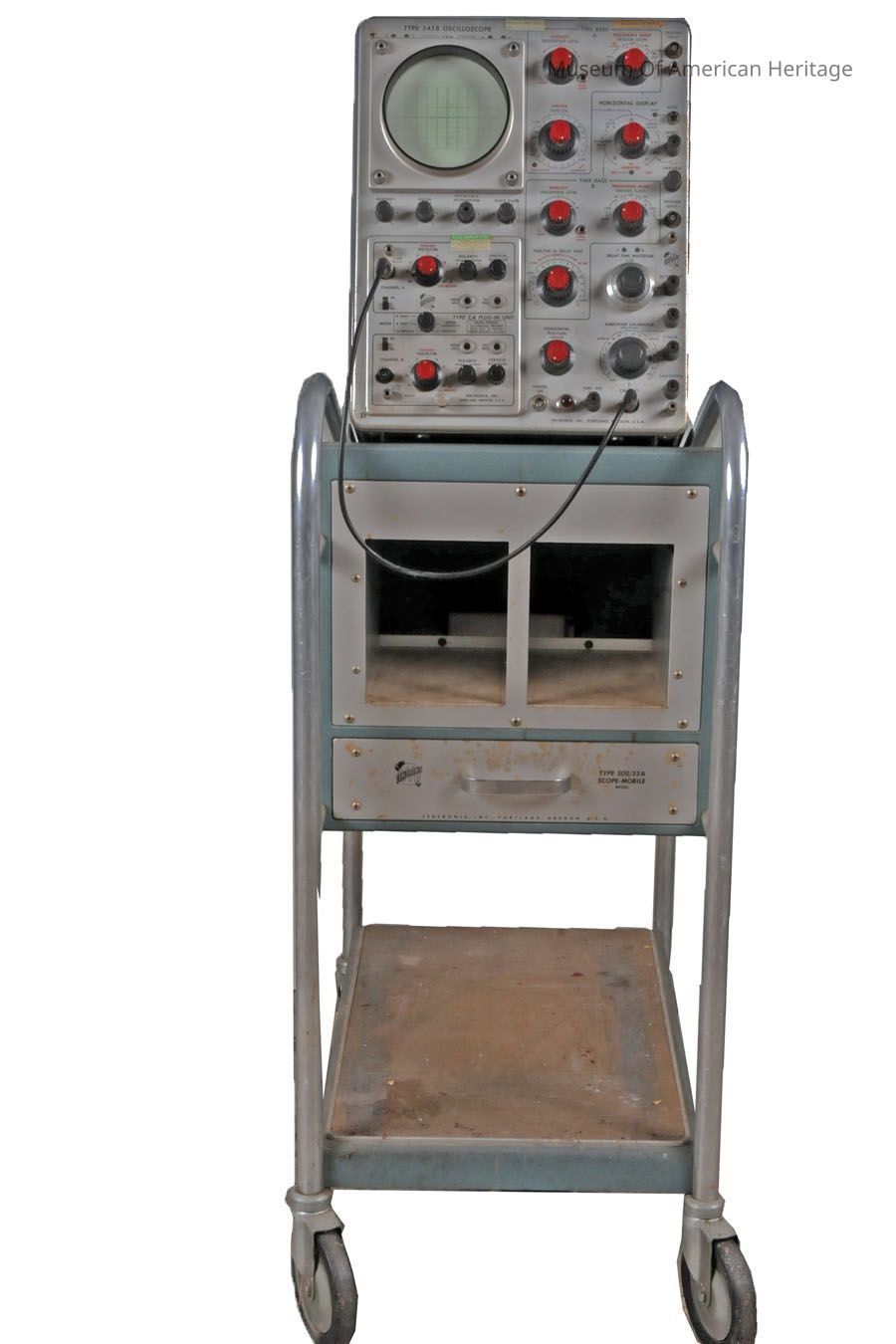 On original Oscilloscope cart (Type 500/53A Scope-Mobile). Somewhat functional. Has some original oscilloscope probes and cables cart in MA-B-4.