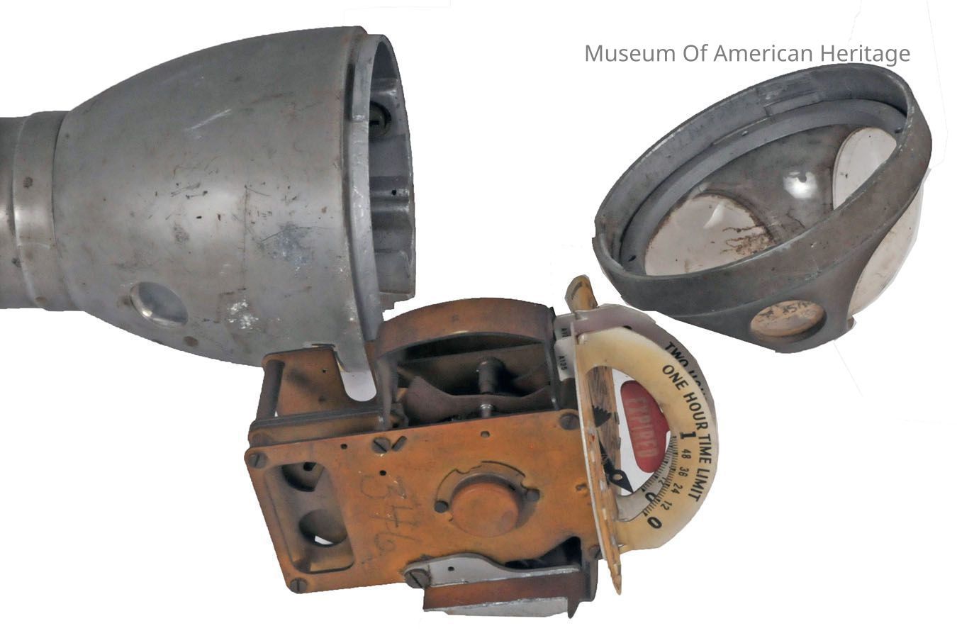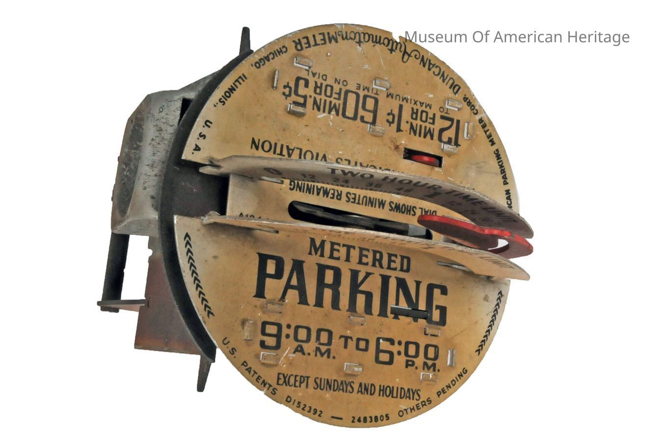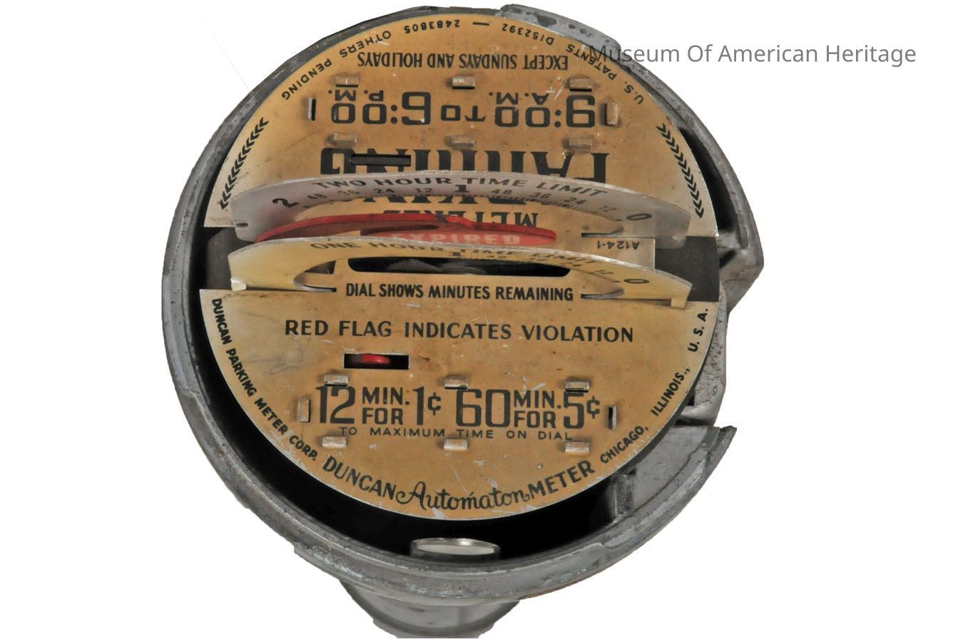 Parking meters were first installed in US cities in 1935 to increase parking turnover. The Automaton Parking Meter’s maximum time is two hours, which would have cost the driver 10 cents in 1935. This meter charges 1 cent for 12 minutes and 5 cents for 1 hour. Clockwork mechanisms cause the timer dial to turn as coins are inserted.