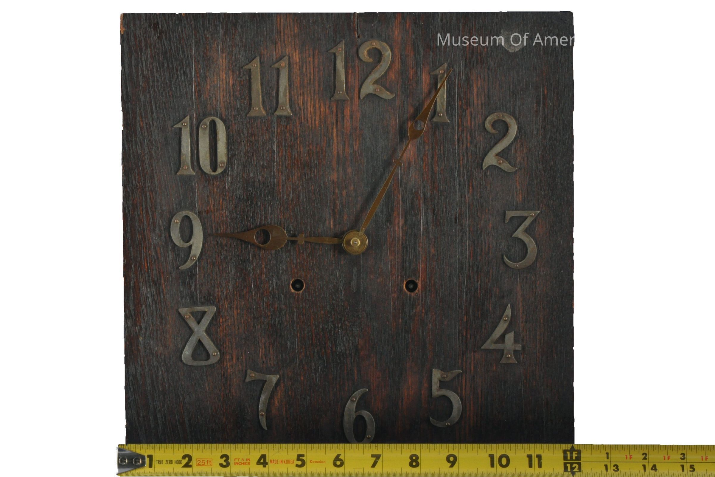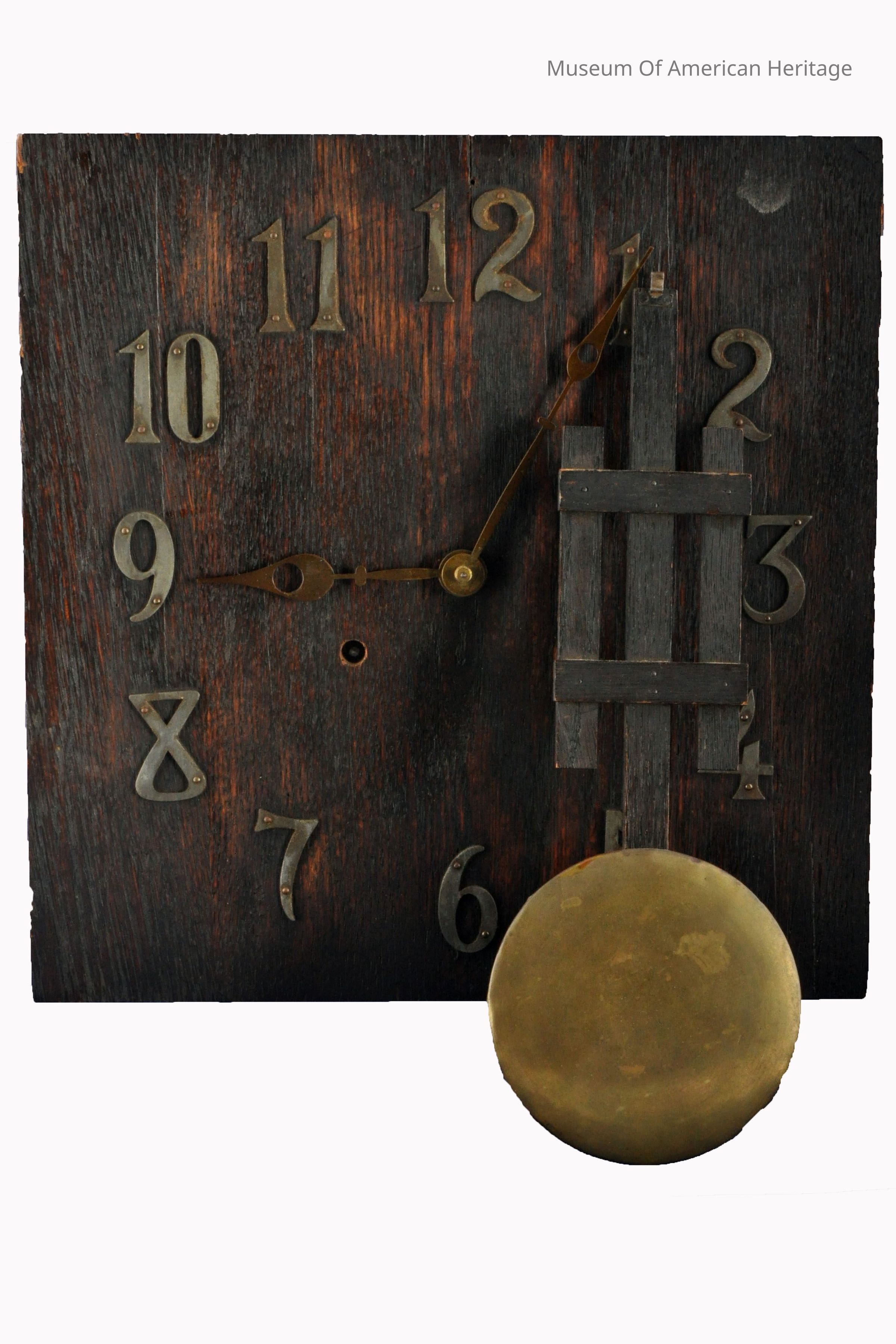 Arts & Craft style 8 day clock, time and strike, pendulum, key wound, metal numbers.