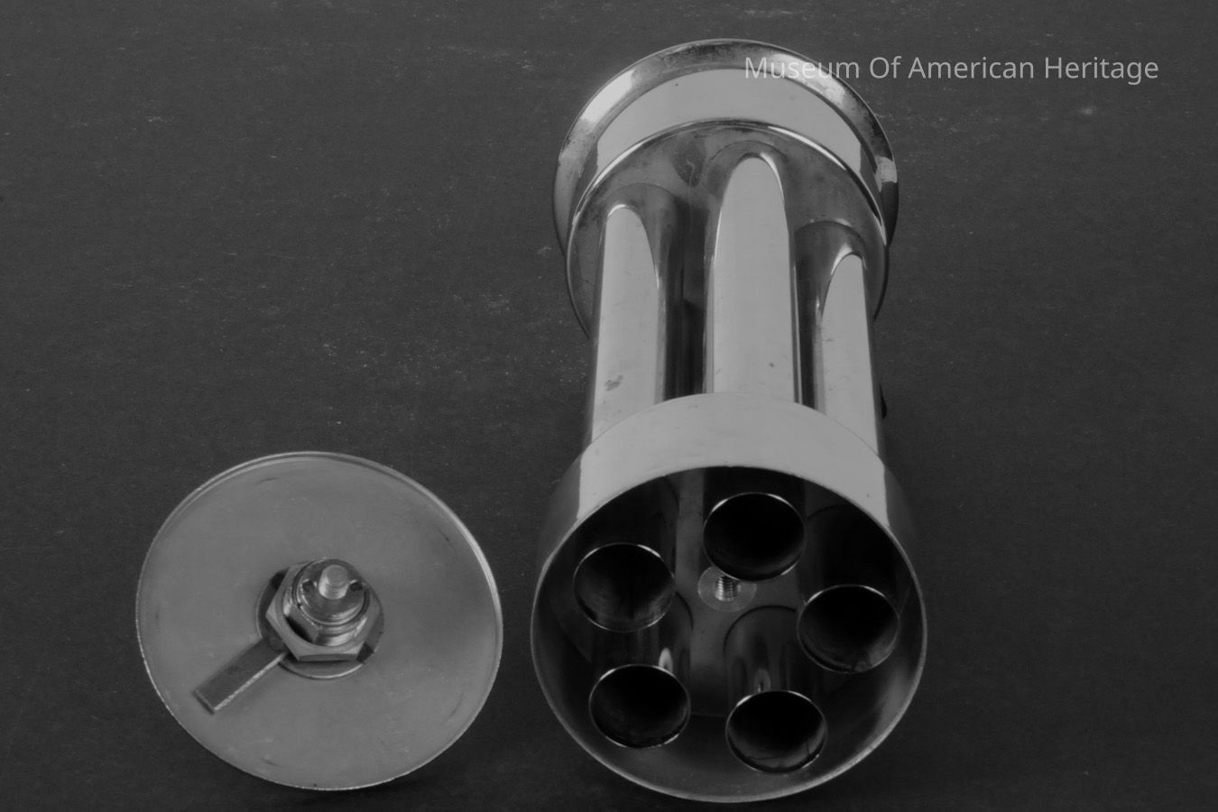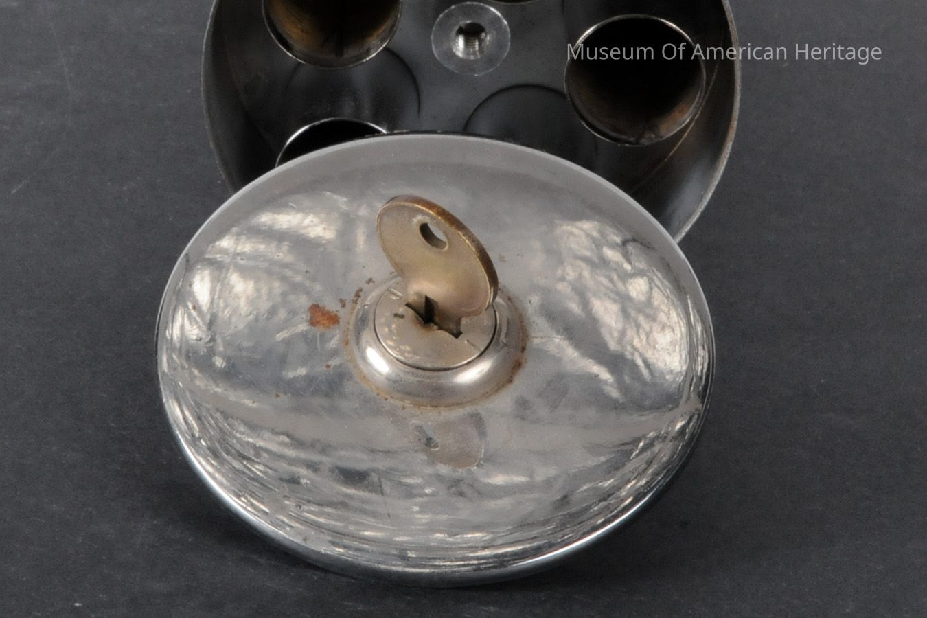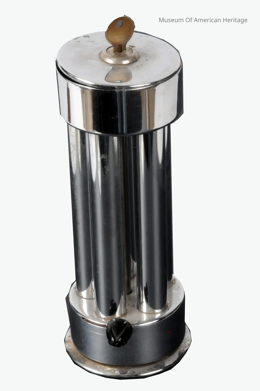 The top of this unusual coin dispenser opens with a key to allow pennies to be put in and screws back into place. A switch at the bottom dispenses five pennies simultaneously from the five internal tubes through a thin gap at the bottom of the main cylinder.General Notes