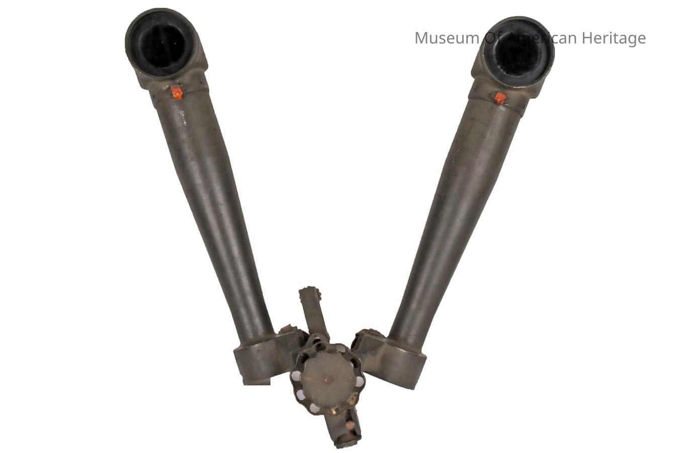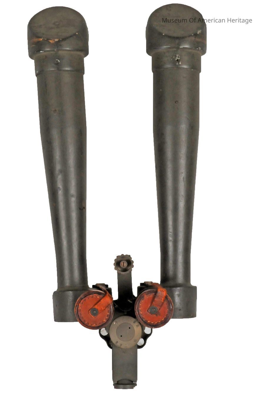 Periscope binoculars such as this Battery Commander (“B.C.”) model were used from trenches during combat in World War I to ensure safe observation and to determine distance to enemy lines. The binoculars were mounted on a tripod and the lenses were positioned just over the trench parapet, thus providing the operator protection from snipers and other enemy fire while ensuring stable, magnified vision. The olive drab green color suggests that the binoculars were made specifically for the U.S. Army.