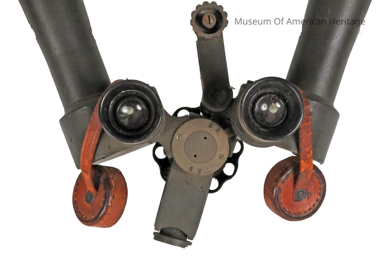 Periscope technology—perhaps familiar to most of us through its use in submarines—works in binoculars through connection of a pair of cylindrical telescopes. Each end of both telescopes has mirrors or prisms set at a 45-degree angle and parallel to each other. As with other binoculars, the soldier would look through the two eyepieces and adjust the focus in each periscope as necessary. The B.C.’s telescopes are 17.5 inches long and could be positioned up to 180 degrees apart (thus contributing to the model’s informal nickname, “rabbit ears”) to improve the perception of objects as being three-dimensional.