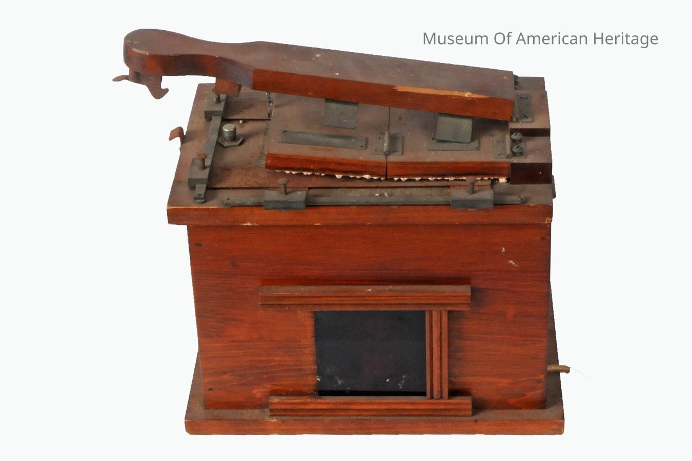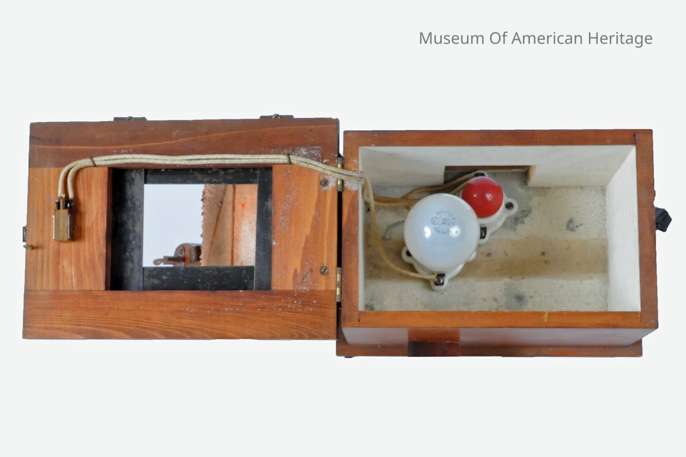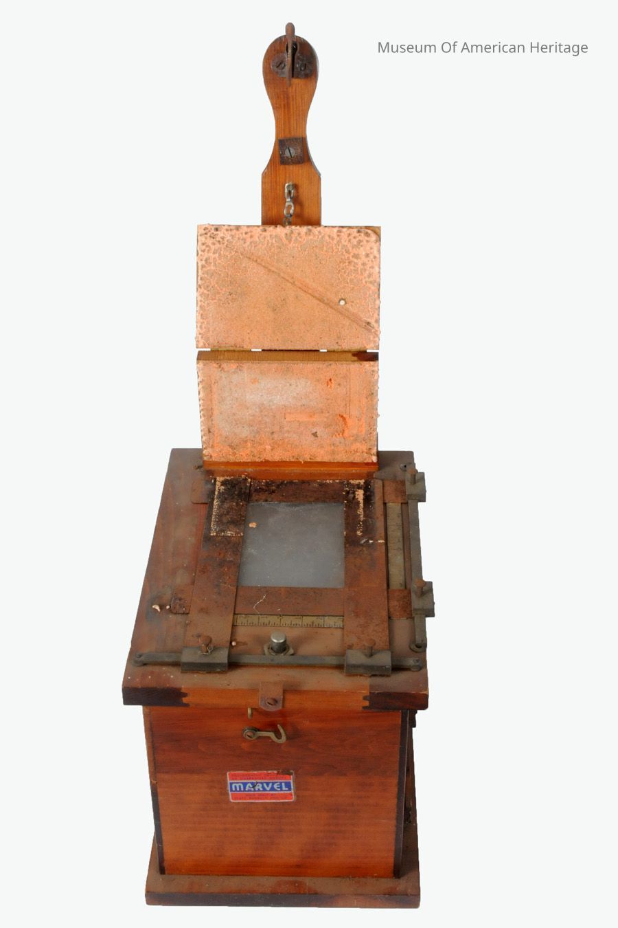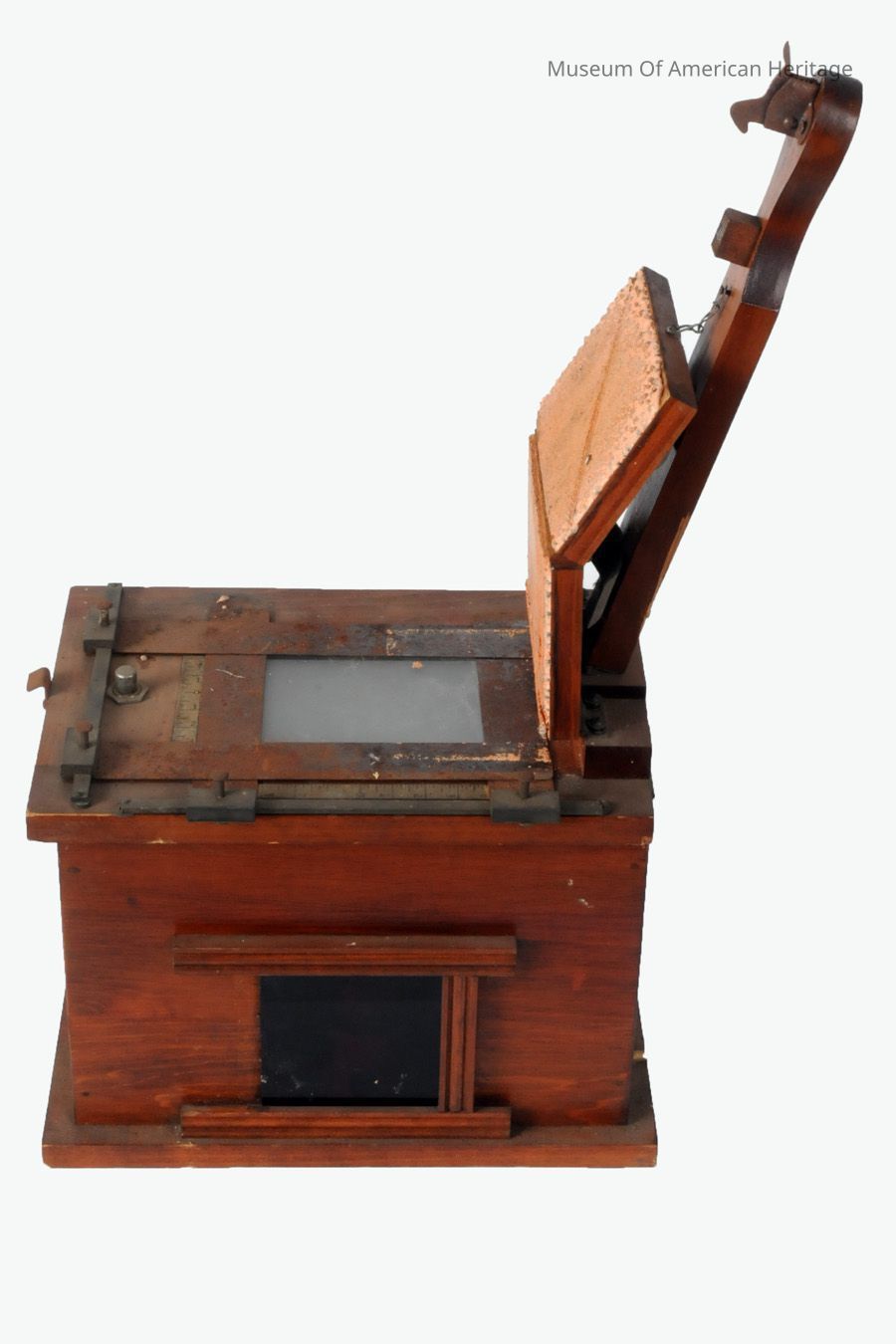 Sold at Sears, the negative is placed on the glass and a slow developing contact paper sheet is placed on top, the interior lamp copies the image to the paper.