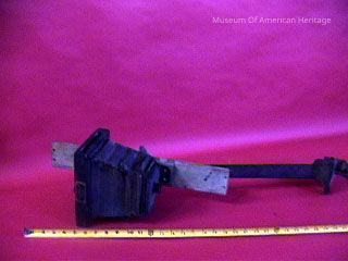 Lens, film holder, no base (table clamp on), paper bellows, wood film holder.