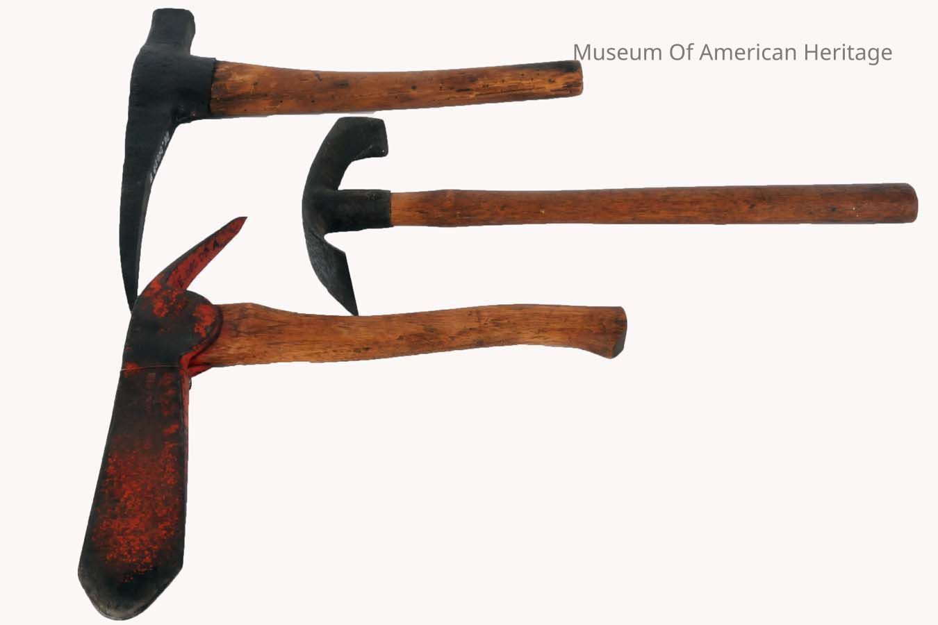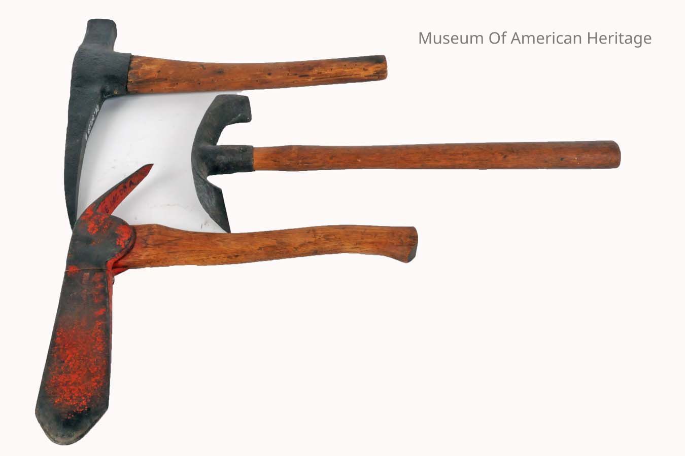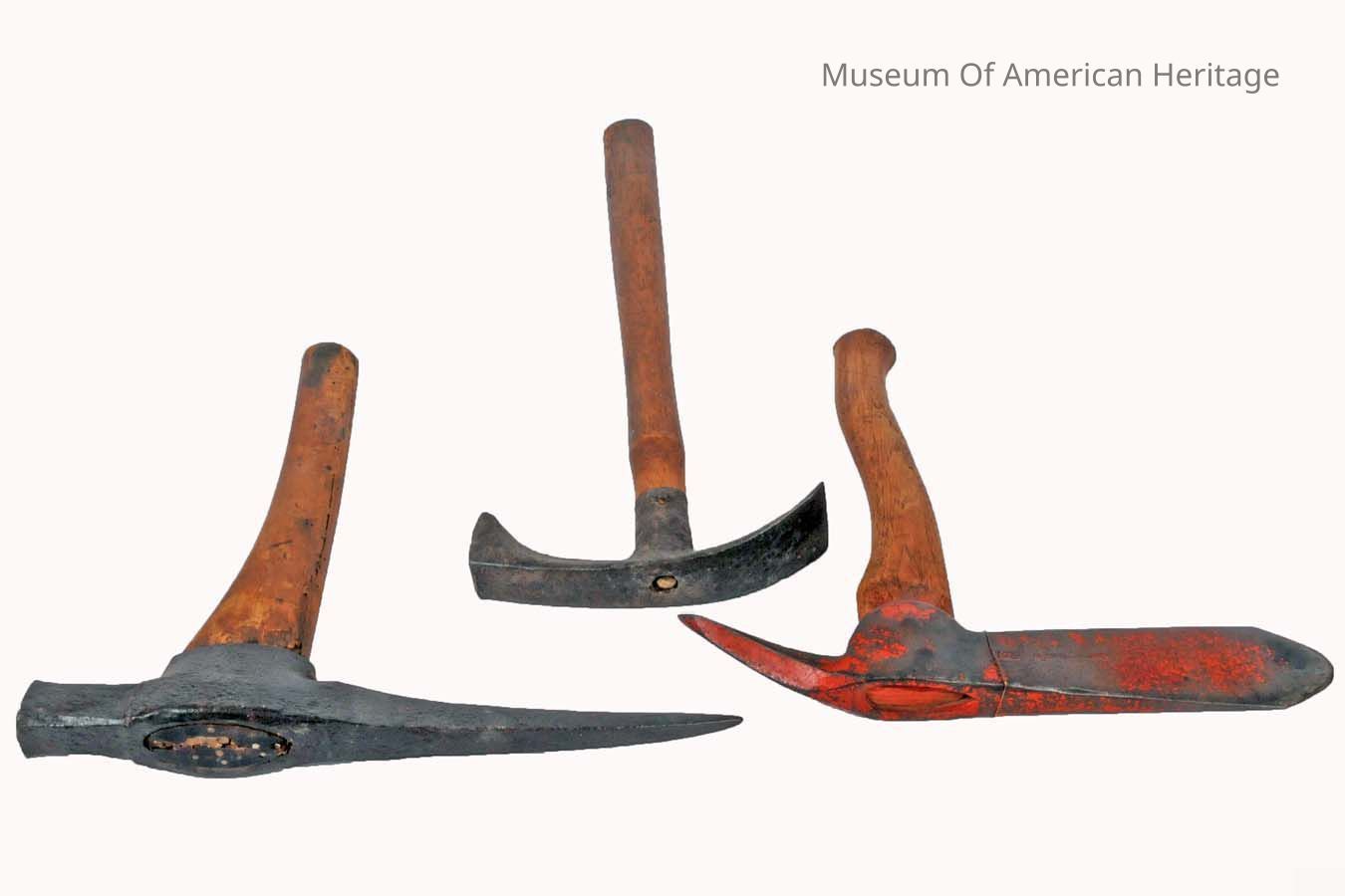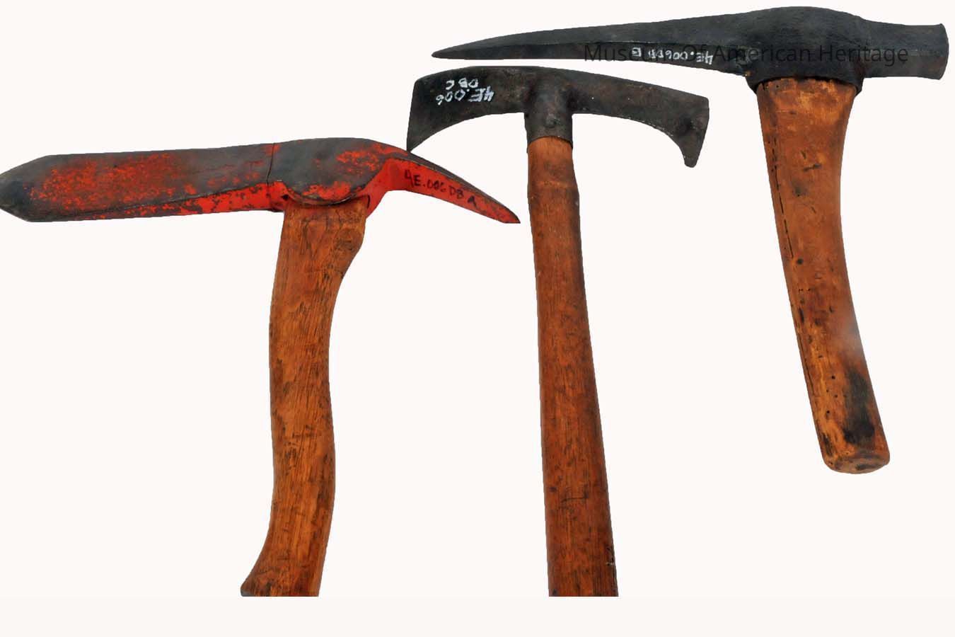 A: Ice fishing Pickaxe, Gifford Model 615, 13.5"x13.5" B: Pickaxe, Mining(?), 1.5"x14"x14" C: Cooper s Adze, 1.5"x8"x18"