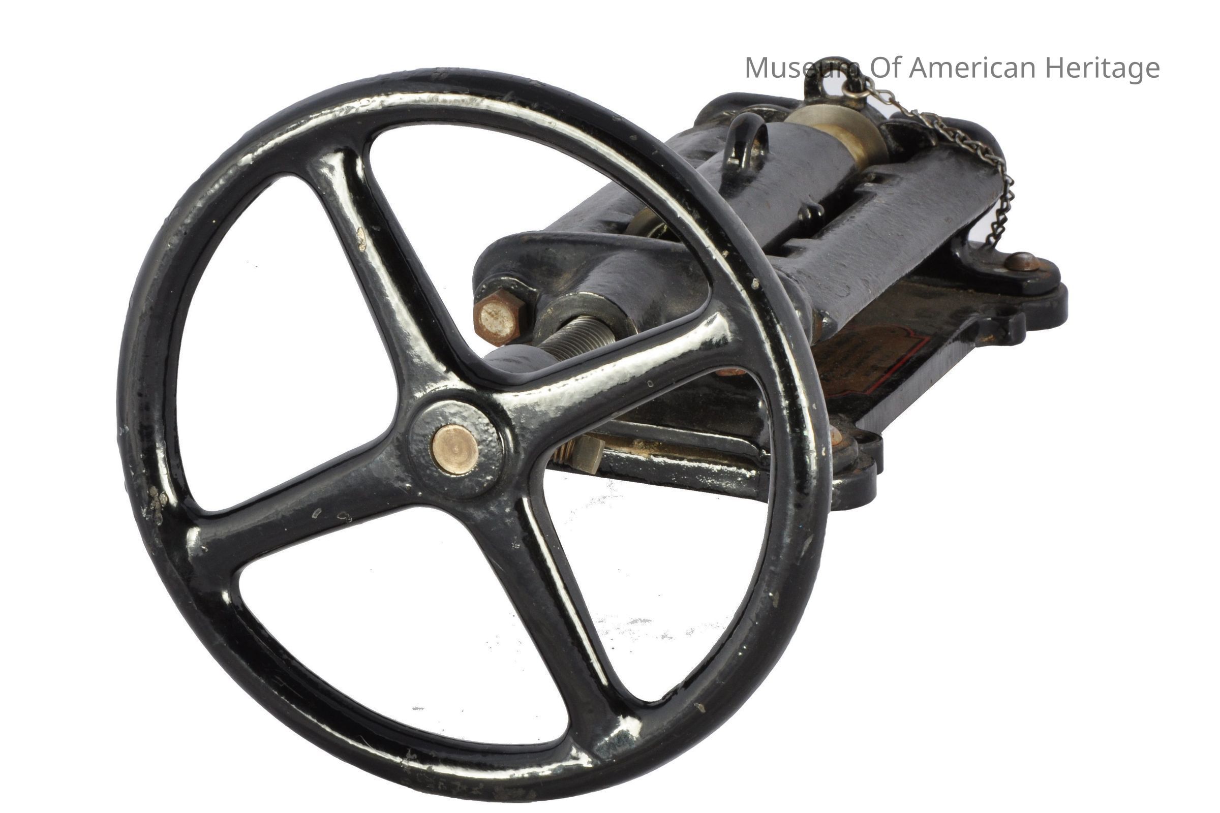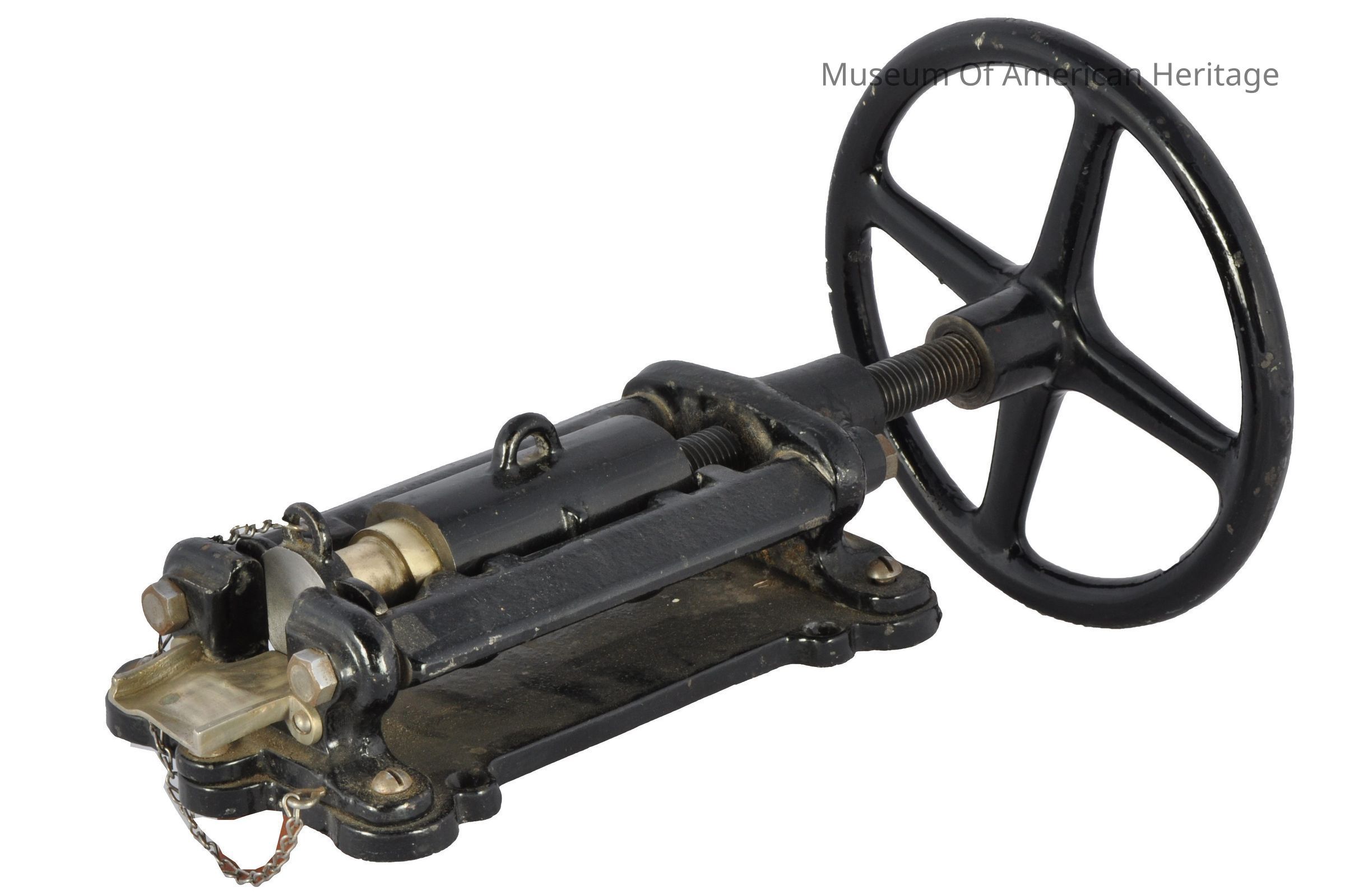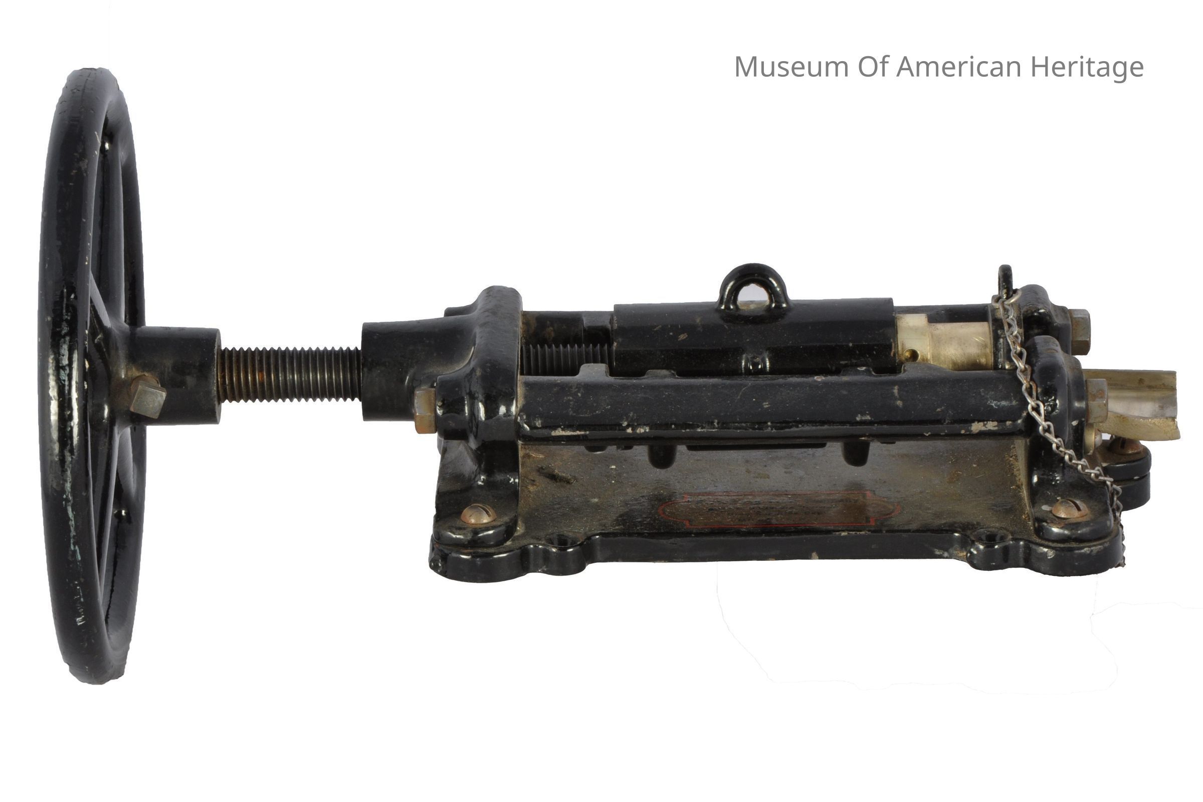 Glass Enclosure Division Drug Sundries Dept., hand operated, wheel driven screw press, 3-pill capacity.