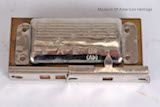 Engraved silver panels on pipe. Slider on one end is used to select the pitch. Intended to aid in tuning a banjo. In original Red box.