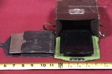 In brown leather case, 3 Contessa plates, 1 Wirgin plate.