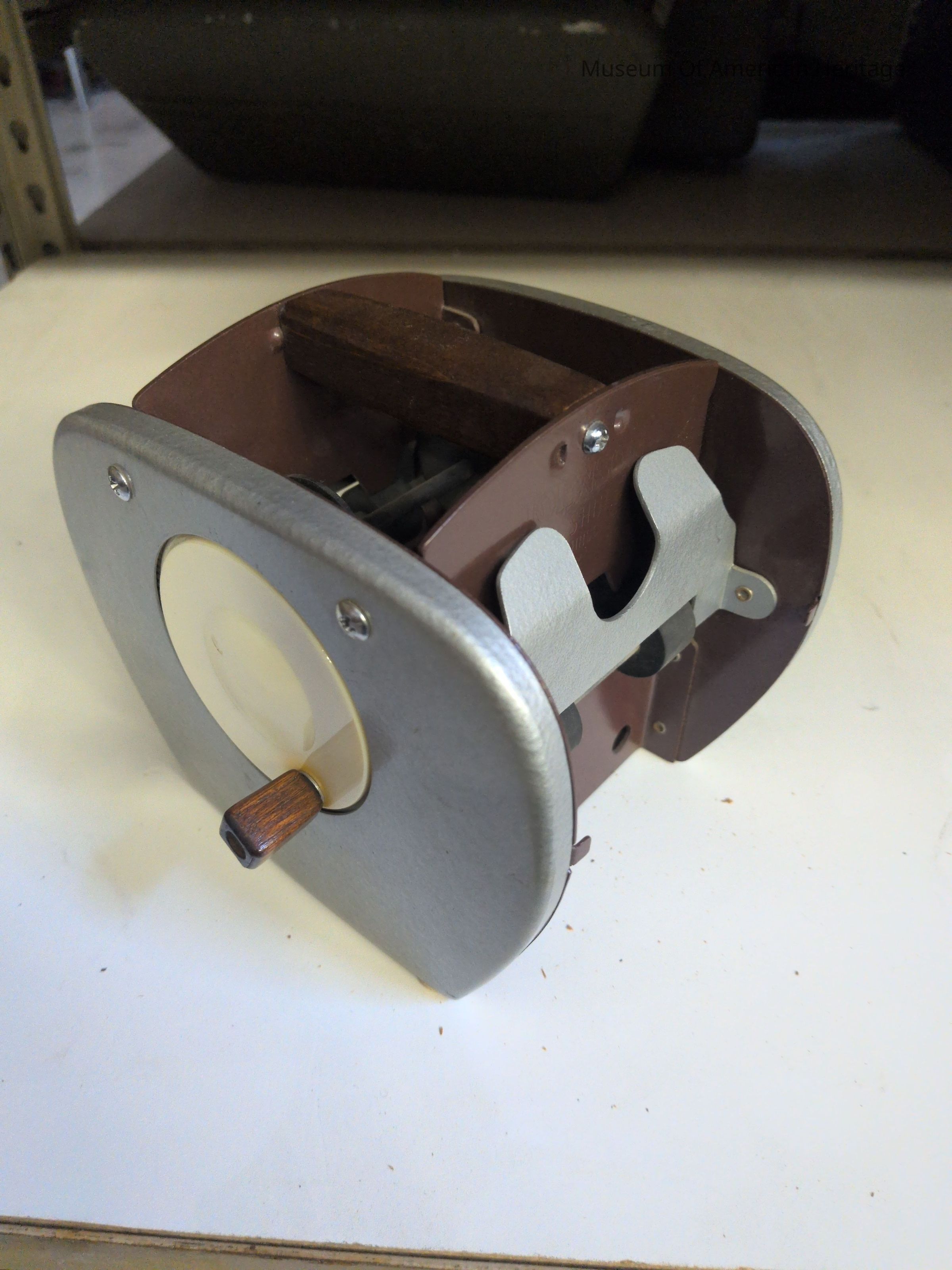Wood handle, crank operated.