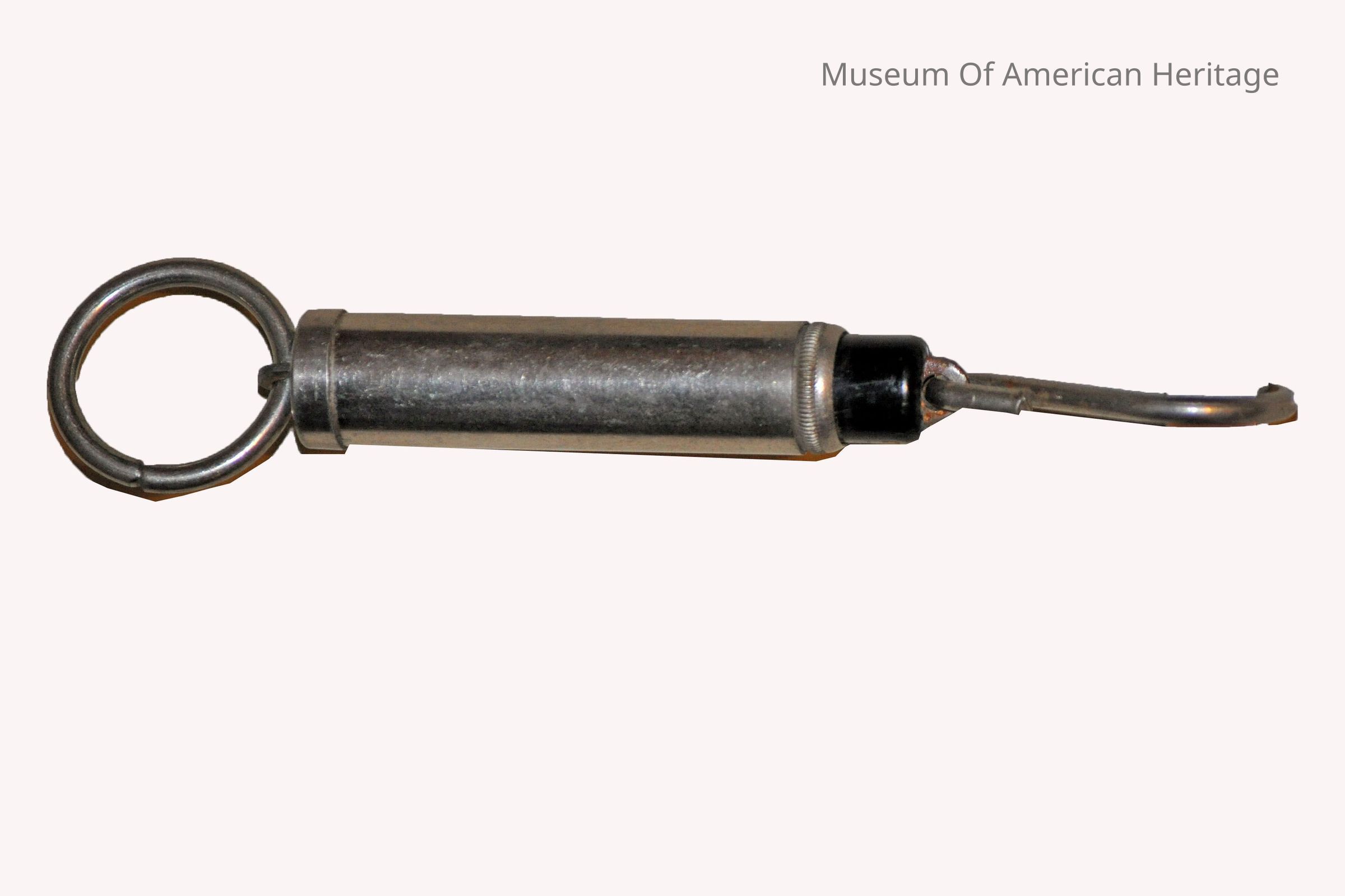 Ring to hold by on top, hook to attach to on bottom, 0 to 15 lb. scale on black post.