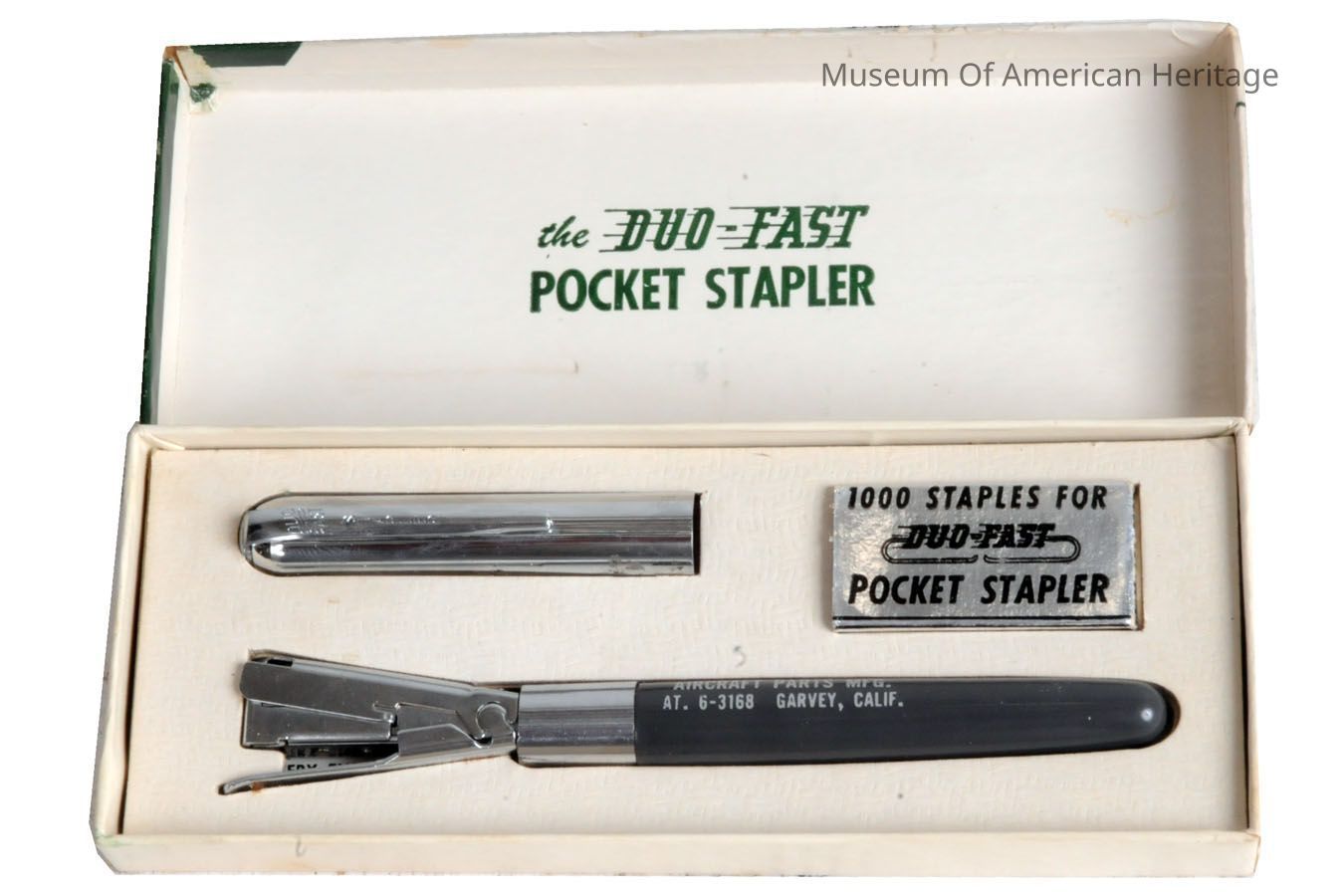 In Original Box. Stapler that looks like a pen. Marketing for O.A. Phillips aircraft parts manufacturer. Patent 2599998.