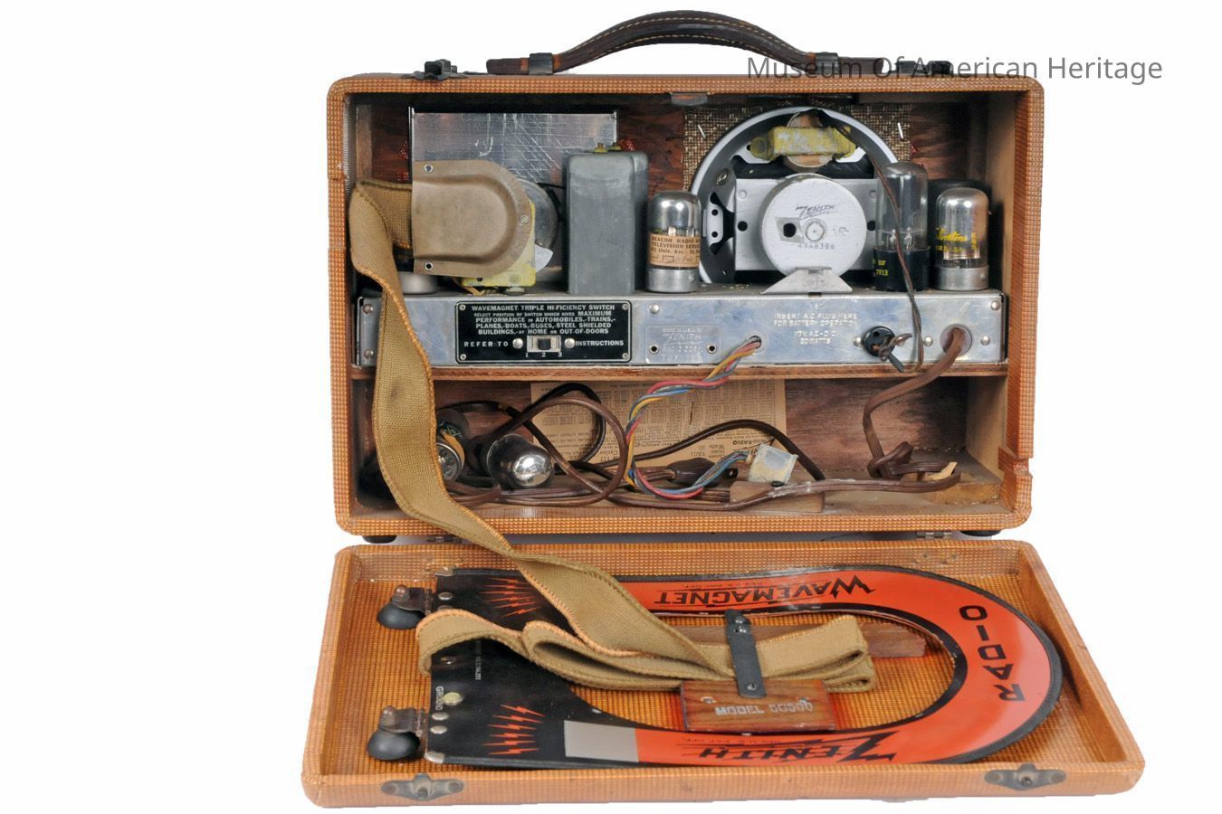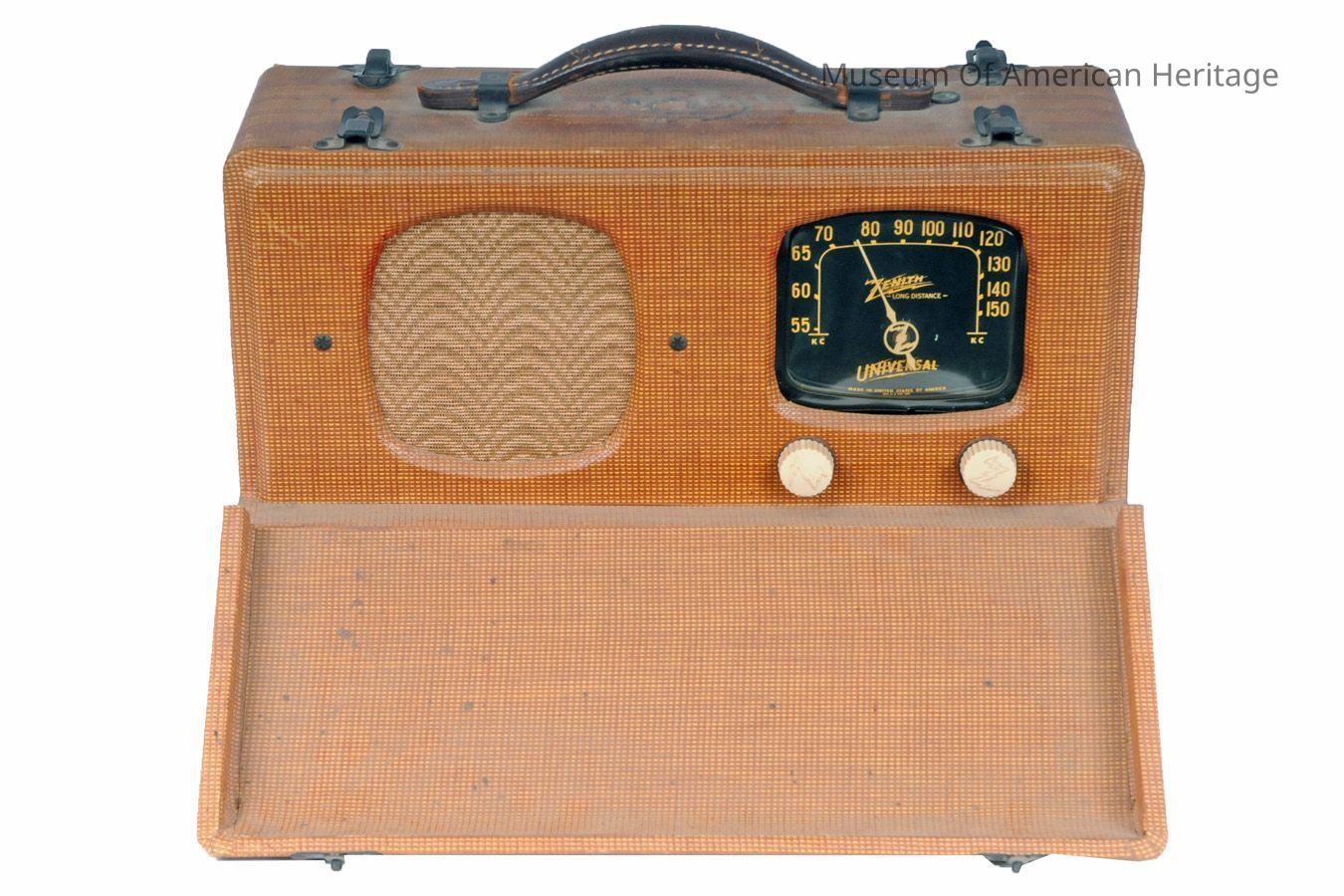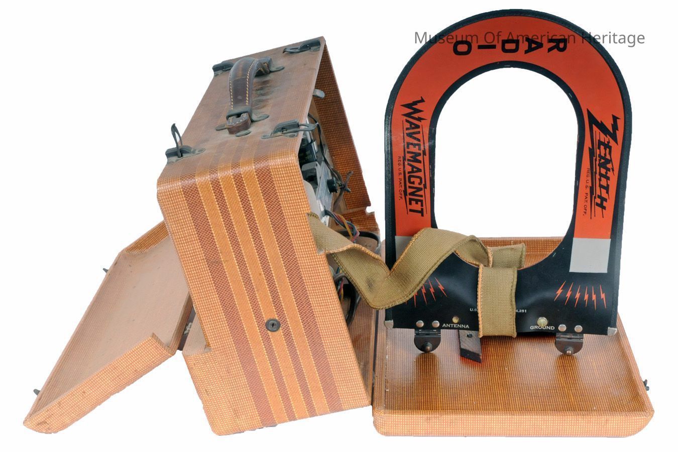 Battery portable radio, tube models produced until 1963. "Known as the Royalty of Radios." U.S. Patent no. 2164251. 110 Volt AC or DC. Works in train, airplane, bus, ships.