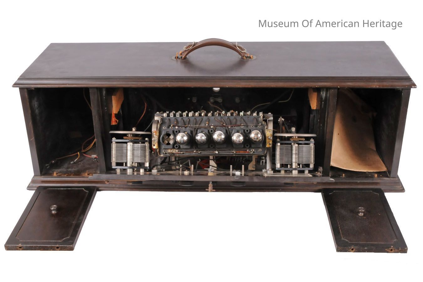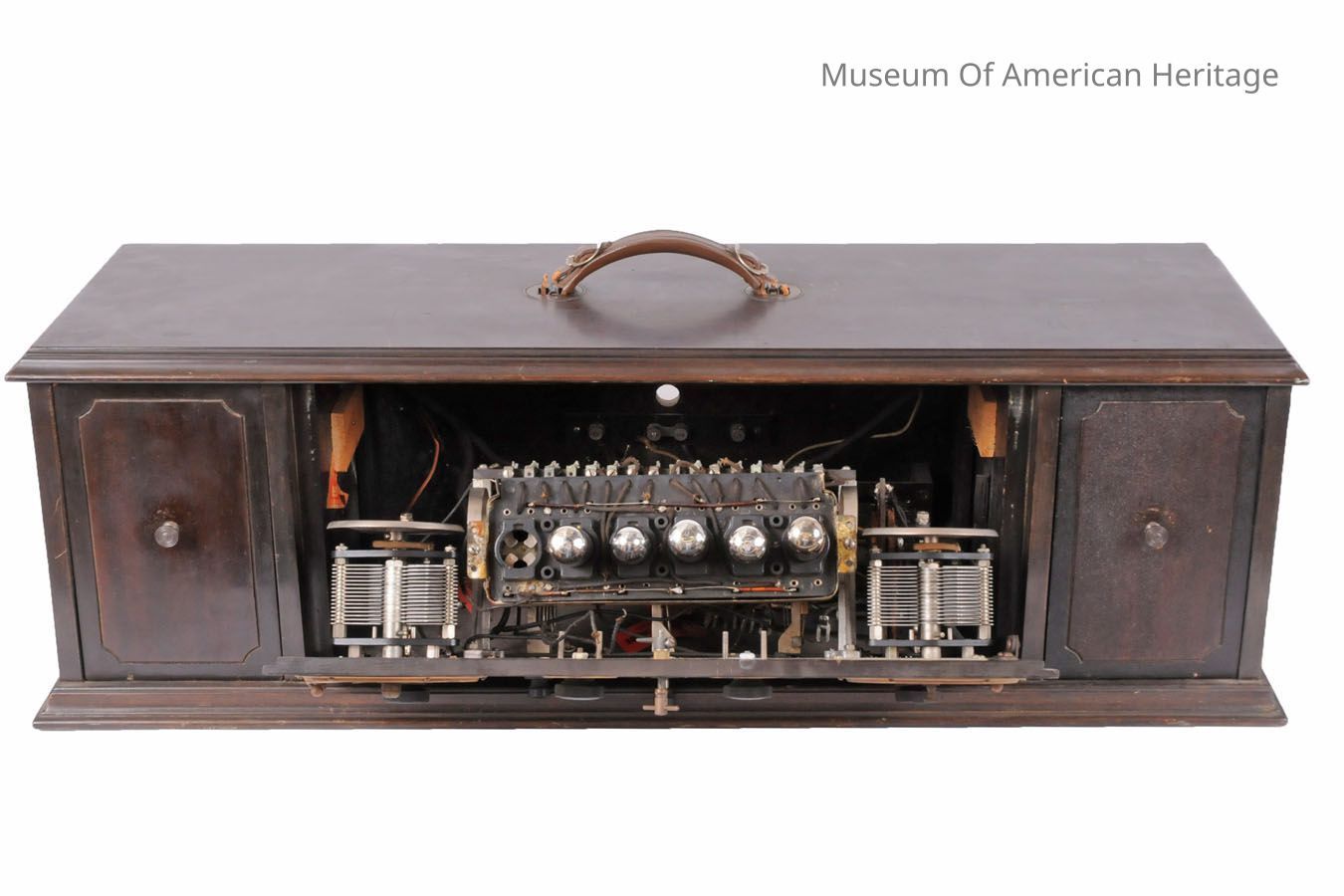 Leather handle for portability, battery powered. Dials for station selection, battery control, and volume control. Uses horn-type speaker like 6F.264.