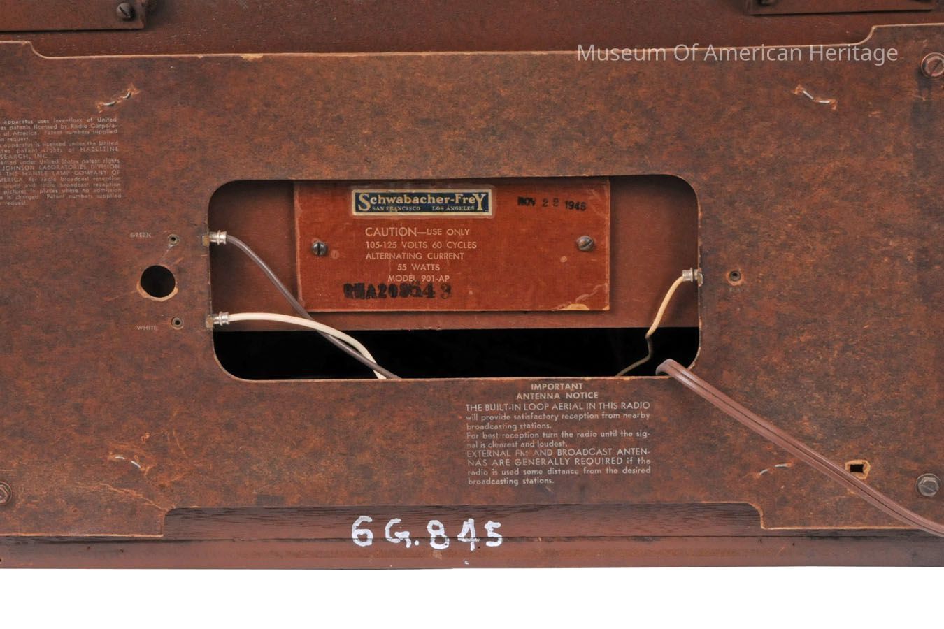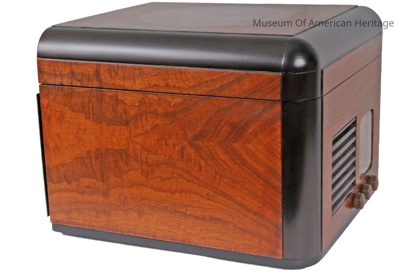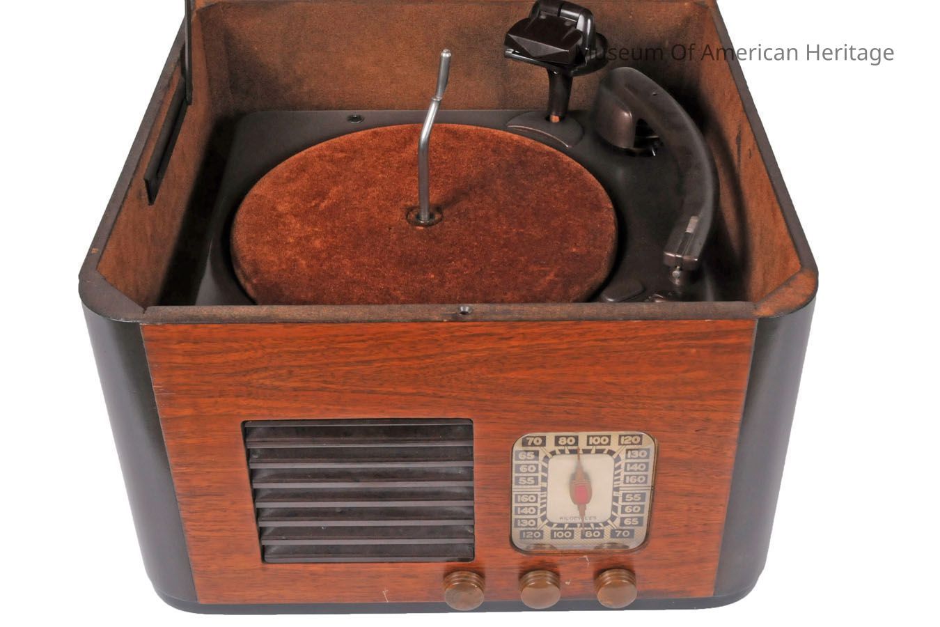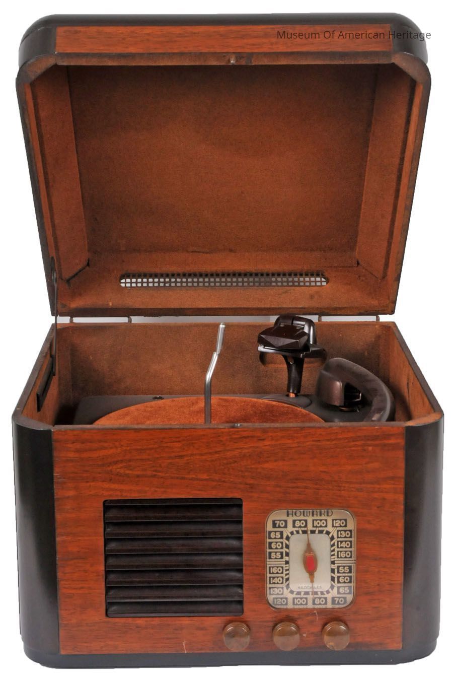 This fusion of a radio and a phonograph stands as a prime illustration of post-war consumer electronics, marking a transition from wartime manufacturing to peacetime production within the industry. Crafted by the renowned Howard Radio Company of Chicago and recognized for its excellence and forward thinking, this model epitomized the period's movement toward consolidating entertainment technologies into compact tabletop units. Positioned on the front case, from left to right, are three knobs: the phono-radio switch, the volume control on-off switch and the radio tuning control.