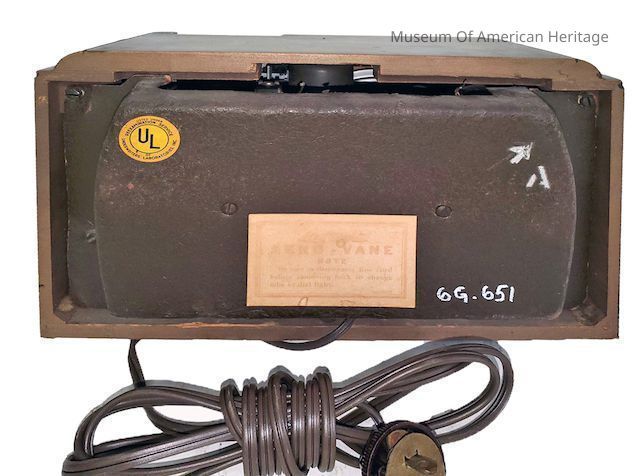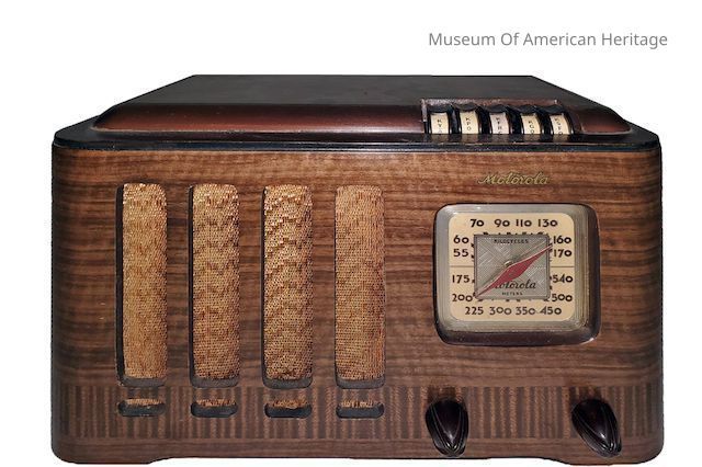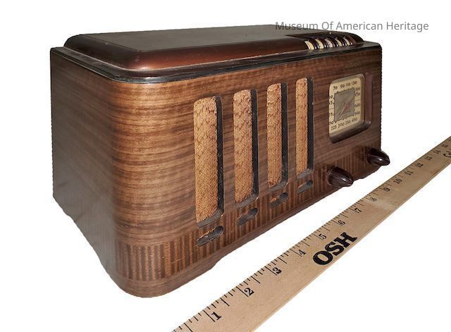 Rectangular buttons on top w call letters, frequency and wavelength both listed on dial.