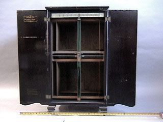 Record Selector, wood cabinet, double doors, roller wheels, holds 55 double sided records for 110 tunes.