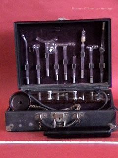 Popular in the first half of the 20th century, violet ray machines used high-voltage, high-frequency, low-current electricity for supposed electrotherapy. The machines generated a violet glow from a gas-filled glass electrode and a small amount of ozone. Manufacturers claimed that these machines could cure all manner of human ailments, including hysteria, arthritis, gout, hemorrhoids, brain fog, gray hair, tooth ache, and wrinkles.