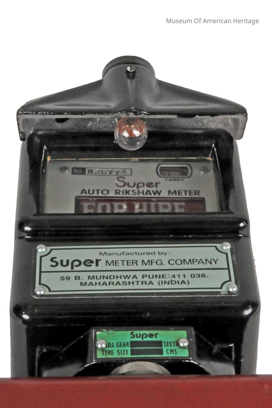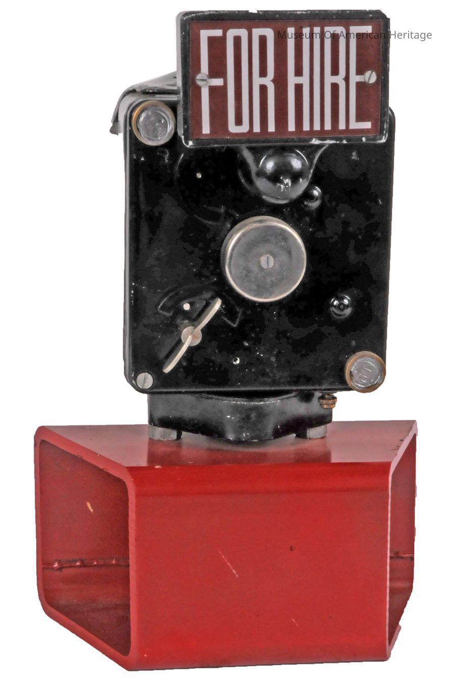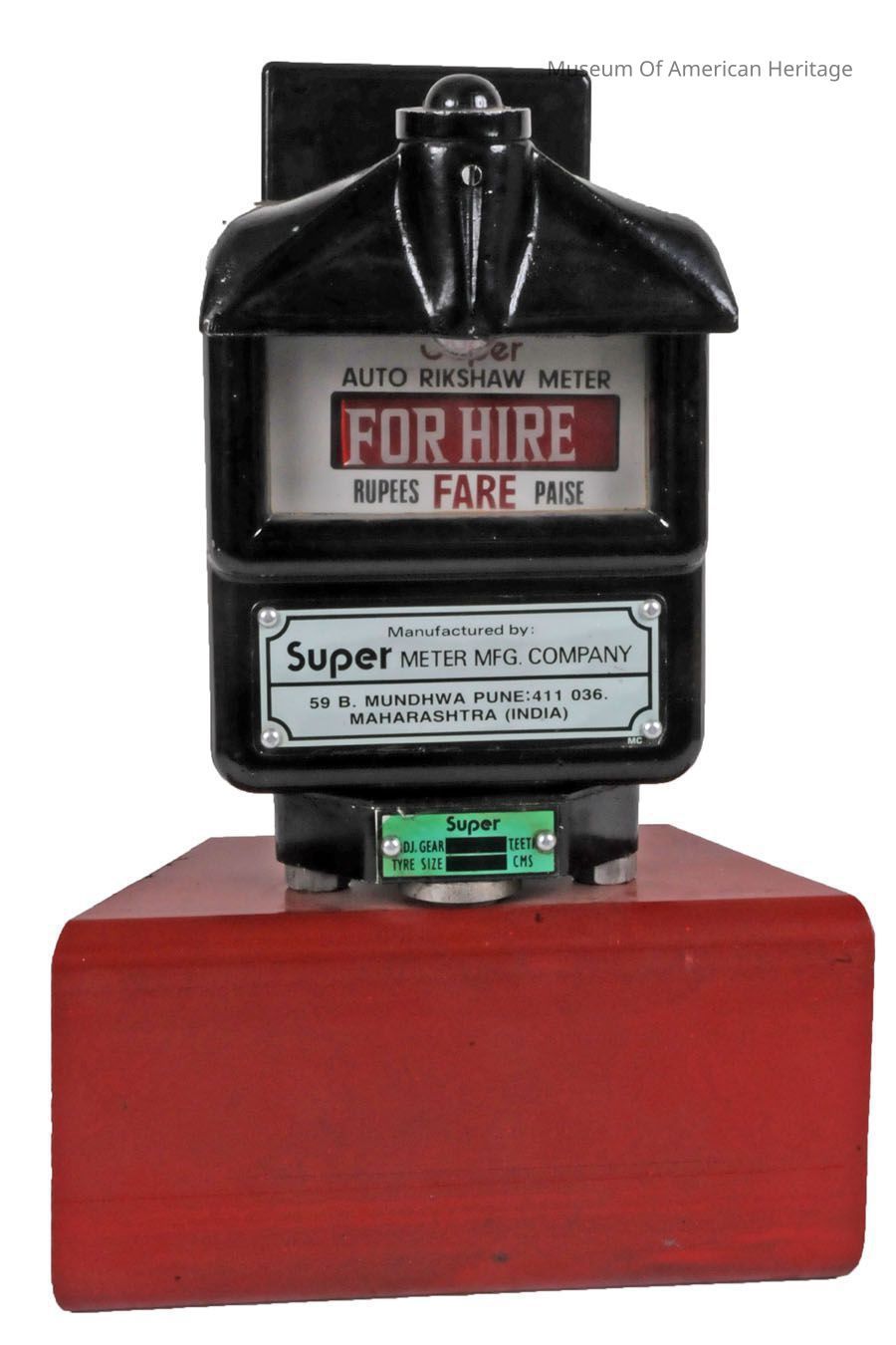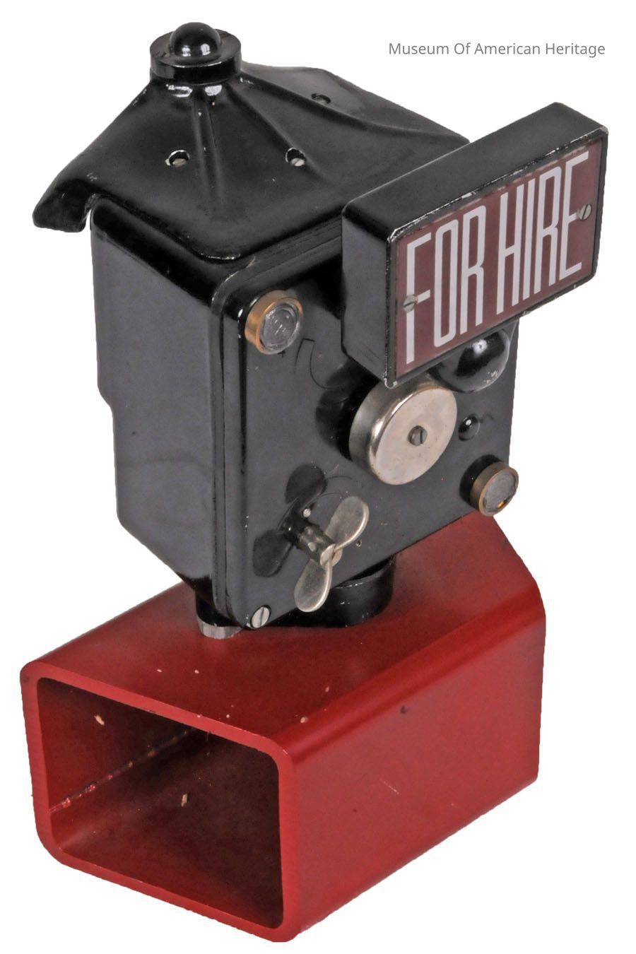 This fare meter uses an internal hand would spring. When the “For Hire” sign is rotated down, the display changes from For Hire to the current cost of the trip (based on the time elapsed). The fare is displayed in Rupees. In third world countries, the scarcity of batteries makes this design still applicable. The Super Meter company is still in business building and selling this model (as well as more modern) fare meters.