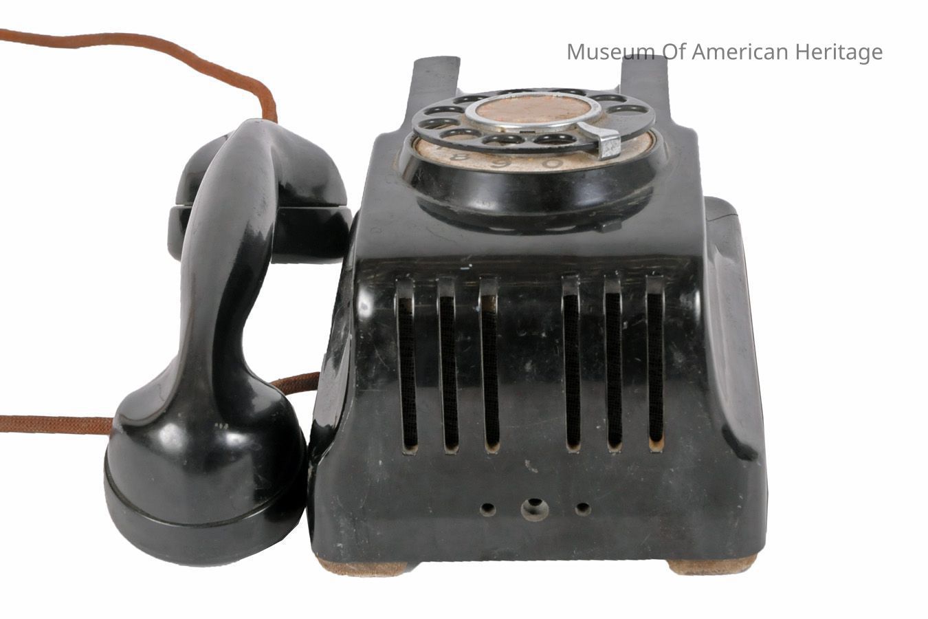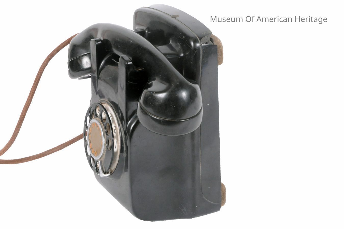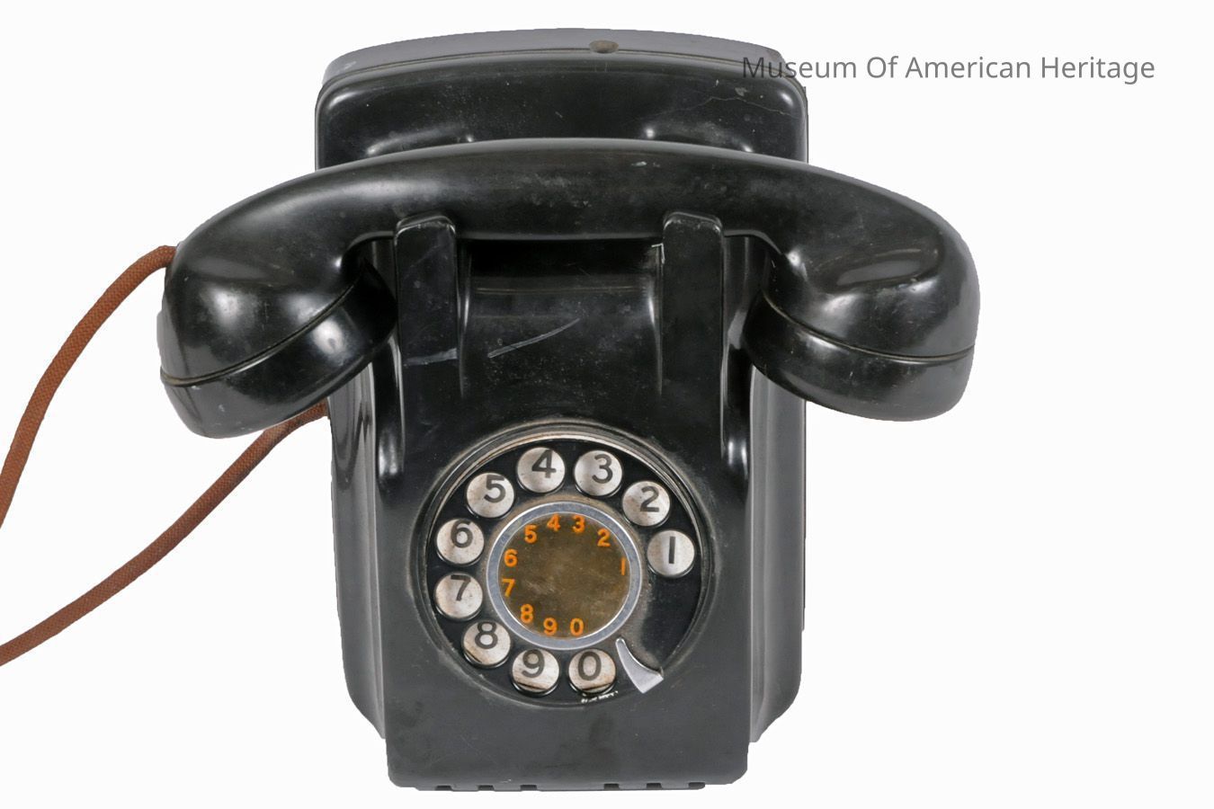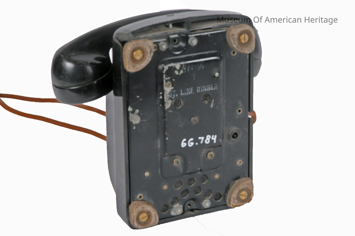 This black bakelite phone was designed to hang on a wall with the handset cradled on top of the body of the phone. It features an internal ringer as opposed to the external ringer found on older phones.