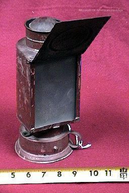 Kerosene fueled, red safelight filter (broken), made of sheet metal.
