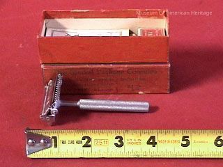 Safety razor, instruction leaflet, in red box.