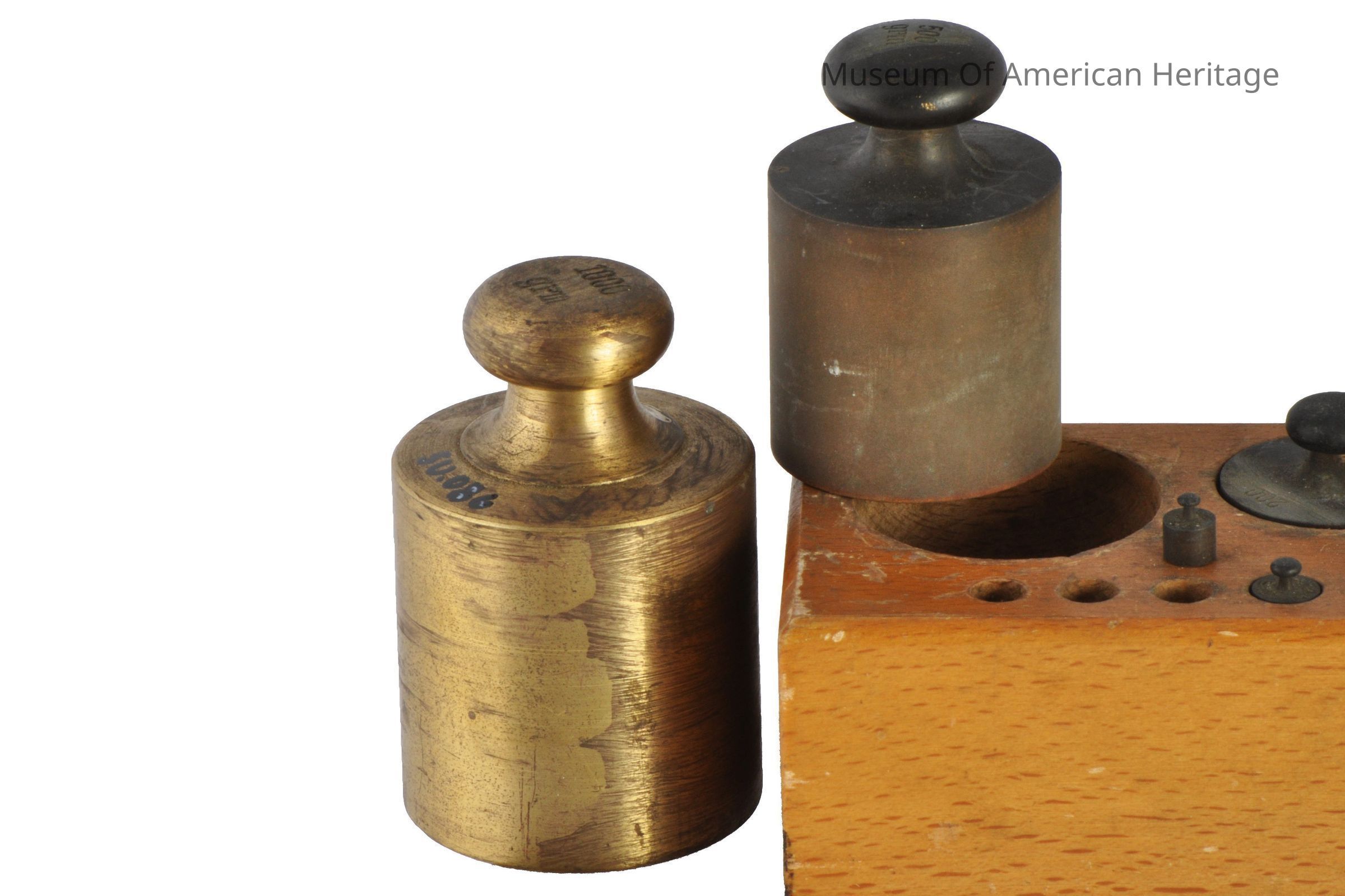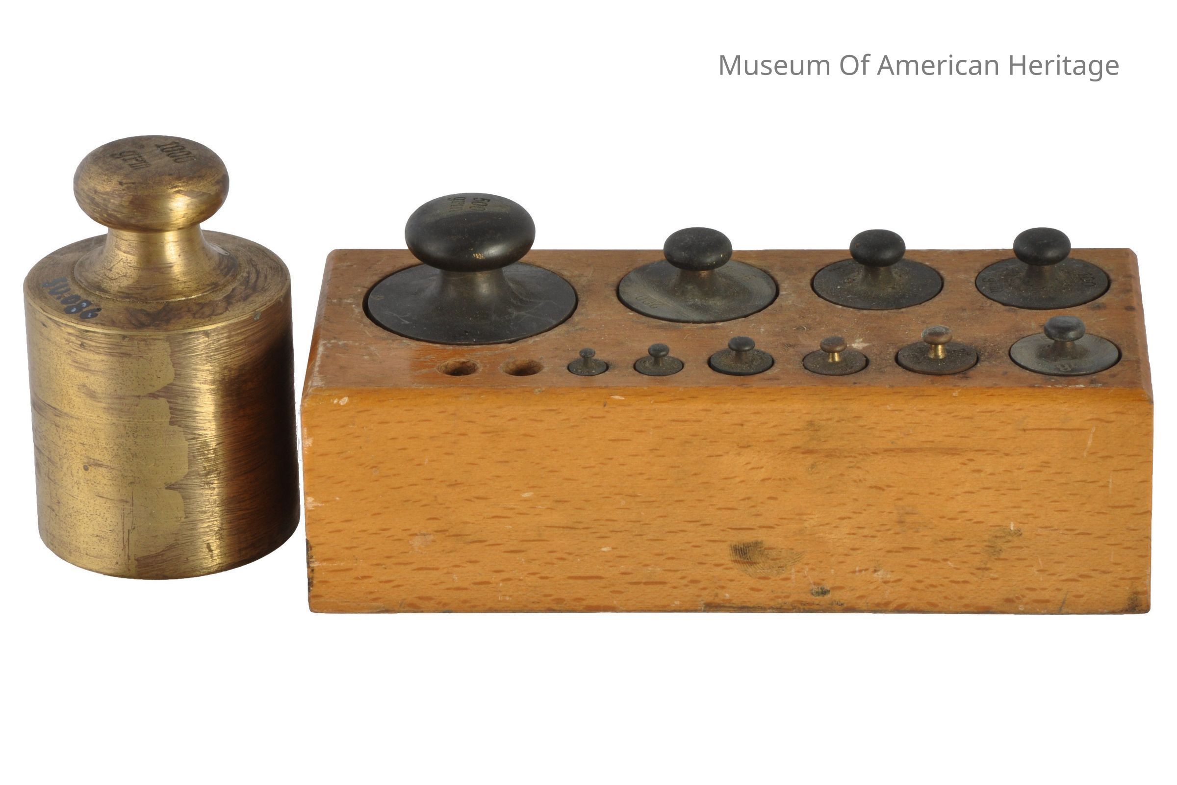 Gram weights, in fitted wood box, set of 12 (2 smallest missing) Plus one large weight, largest 500 grams.