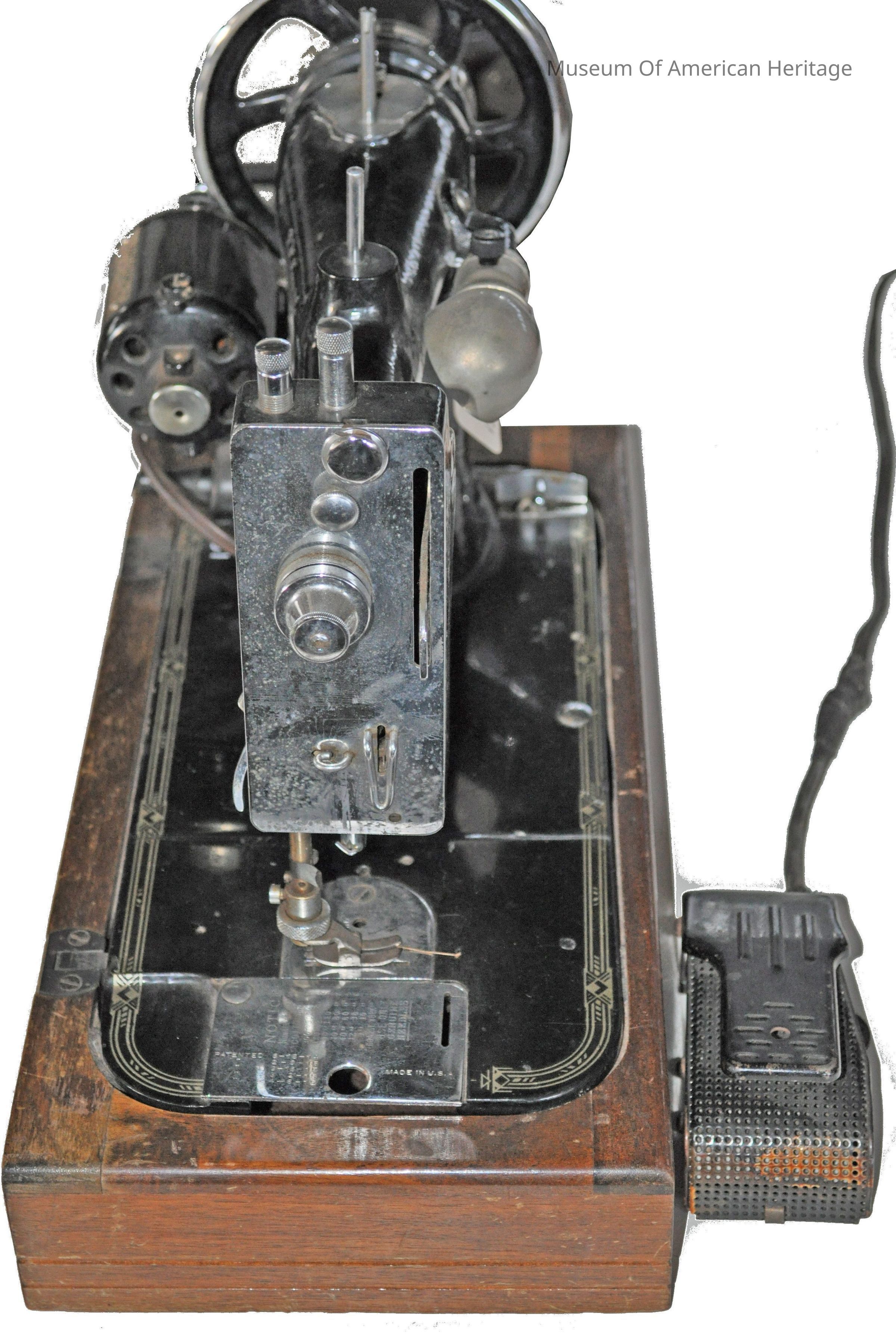 Made by Nat l Sewing Machine Co. for R.H. Macy & Co., electric, foot pedal, table model, wood base, wood cover, light, cord.