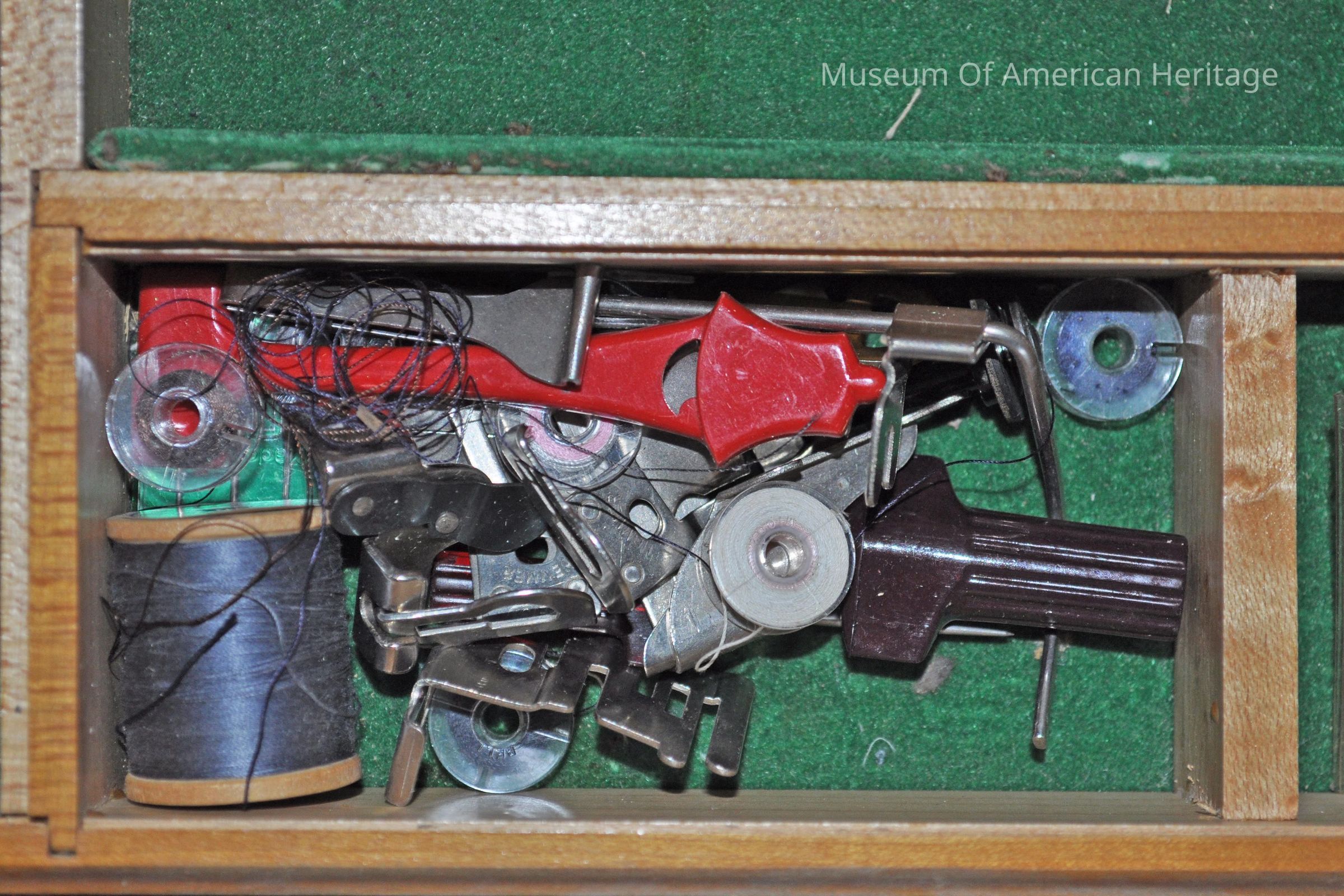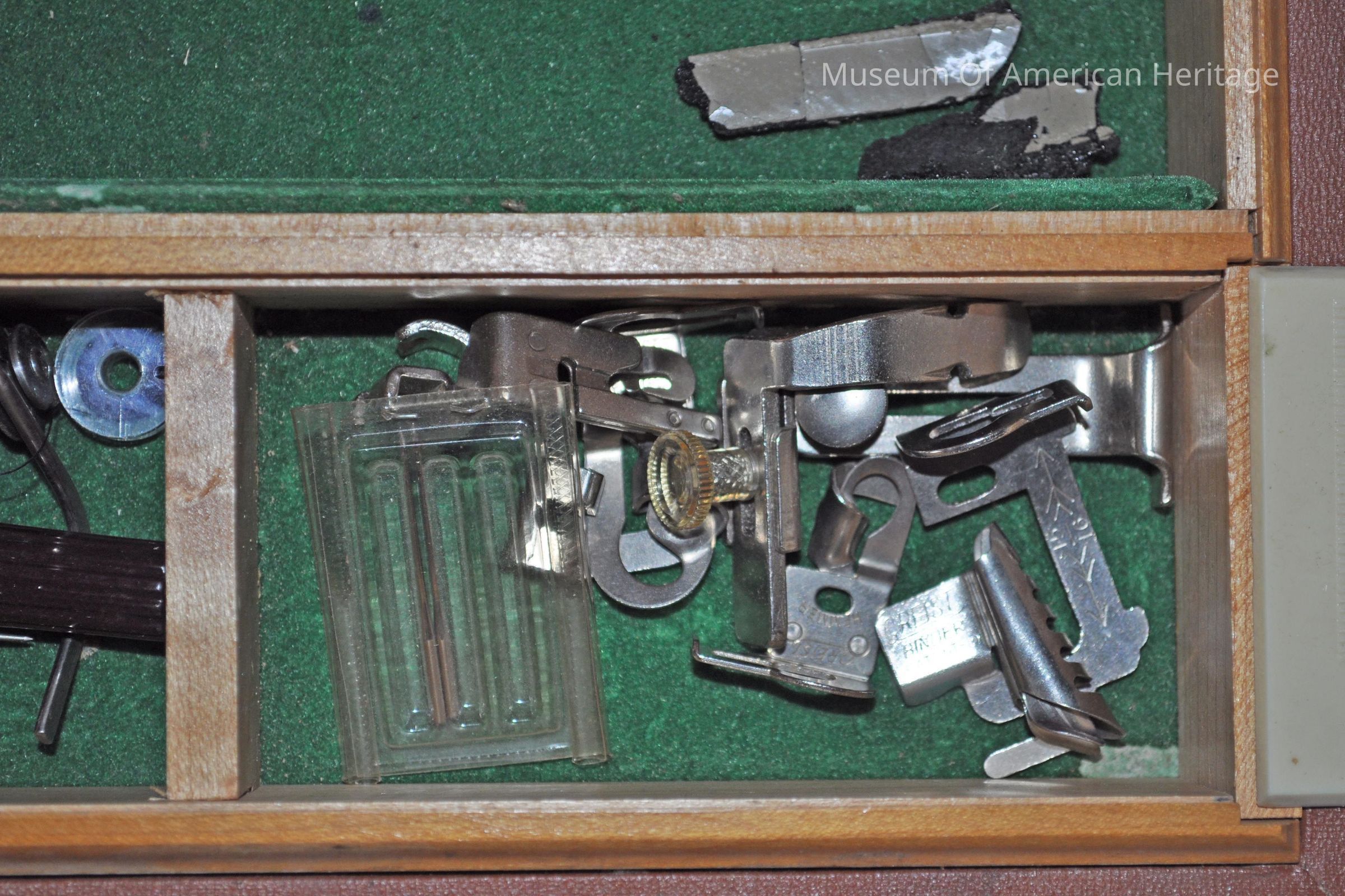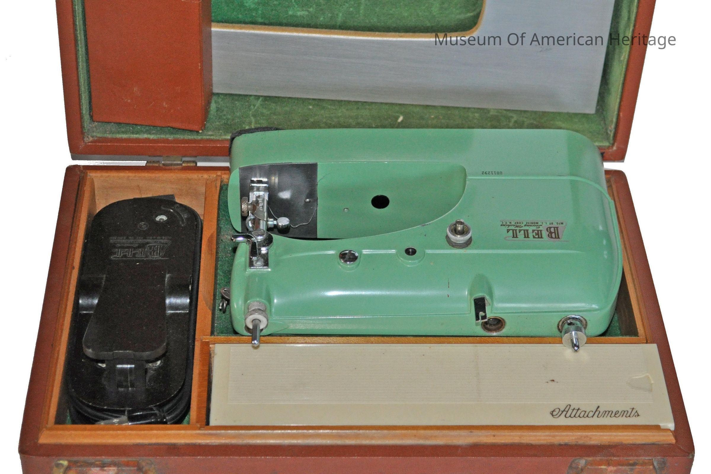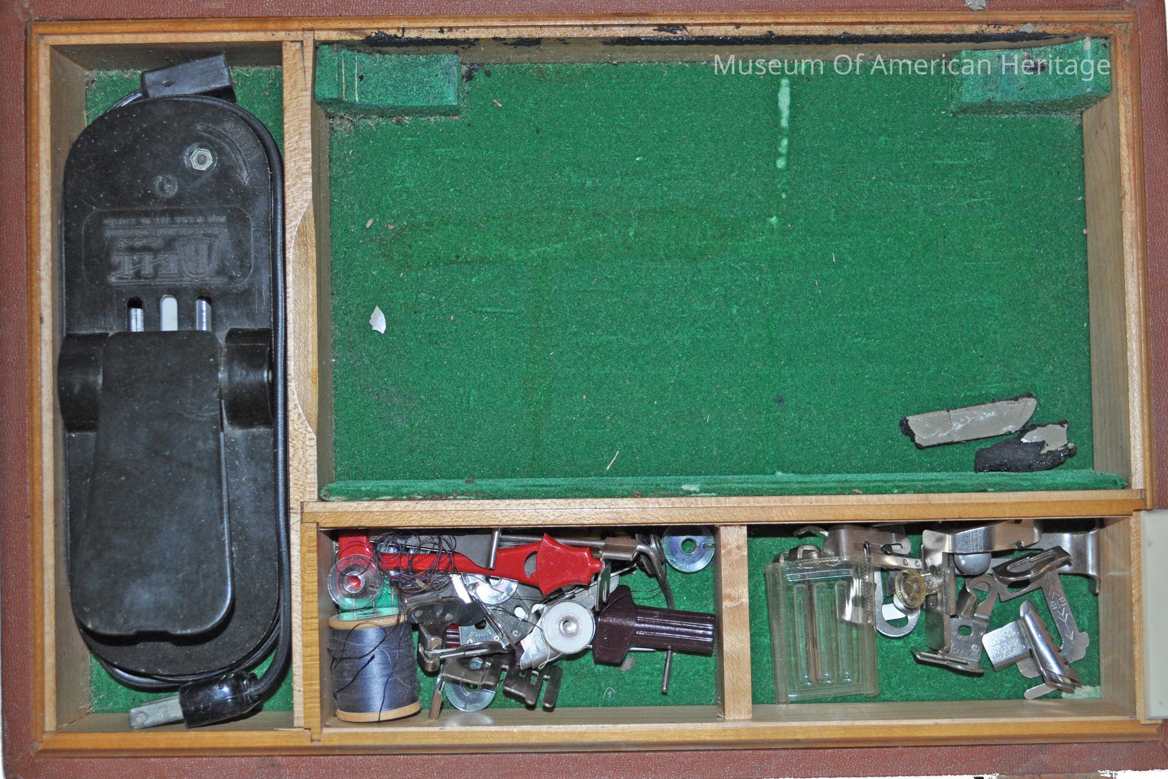 Portable sewing machine, foot pedal, attachments, carrying case.
