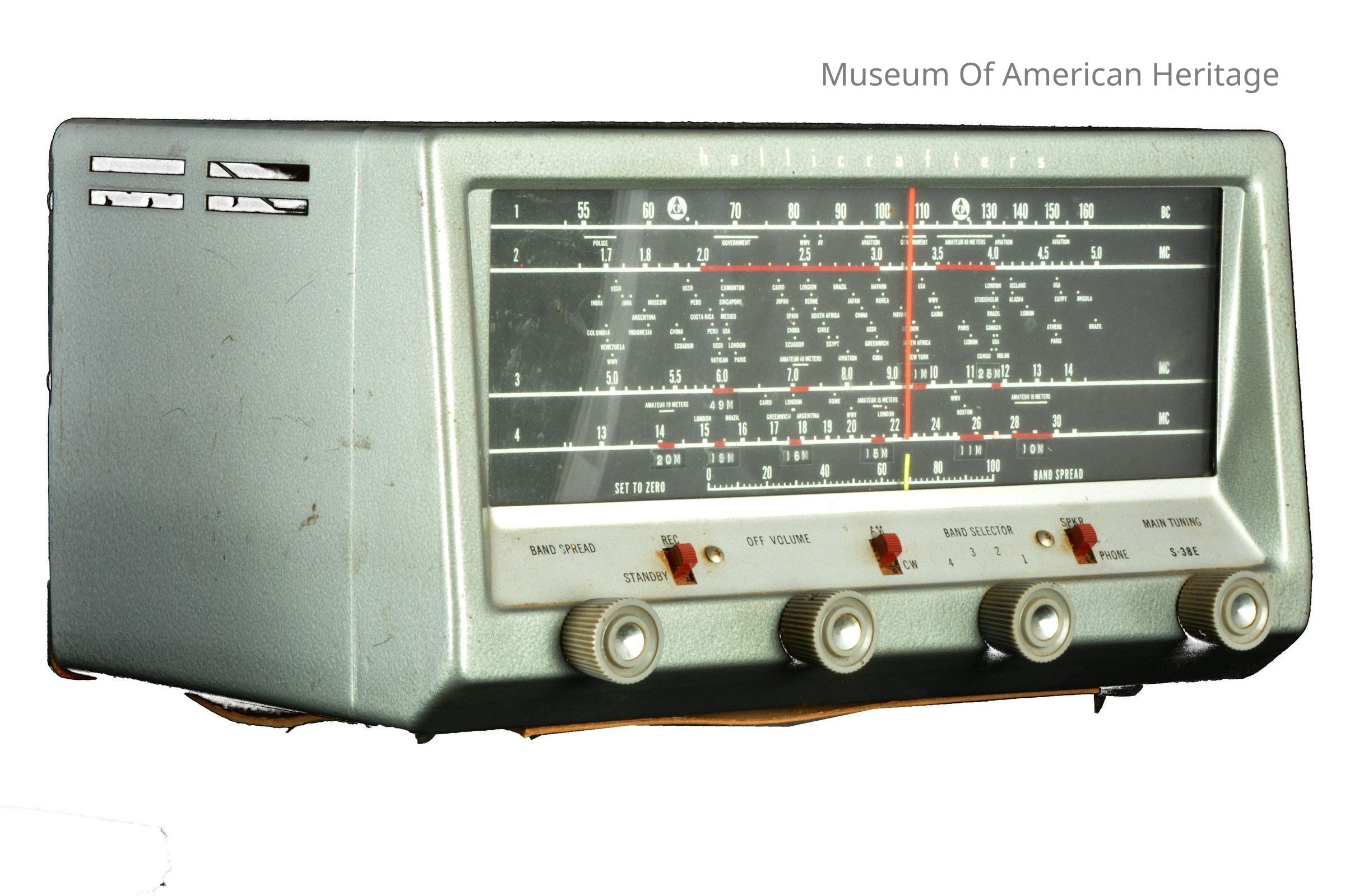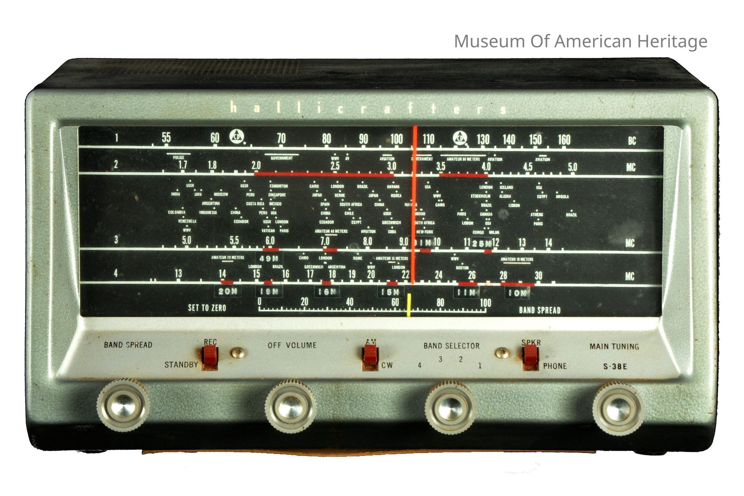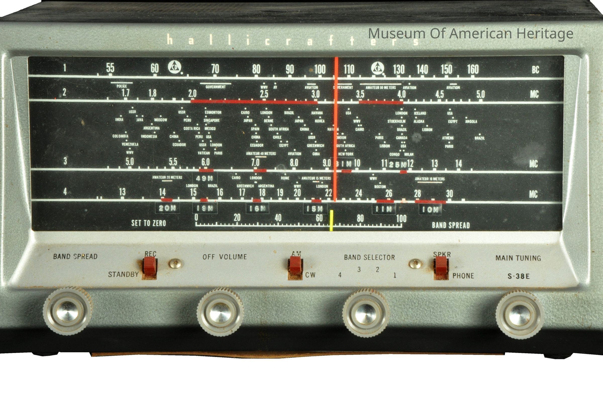 4 bands, band spread, on/off/volume, band select, main tuning, 1-160 KC, 2-5 MC, 3-14 MC, 4-30 MC.