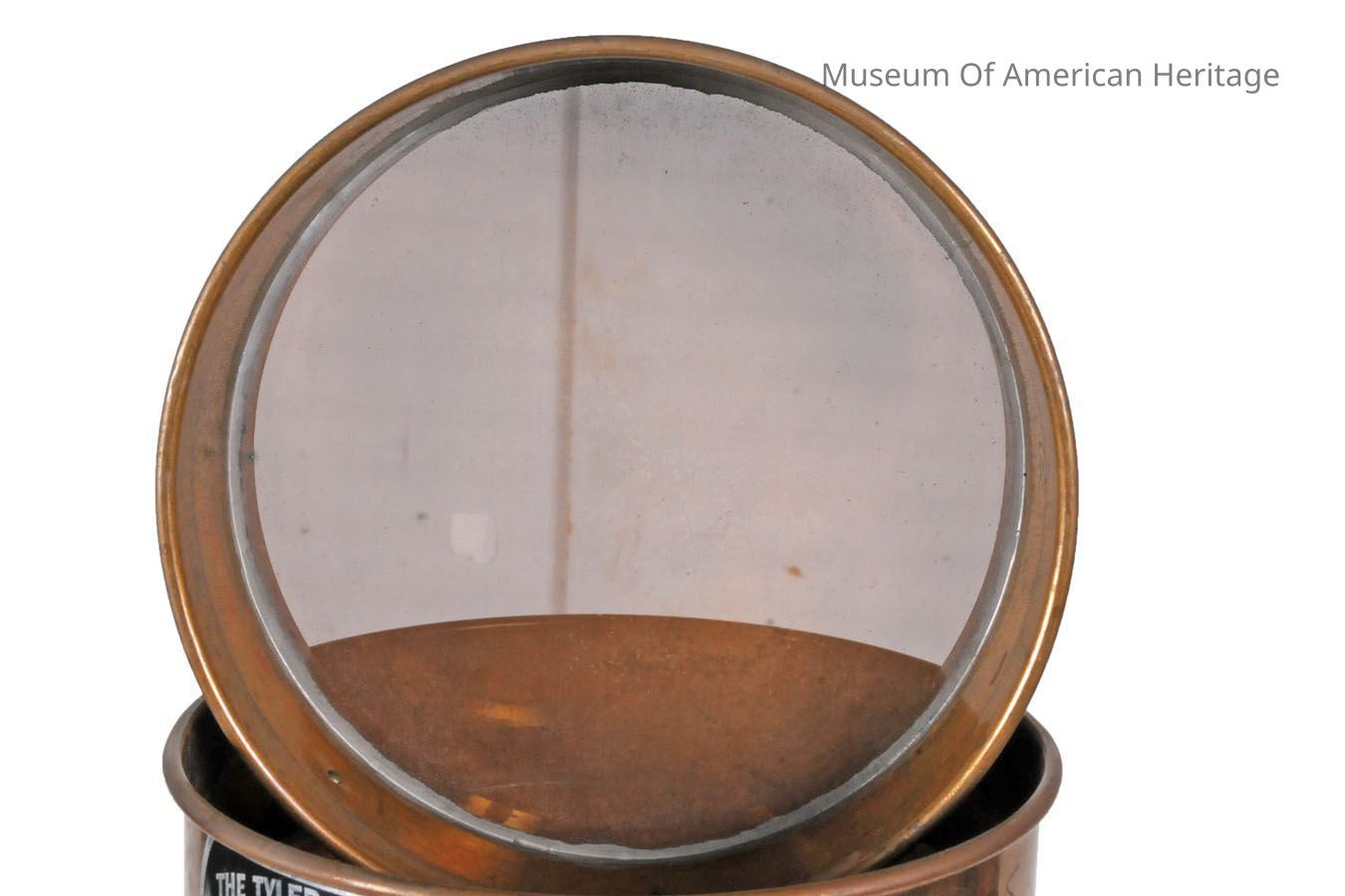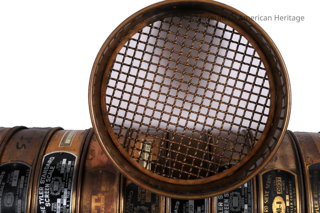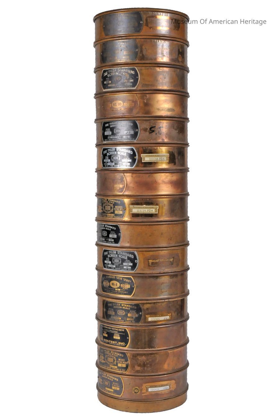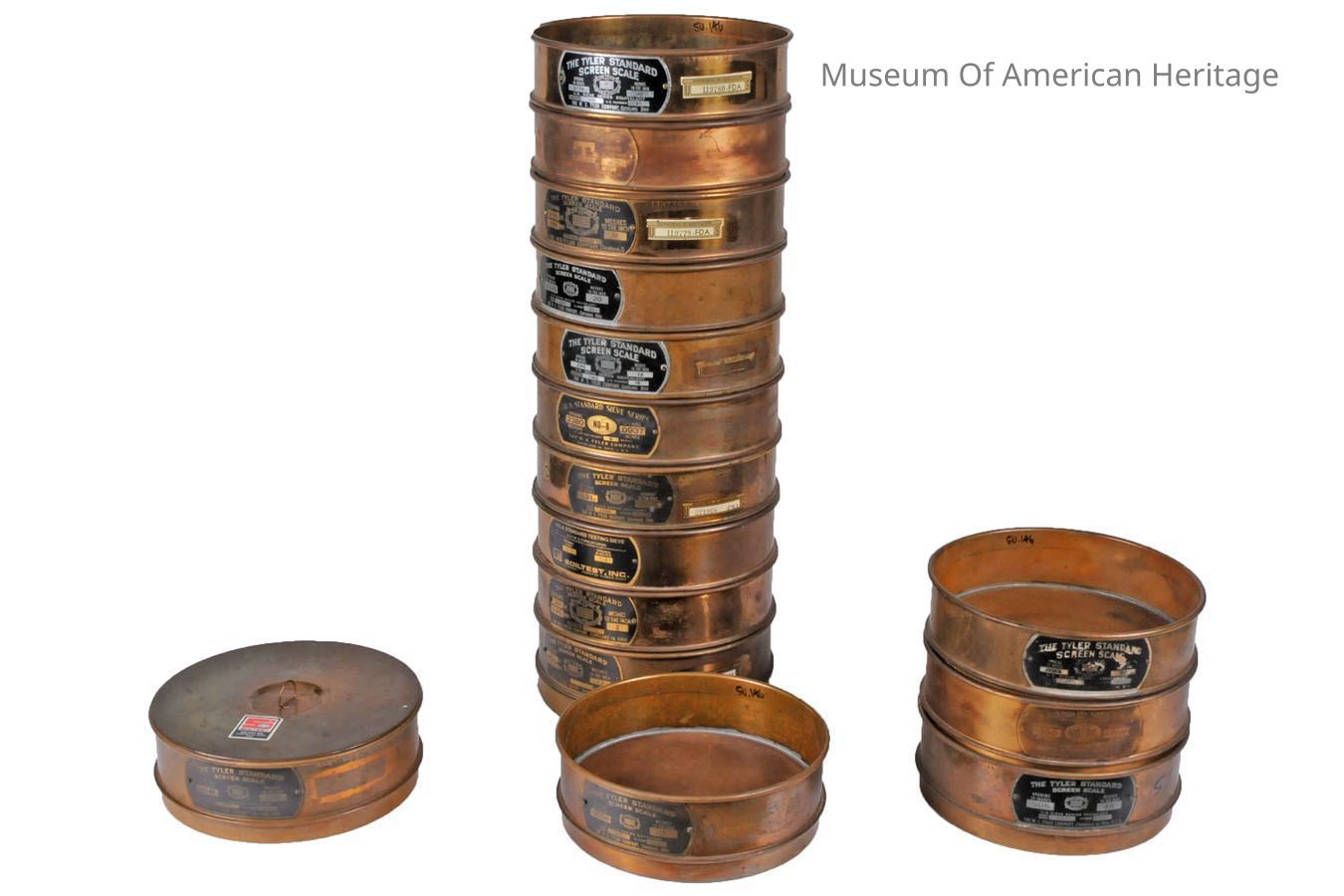 Set of 15 brass sieves ranging from No. 140 (Opening in inches .0041/Meshes to inch 150/opening microns 105) to No. (Opening in inches .312/Meshes to inch 2.5).