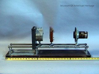Slide holder, on wood base, on metal track.