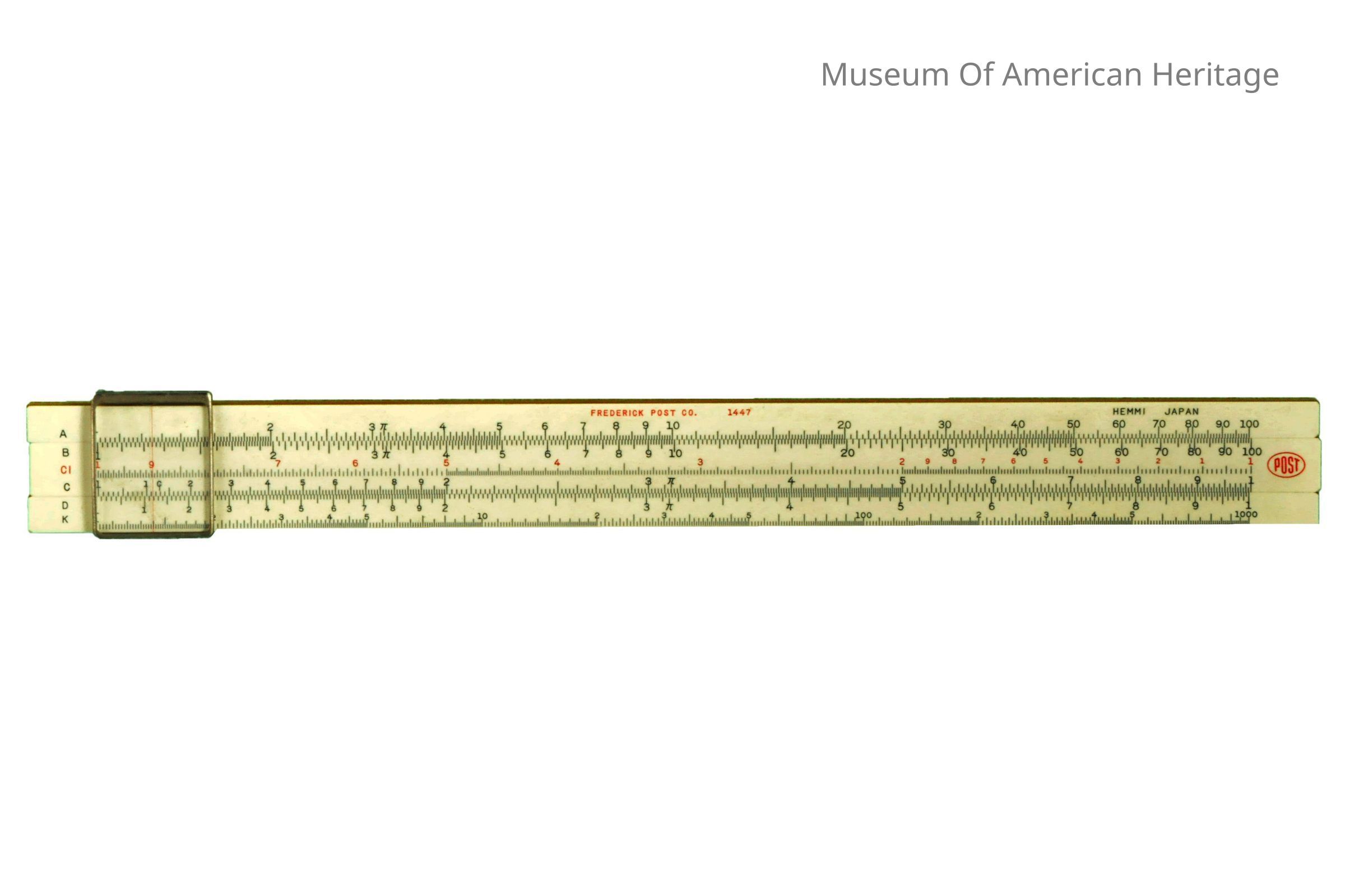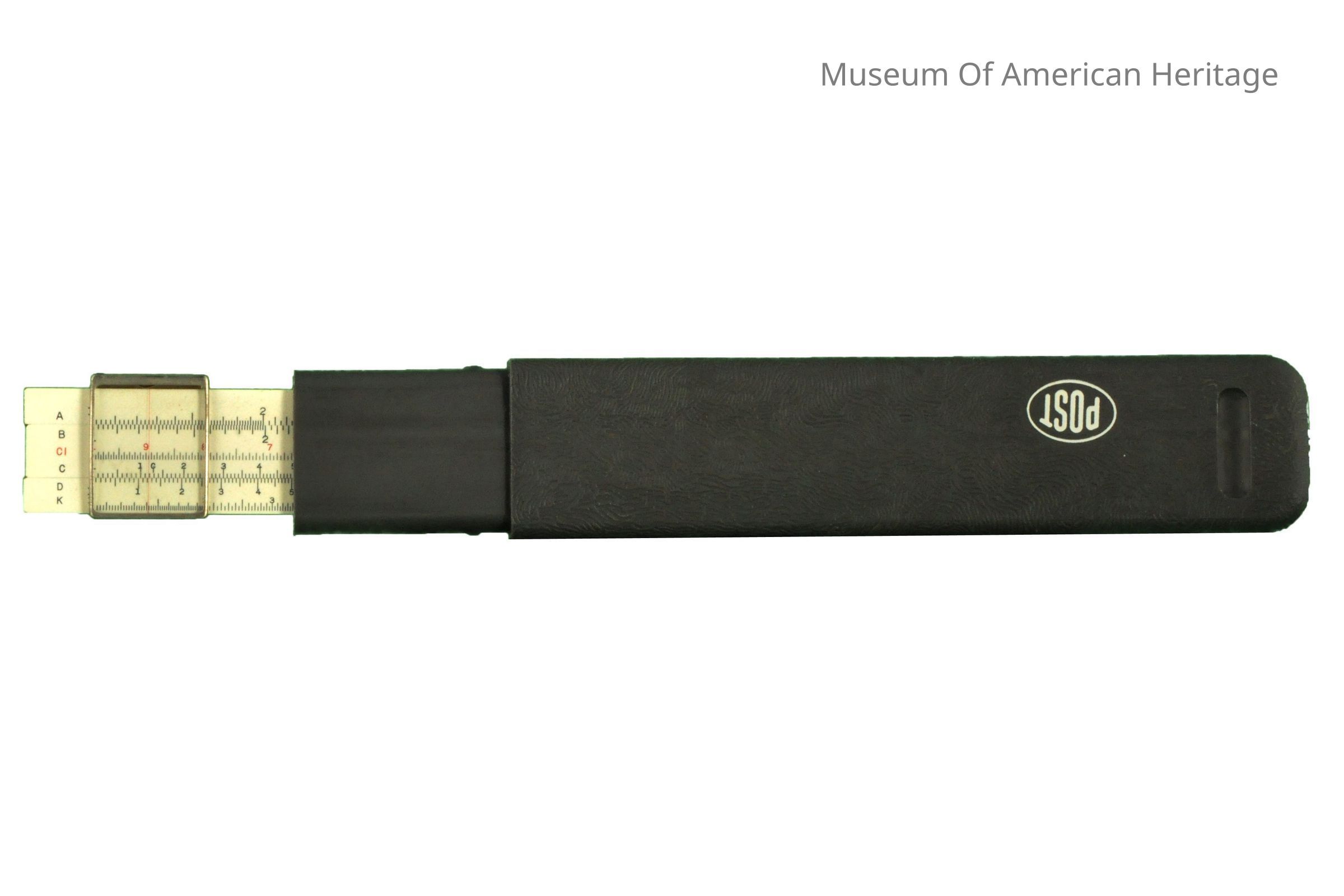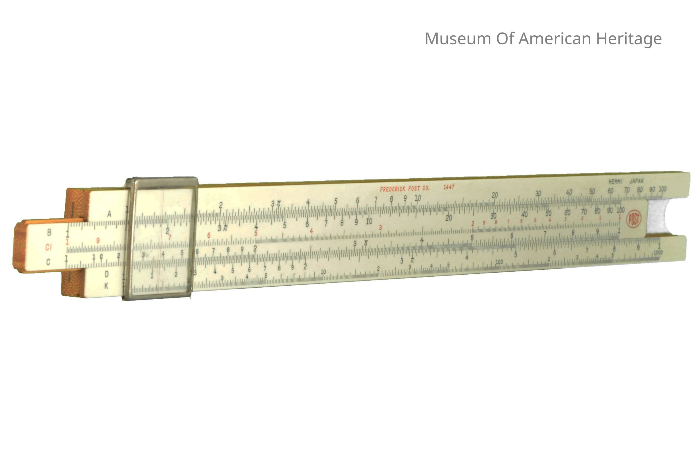 Calibration scale, underside, sliding glass viewer. Made for Frederick Post Co., SUN Logo on slide, gray plastic case.