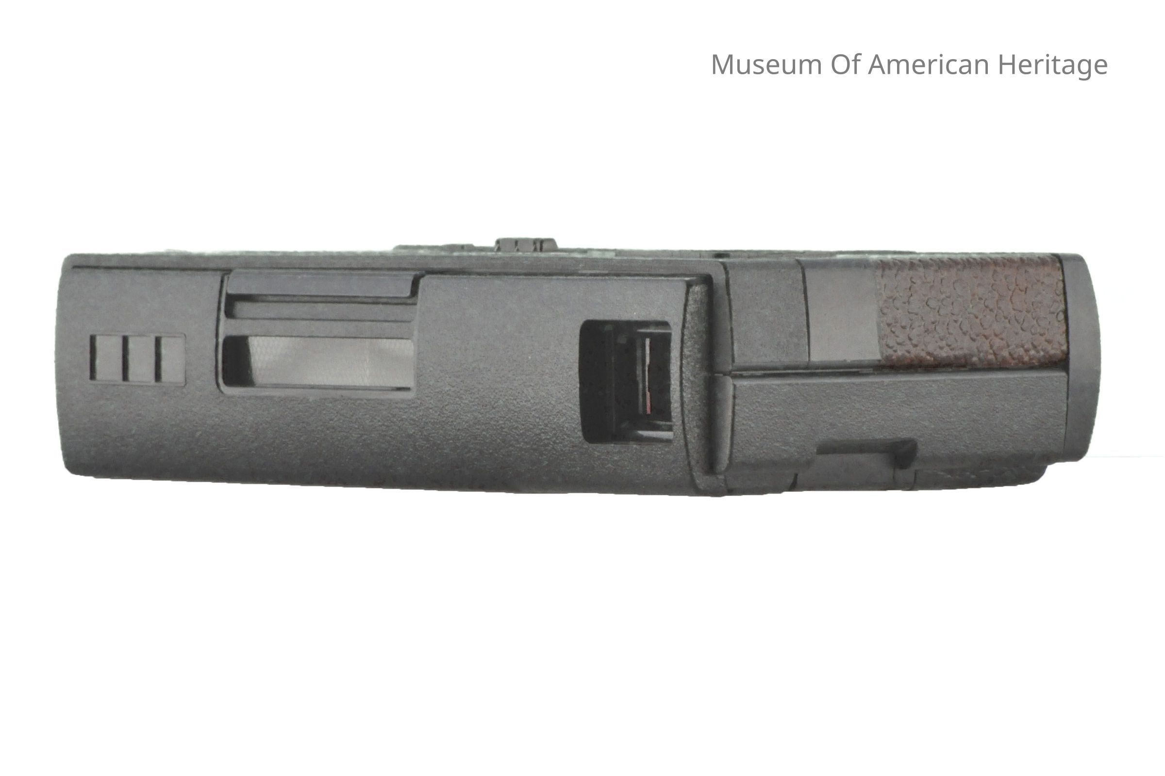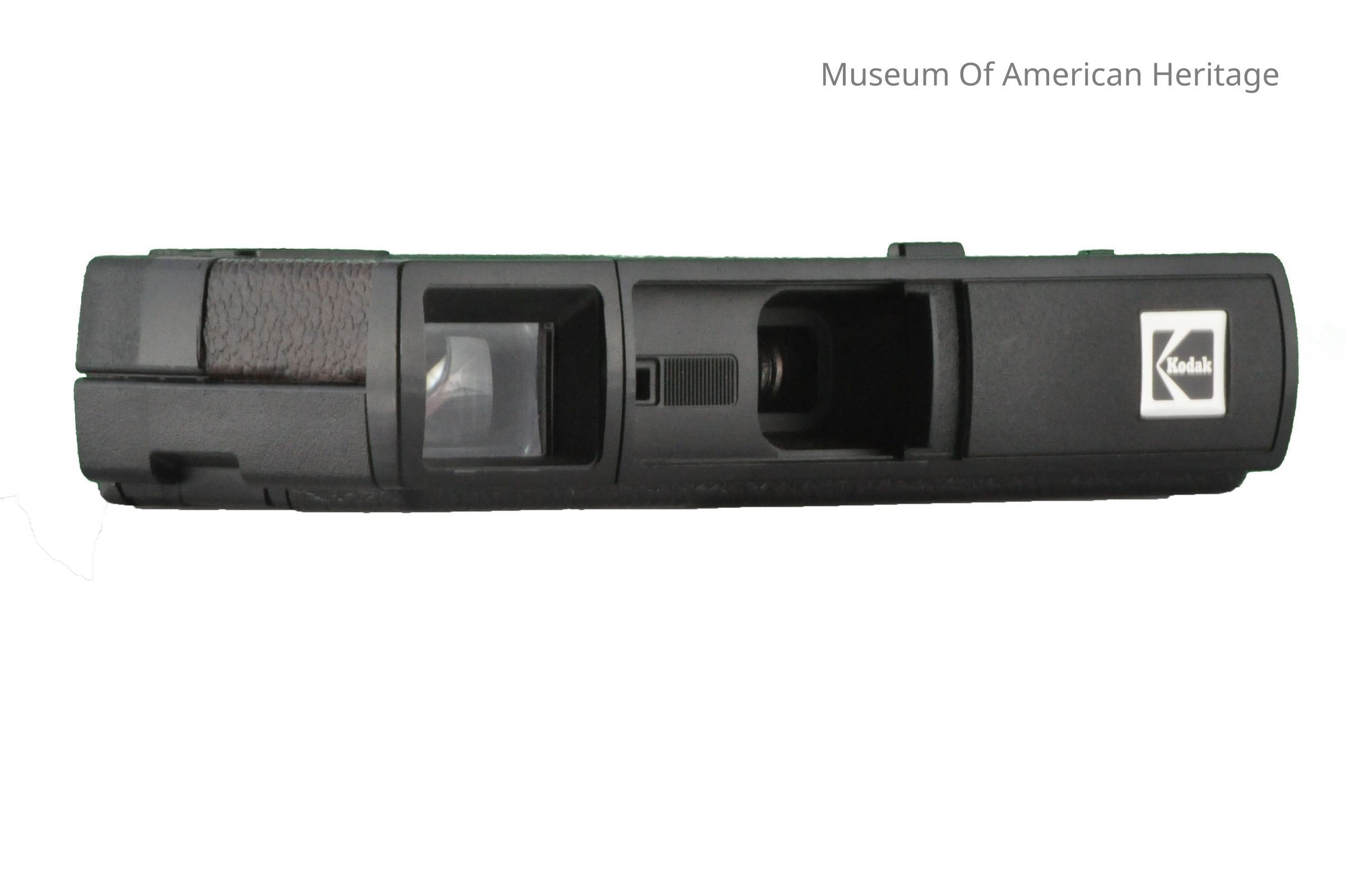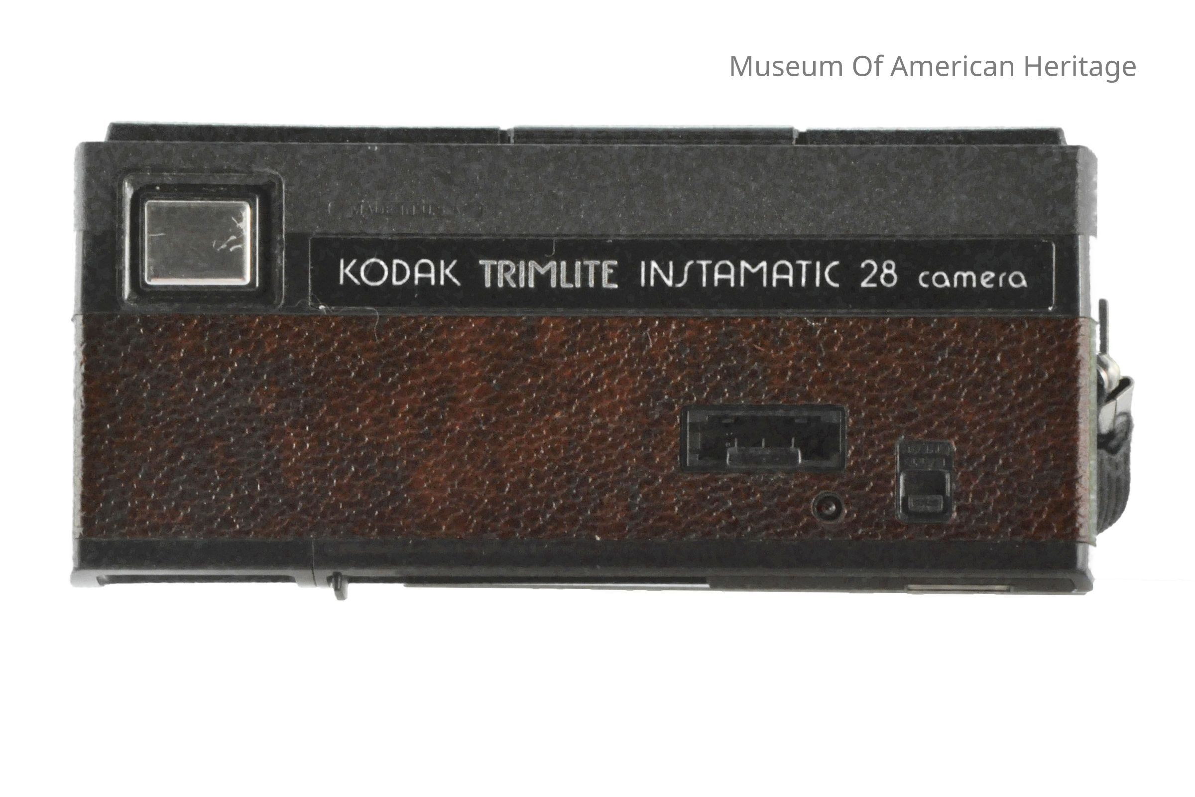Top loading, plastic body, metal Kodak plate on bottom, ribbon strap, film viewer on back, front trigger.