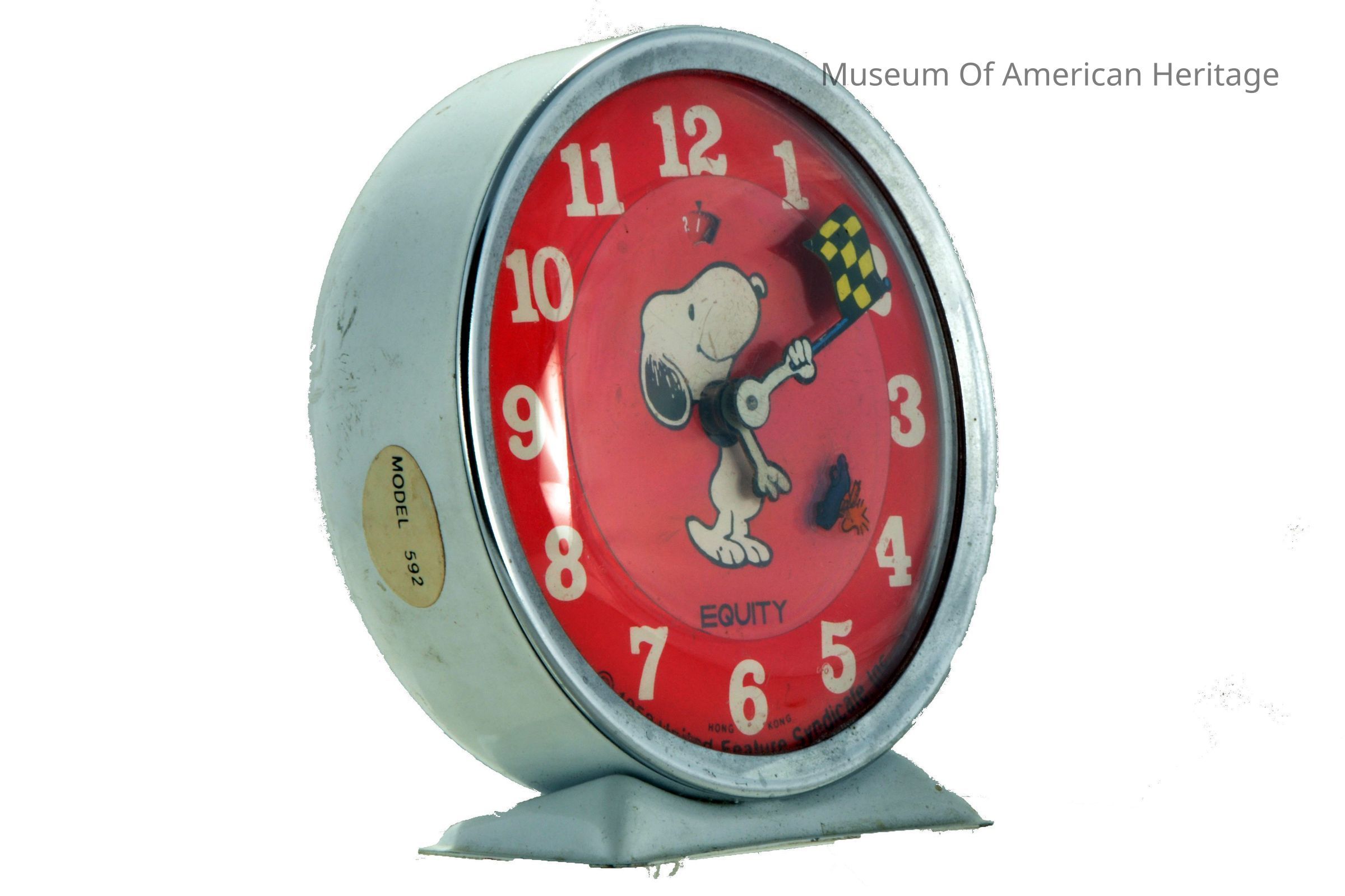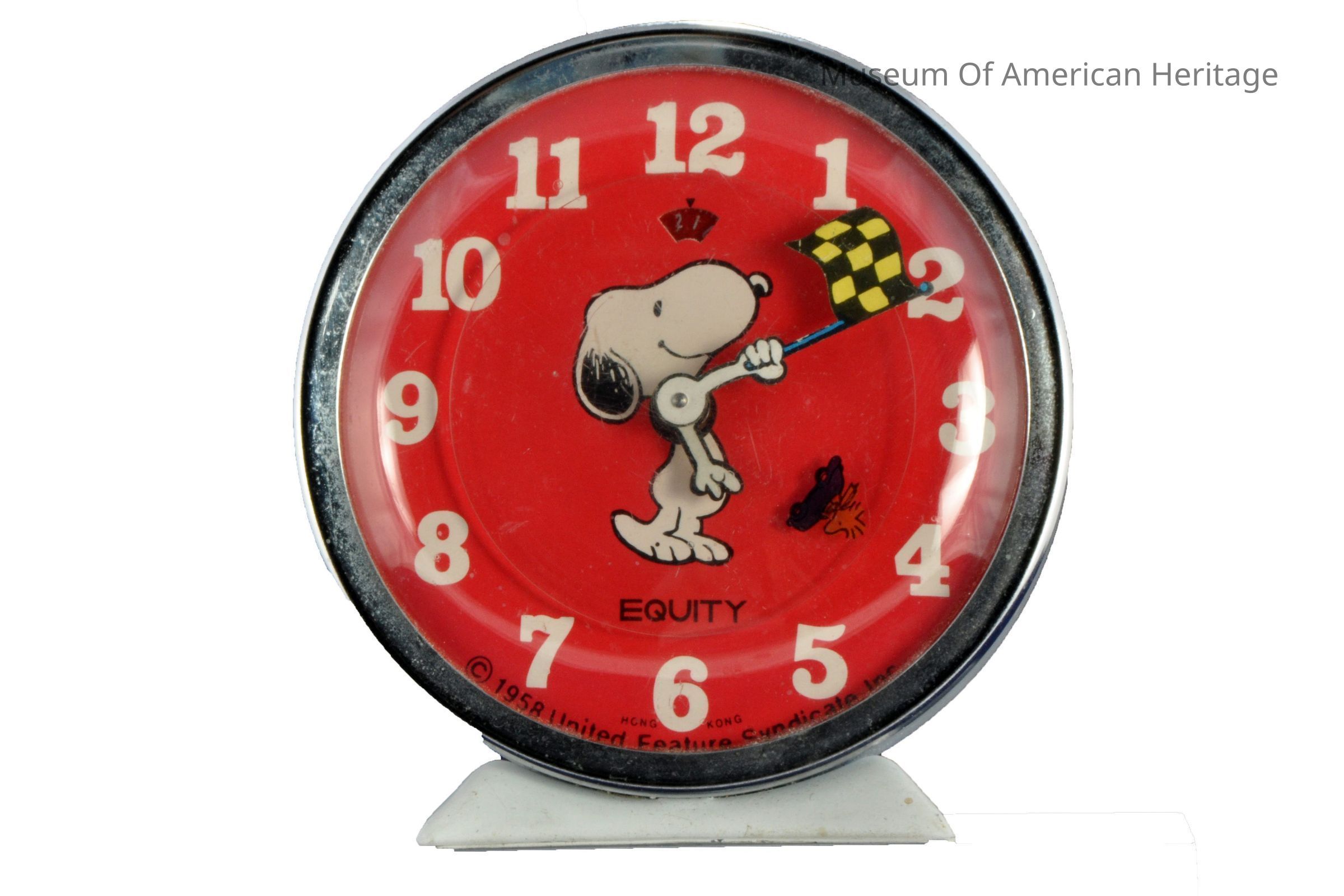 1958 King Features Syndicate Inc., white numbers on red face, Snoopy Dog with Woodstock on face, Snoopy paws are clock hands, white clock body.