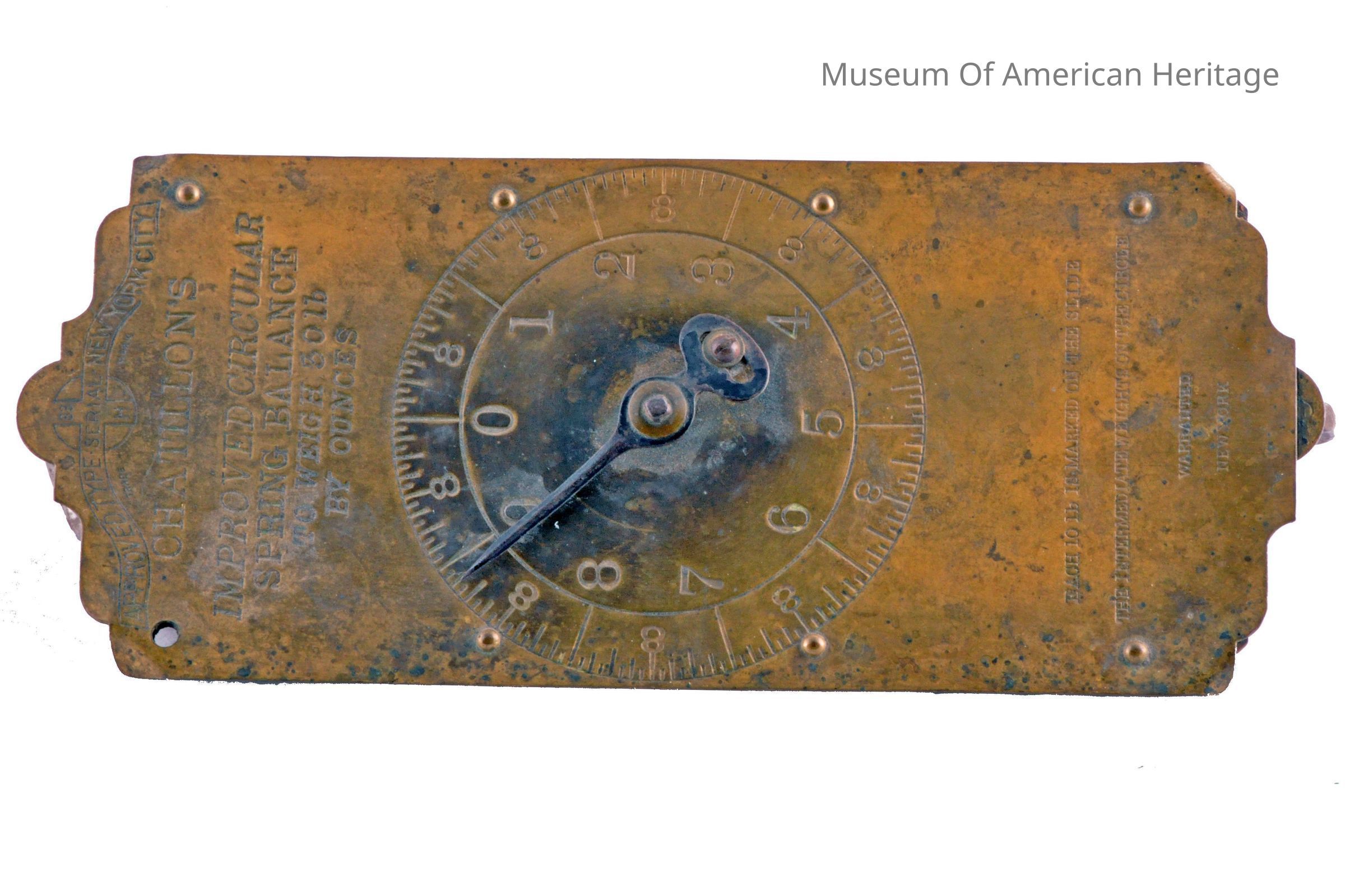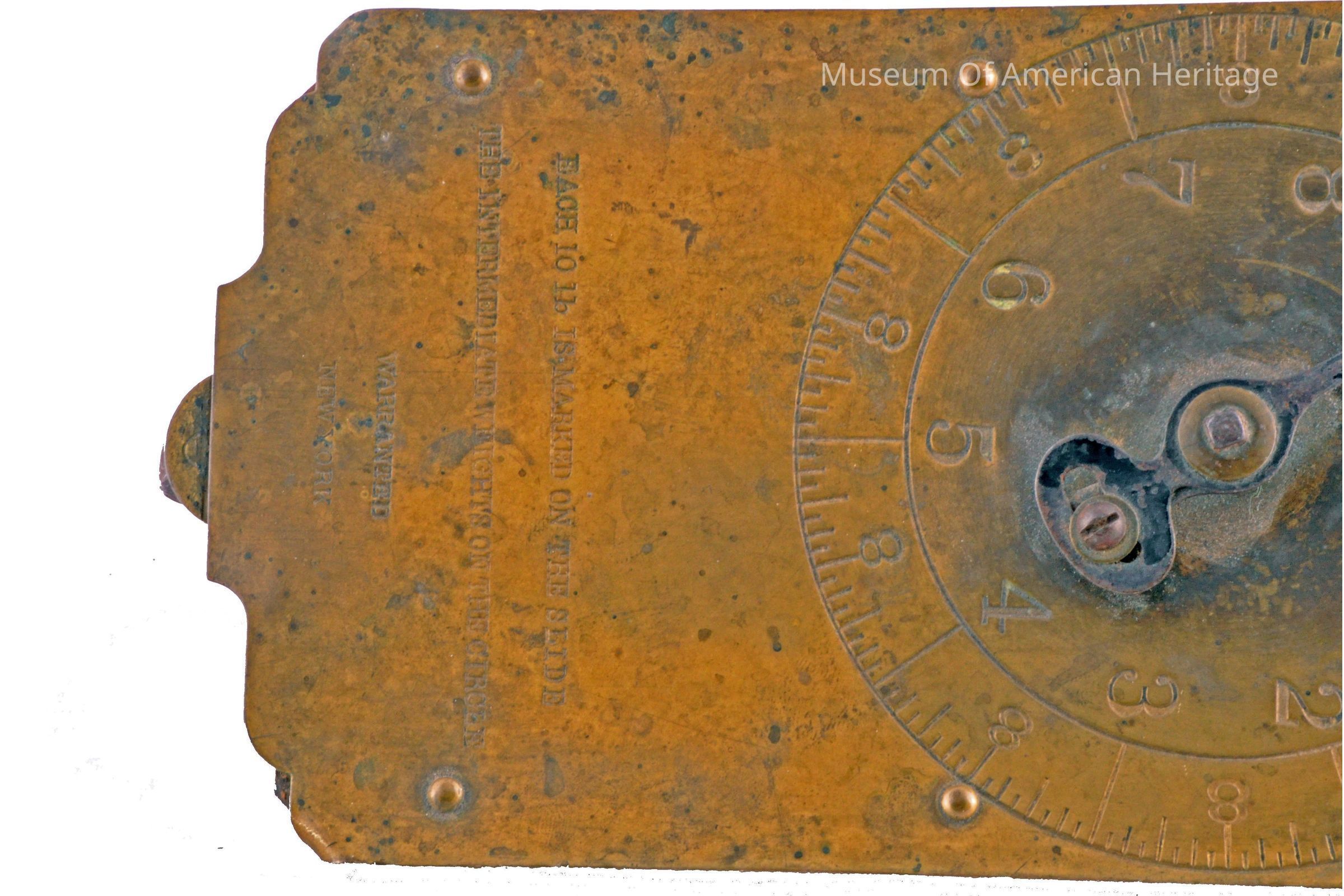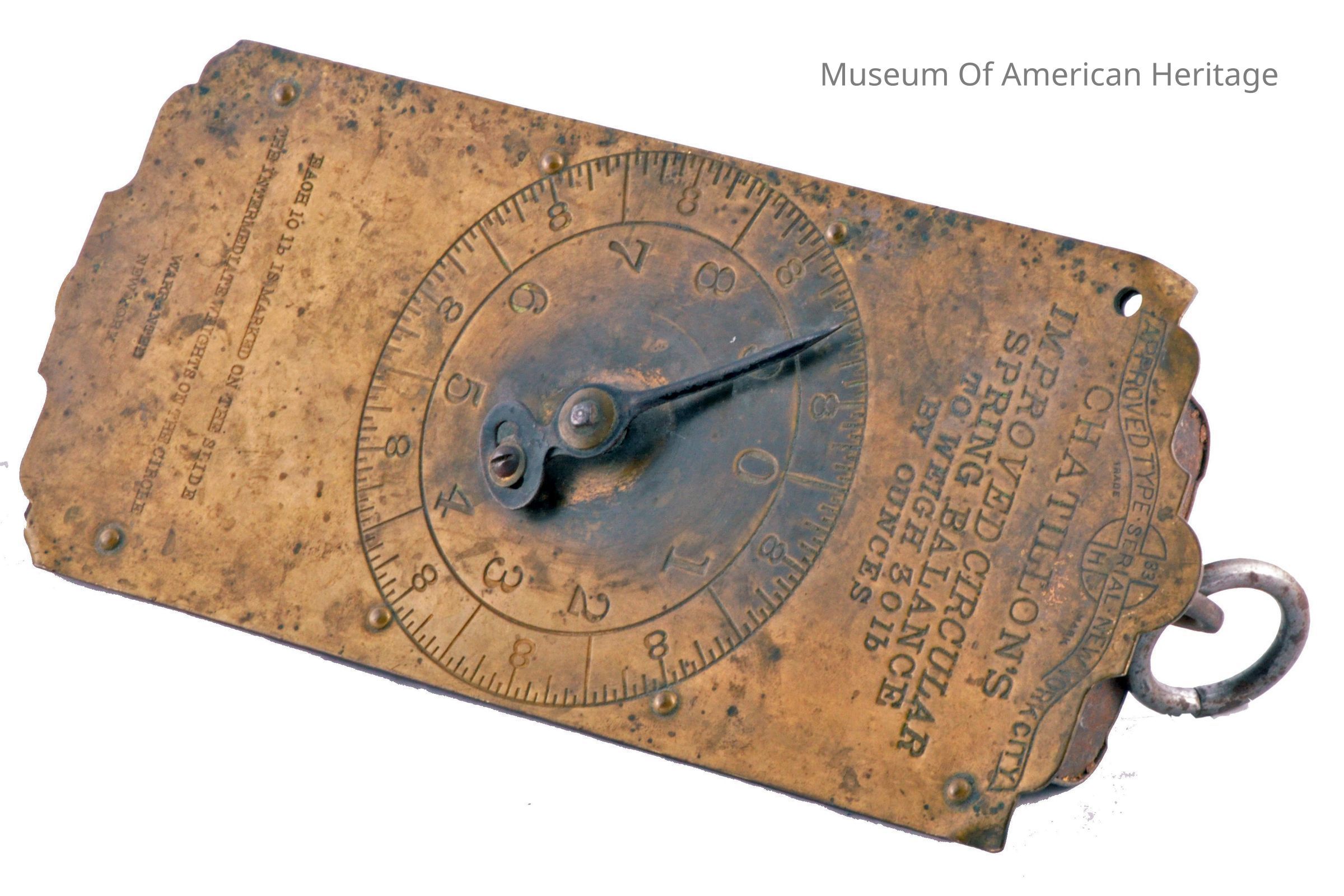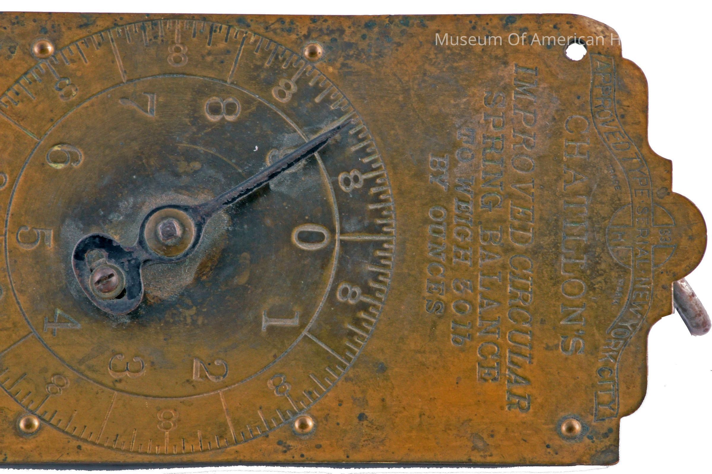 Circular spring balance, to 30 lbs by ounces, each 10 lbs marked on slide, intermediate weights on circle, hanging type scale.