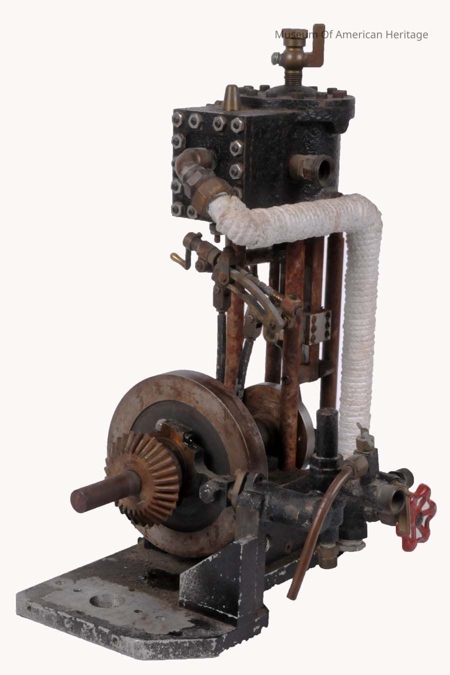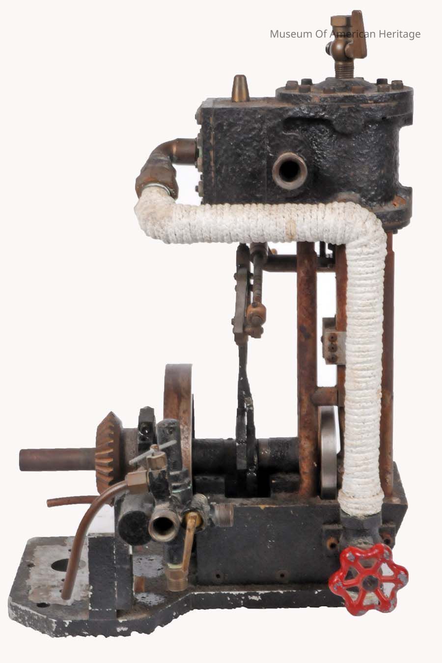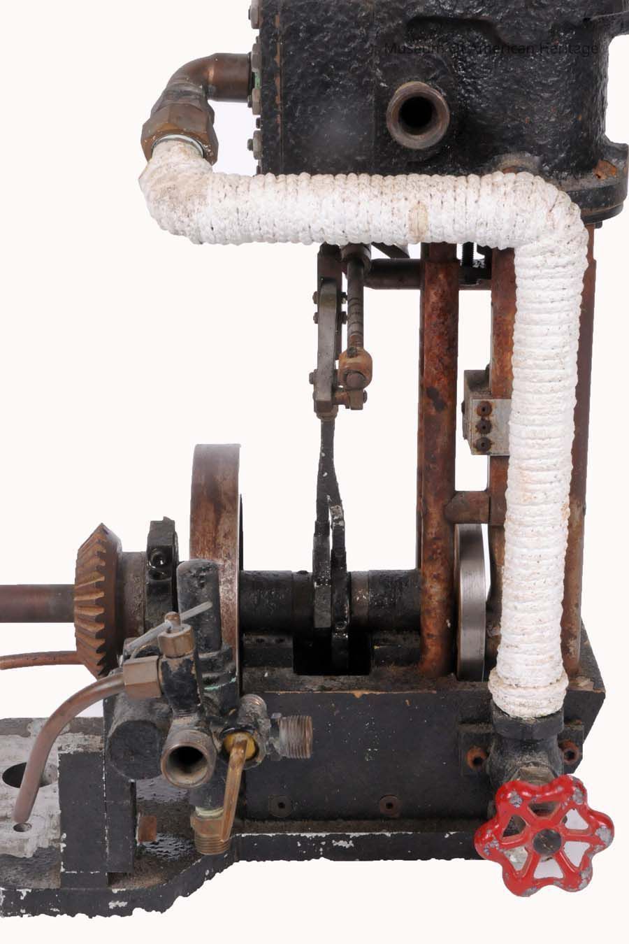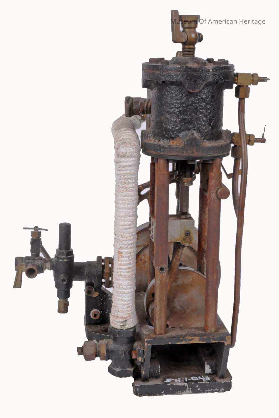 Single cylinder, single fly wheel, Insulated steam pipe Drives water pump. Likely homemade.