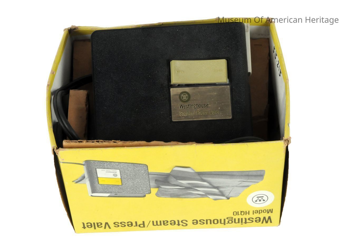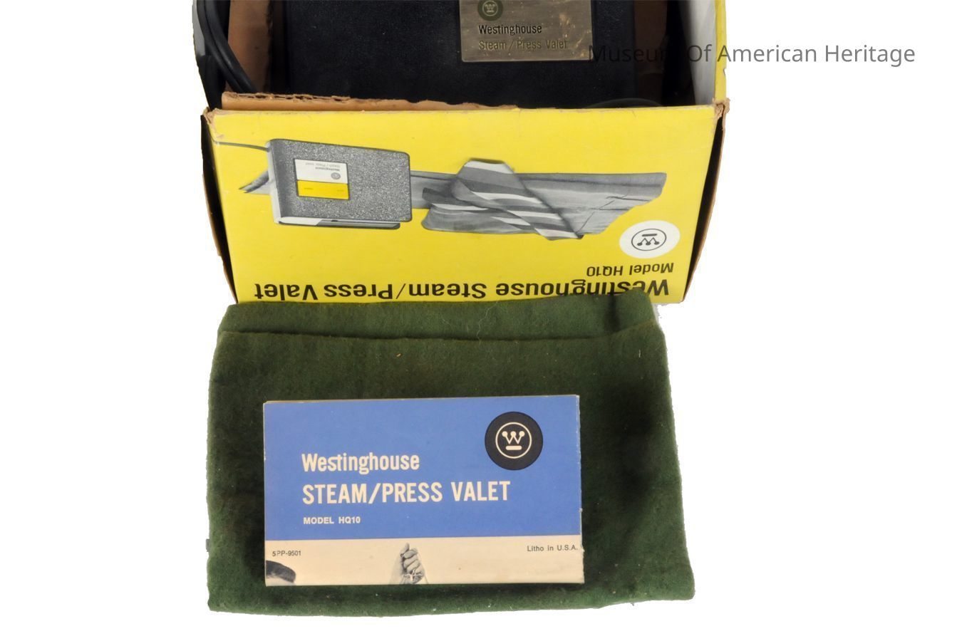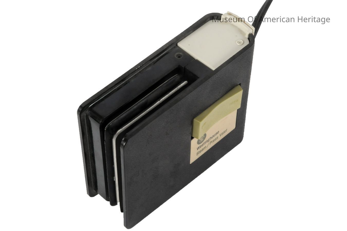 This portable steam press was promoted for improving the creases in pants and pleated skirts and for the pressing of ties. A significant amount of the advertising for this was targeted to professionals for use on business trips.