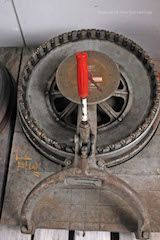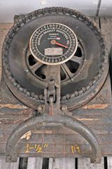 A: 1 3/4 inch Stencils, B: 1 1/2 inch Stencils. Automatic feed to advance paper to the next position. Patent # 2,317,527 (1942). Circular part rotates to select the letter or number, pull handle to punch.