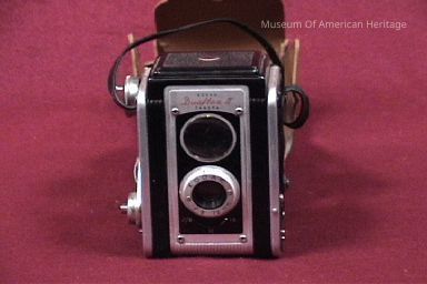 In leather carry case, Reflex, twin lens, finder hood, flash synchronized.