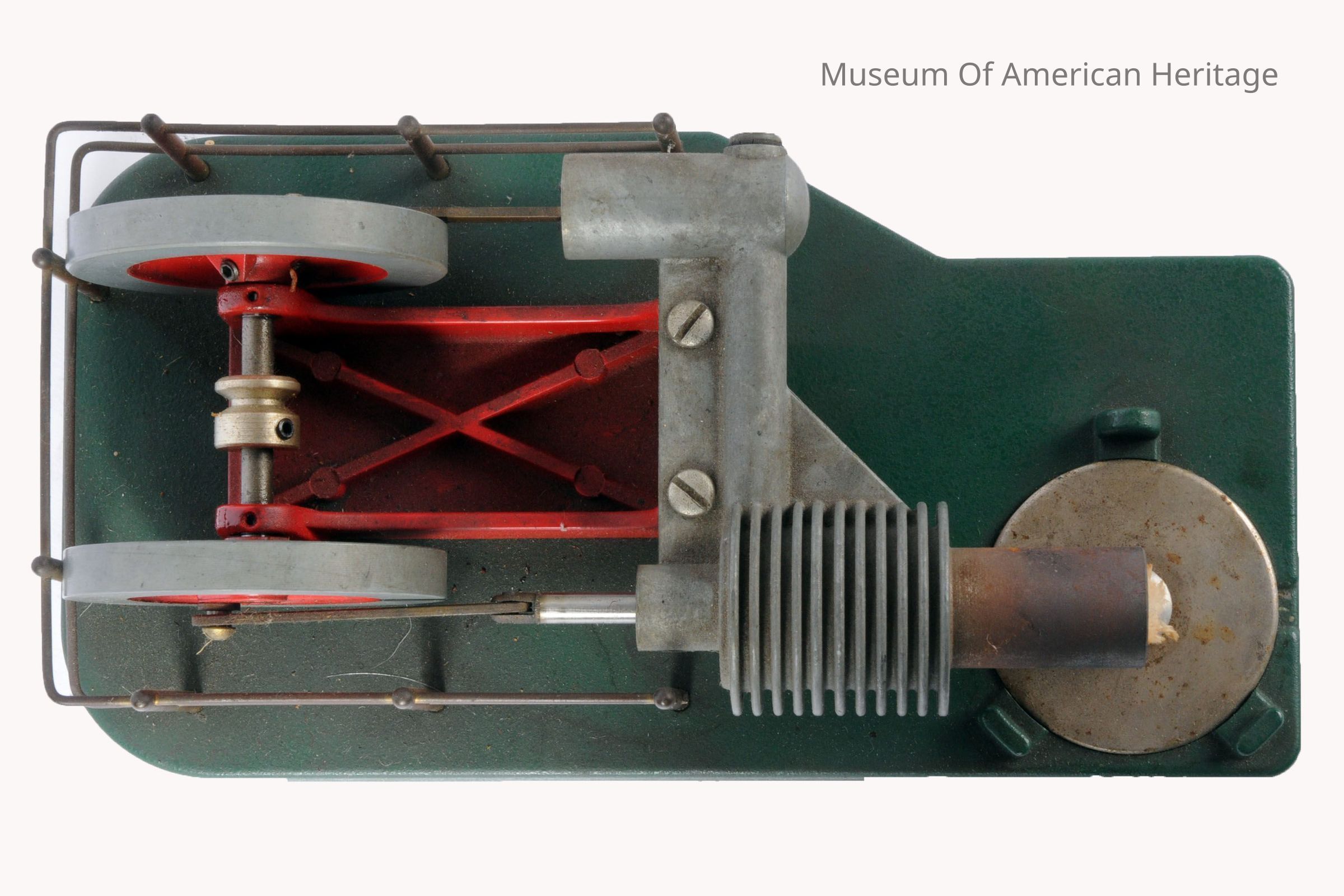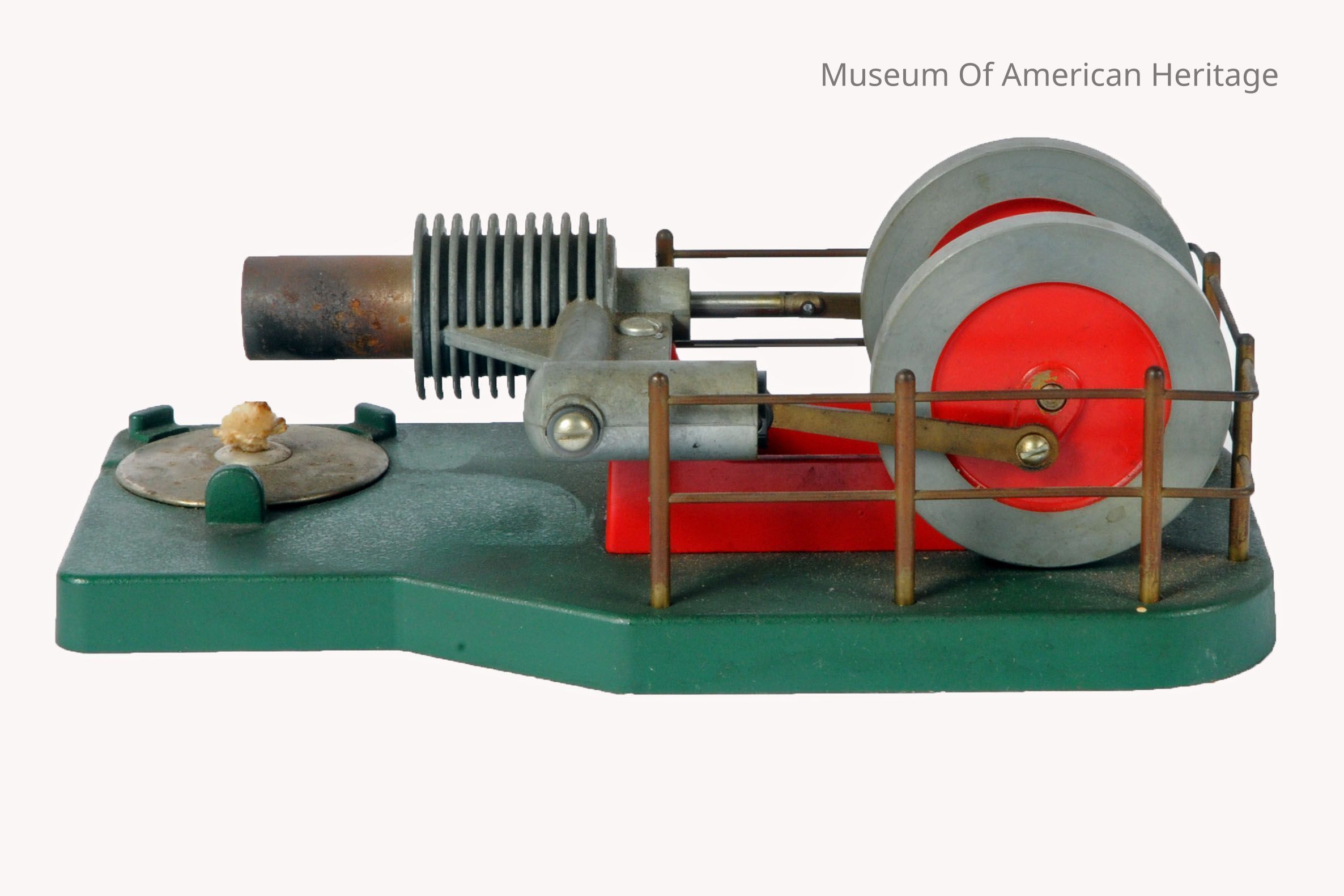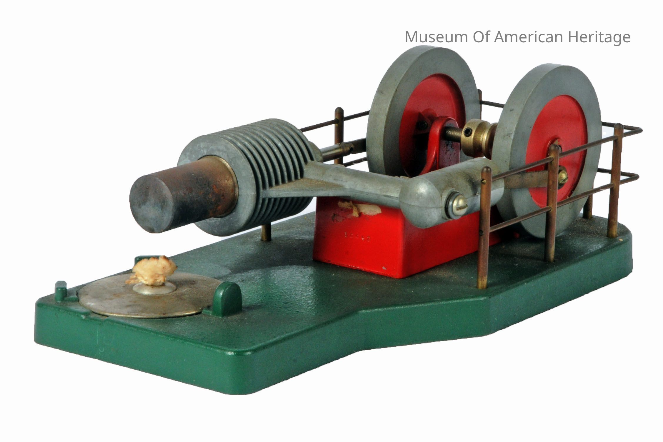 Horizontal piston, dual flywheels, alcohol wick built into base with reservoir built into base.