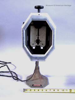 Cast metal base, square rod, aluminum reflector, carbon arc rods.