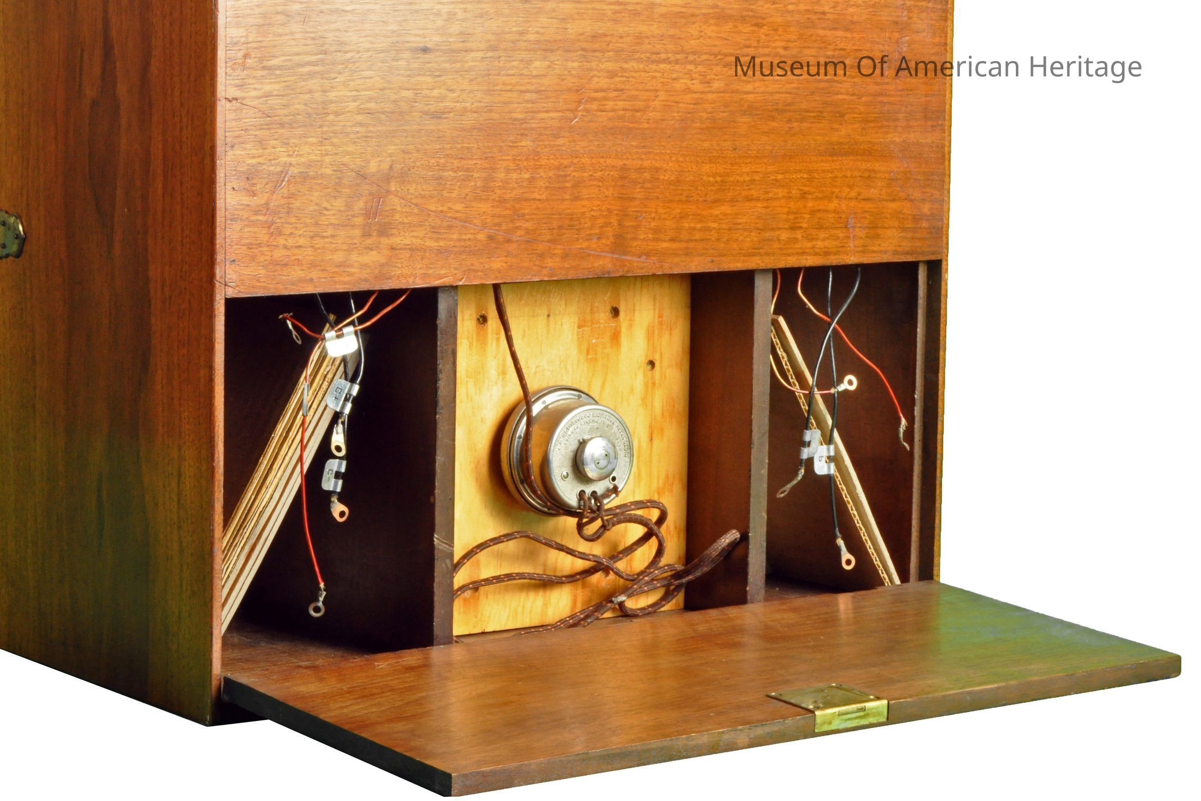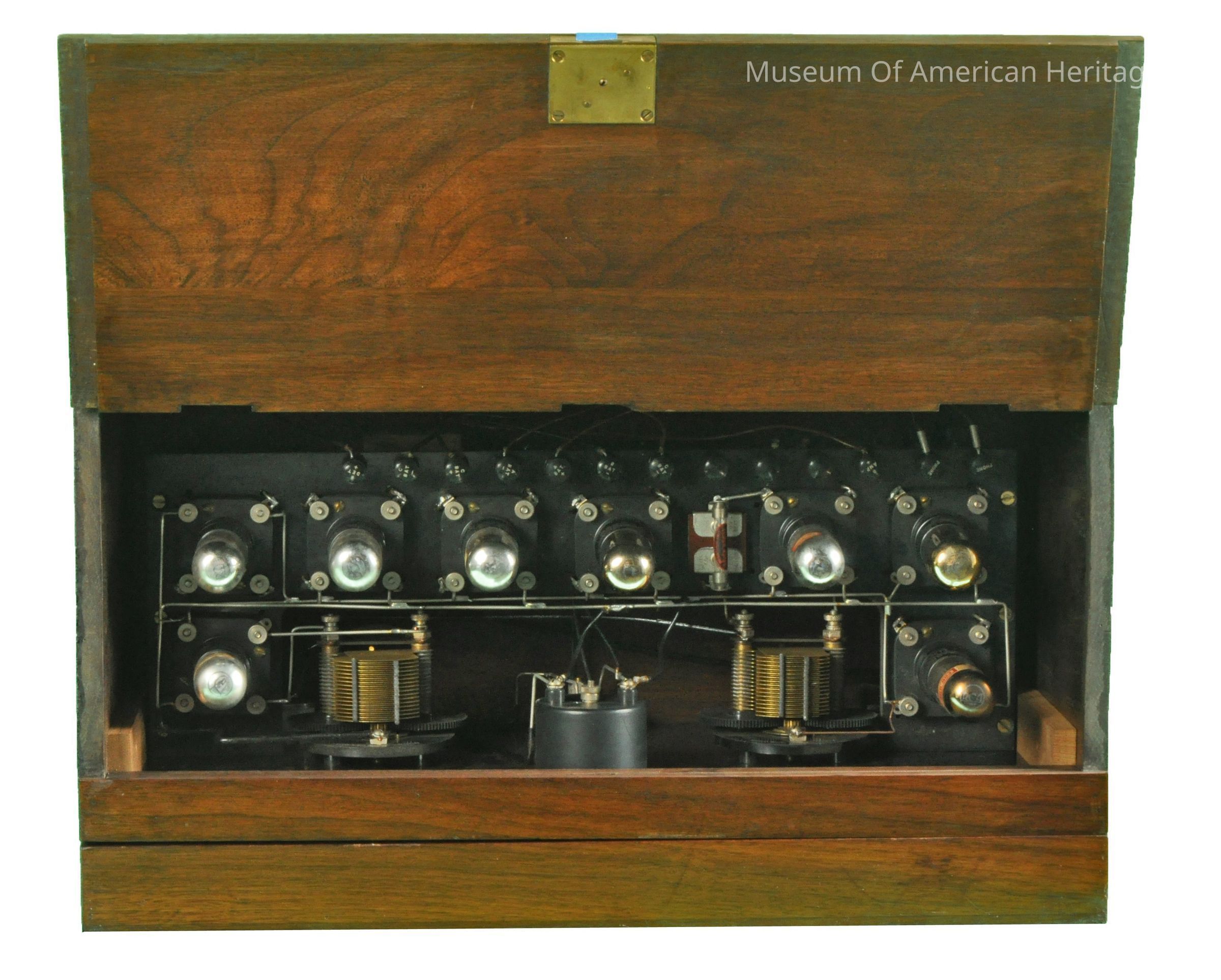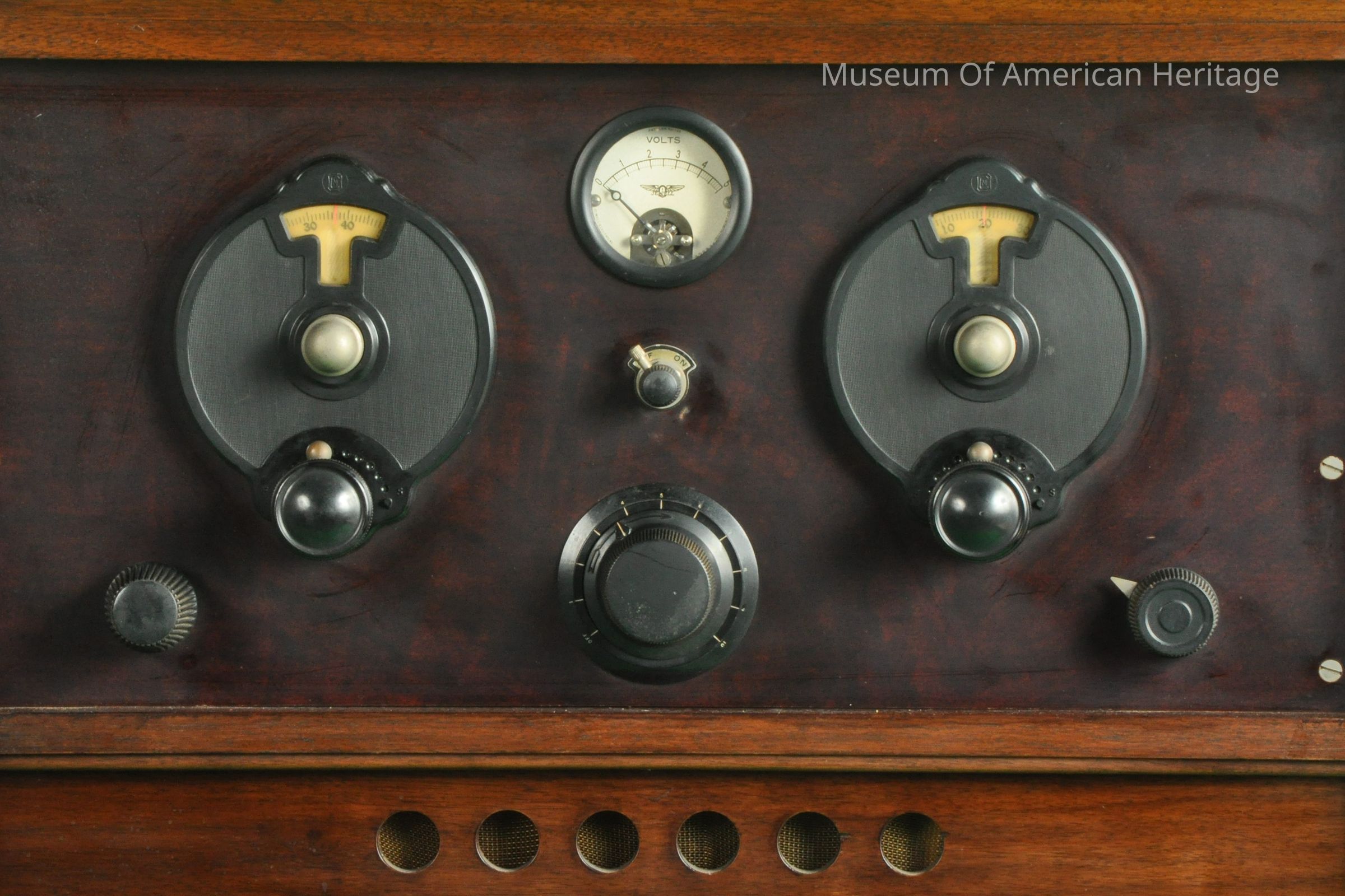 8 tubes, 2 tuning dials, 3 additional dials (dials are not identified), no identification on chassis or case because of patent infringements, Cabinet made of solid walnut, radio works sold separately, customer made or had made their own cabinet.