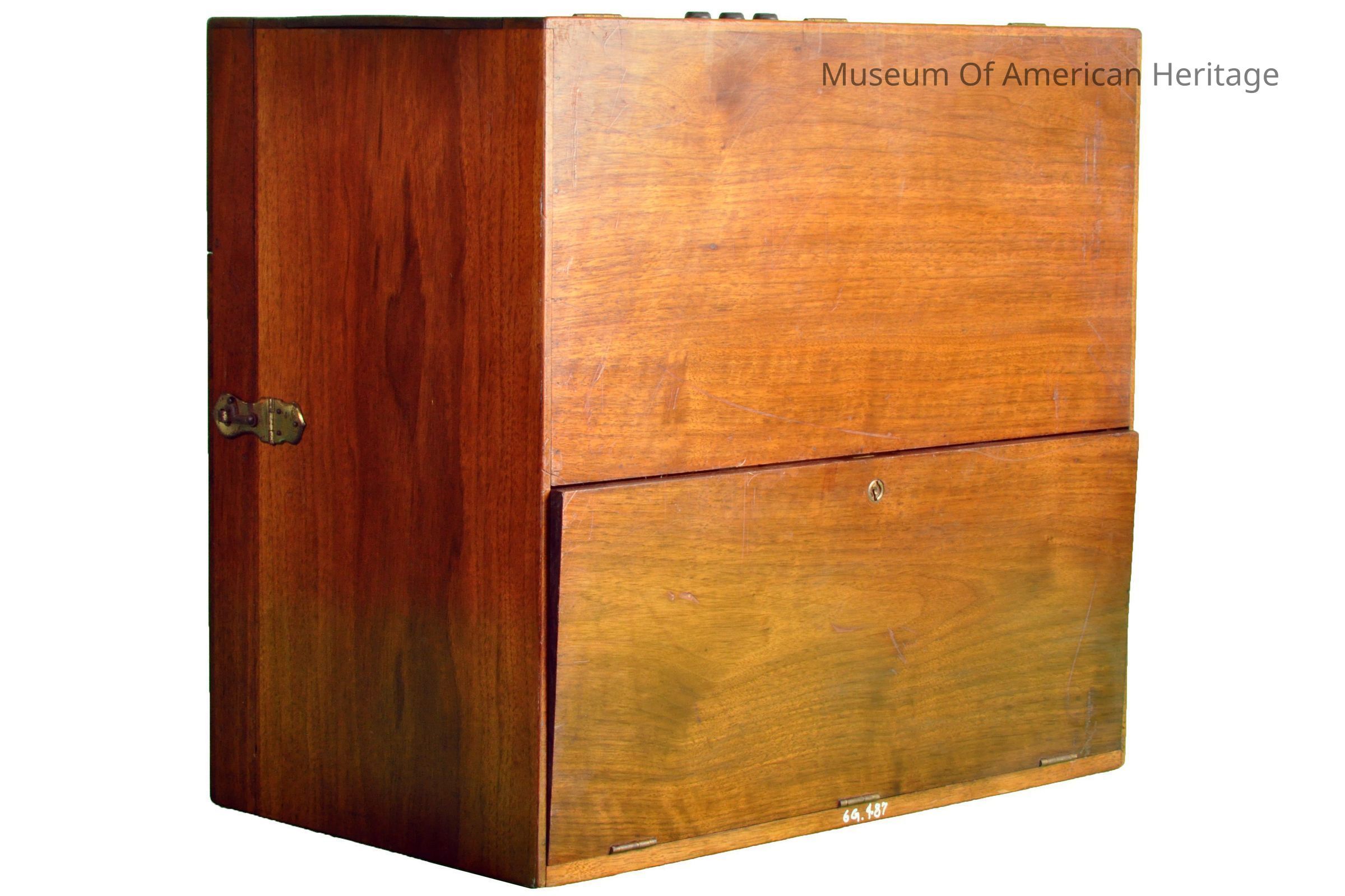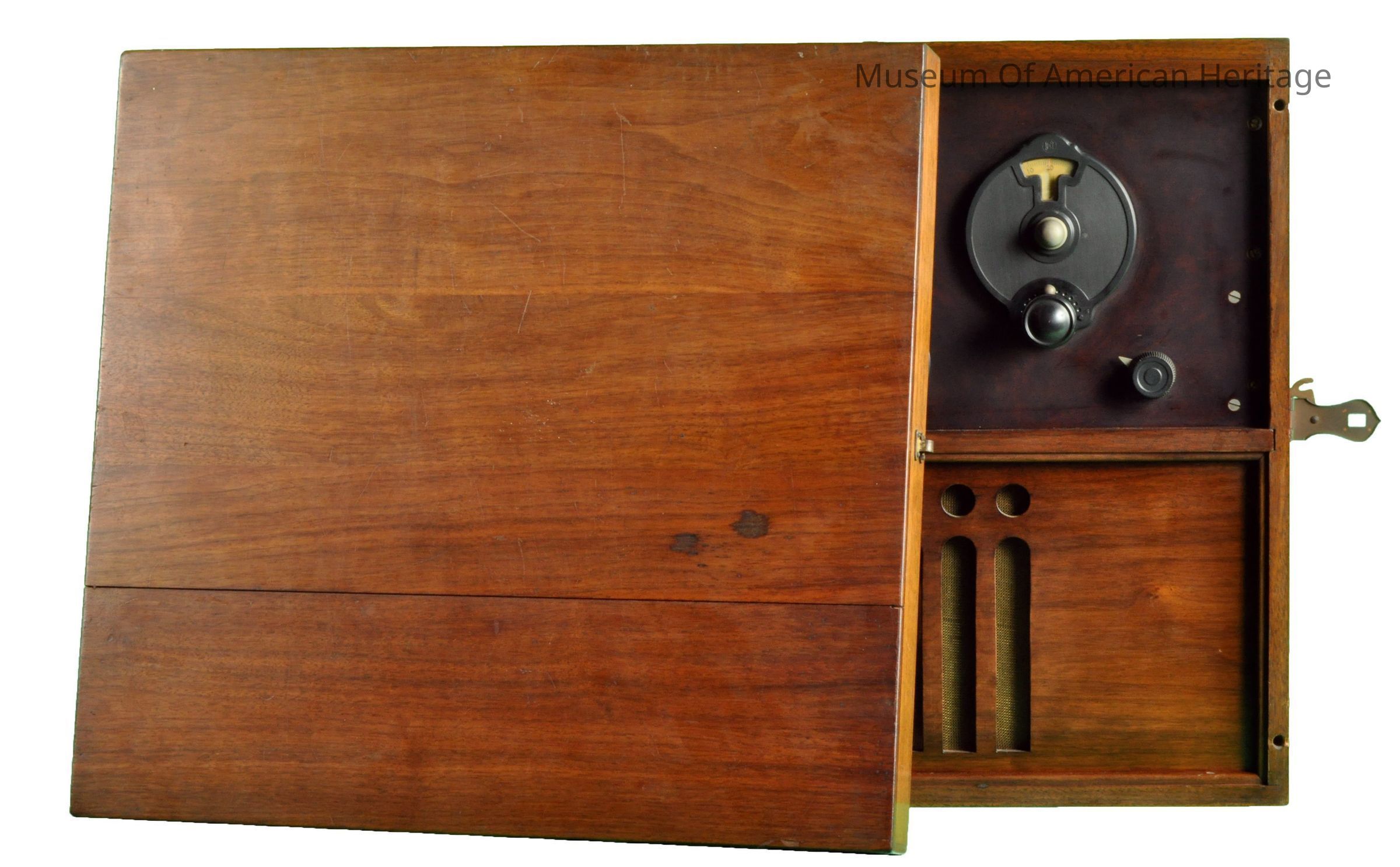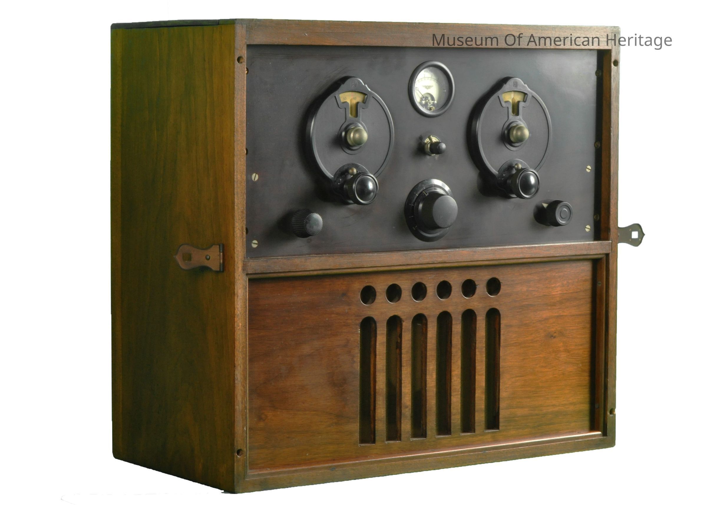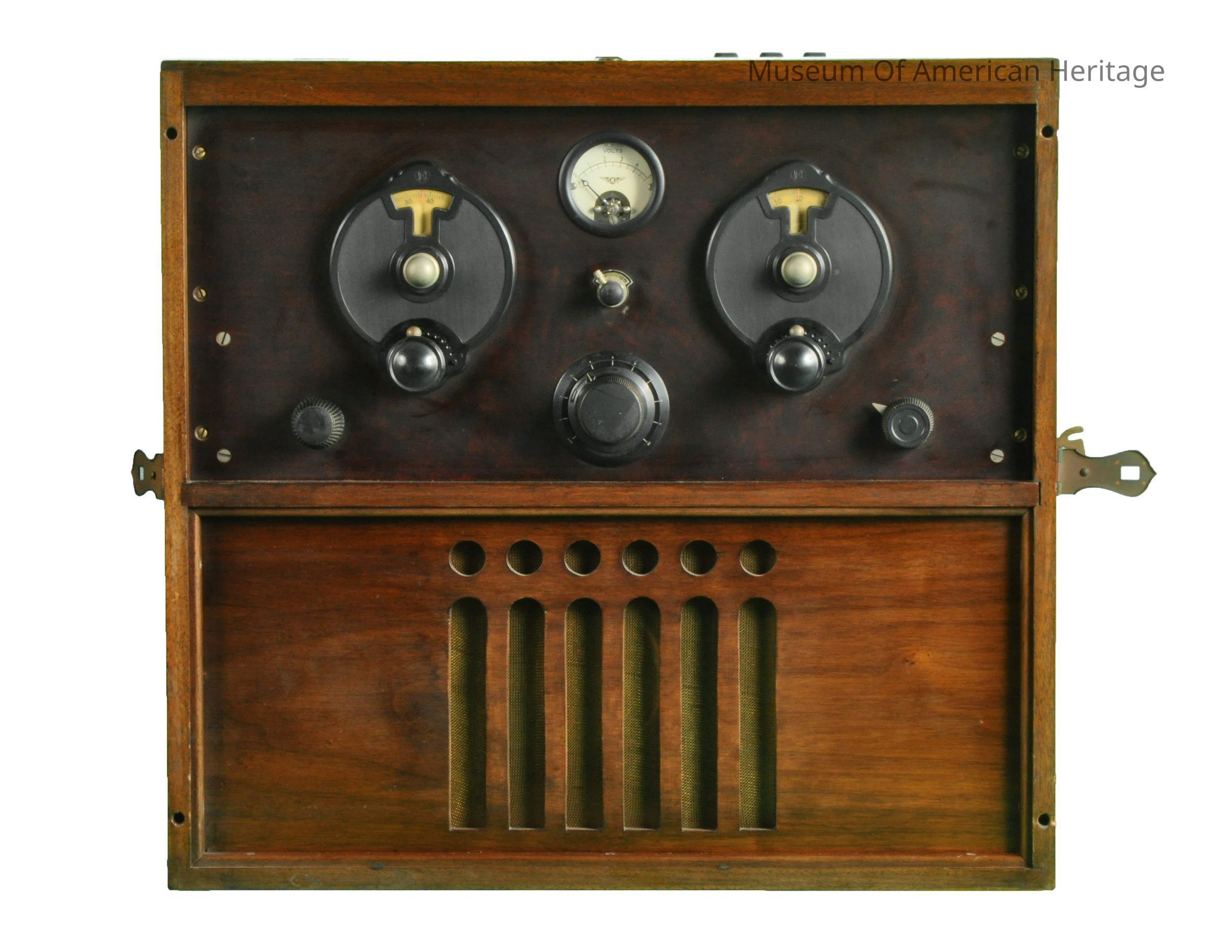 8 tubes, 2 tuning dials, 3 additional dials (dials are not identified), no identification on chassis or case because of patent infringements, Cabinet made of solid walnut, radio works sold separately, customer made or had made their own cabinet.