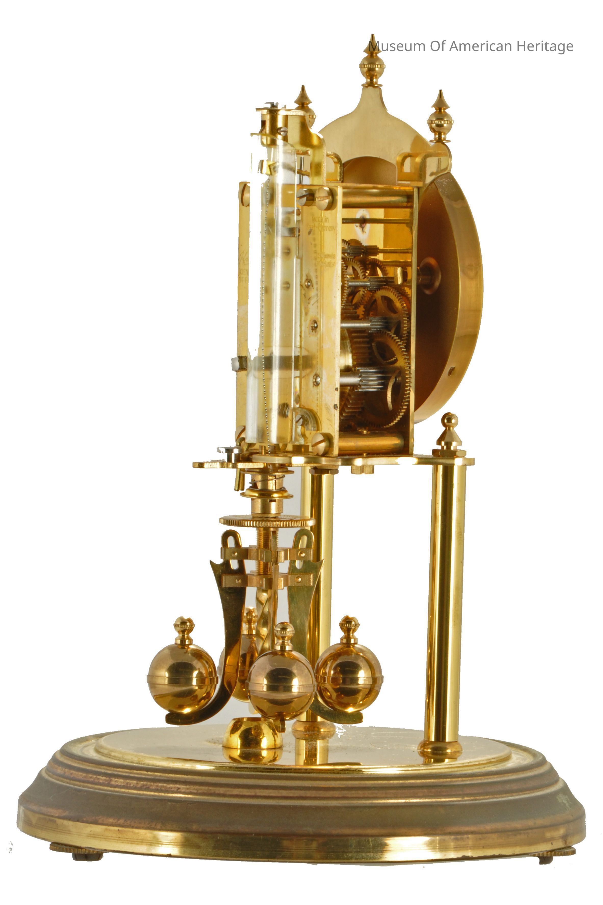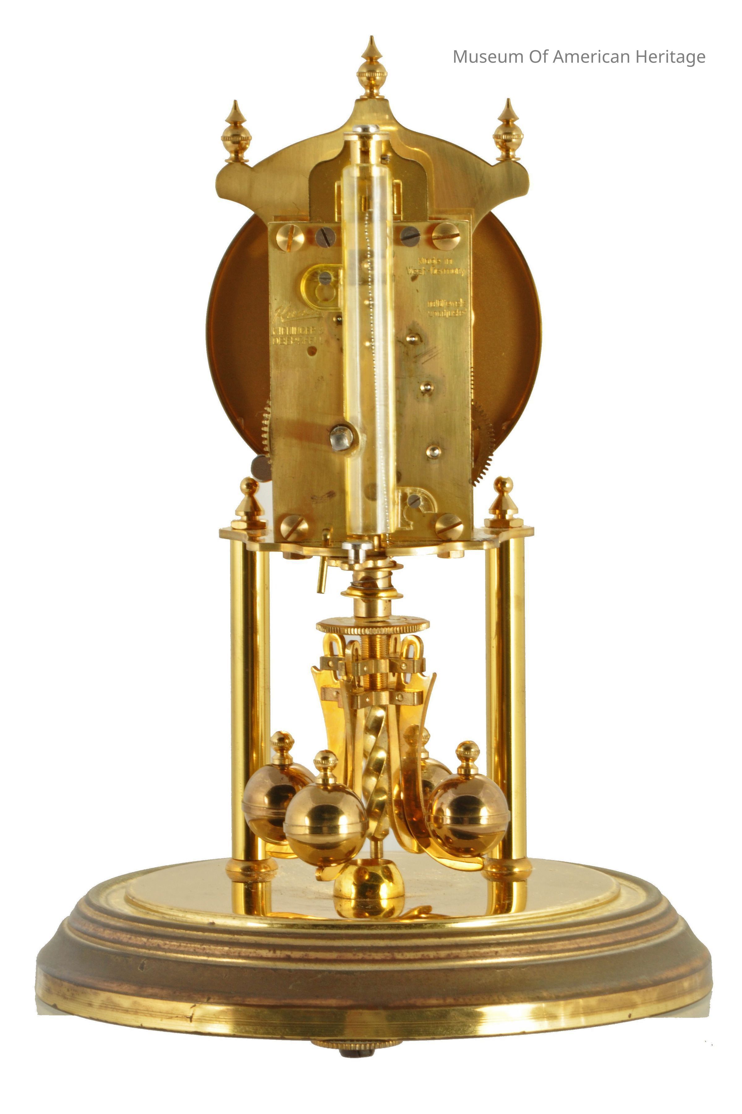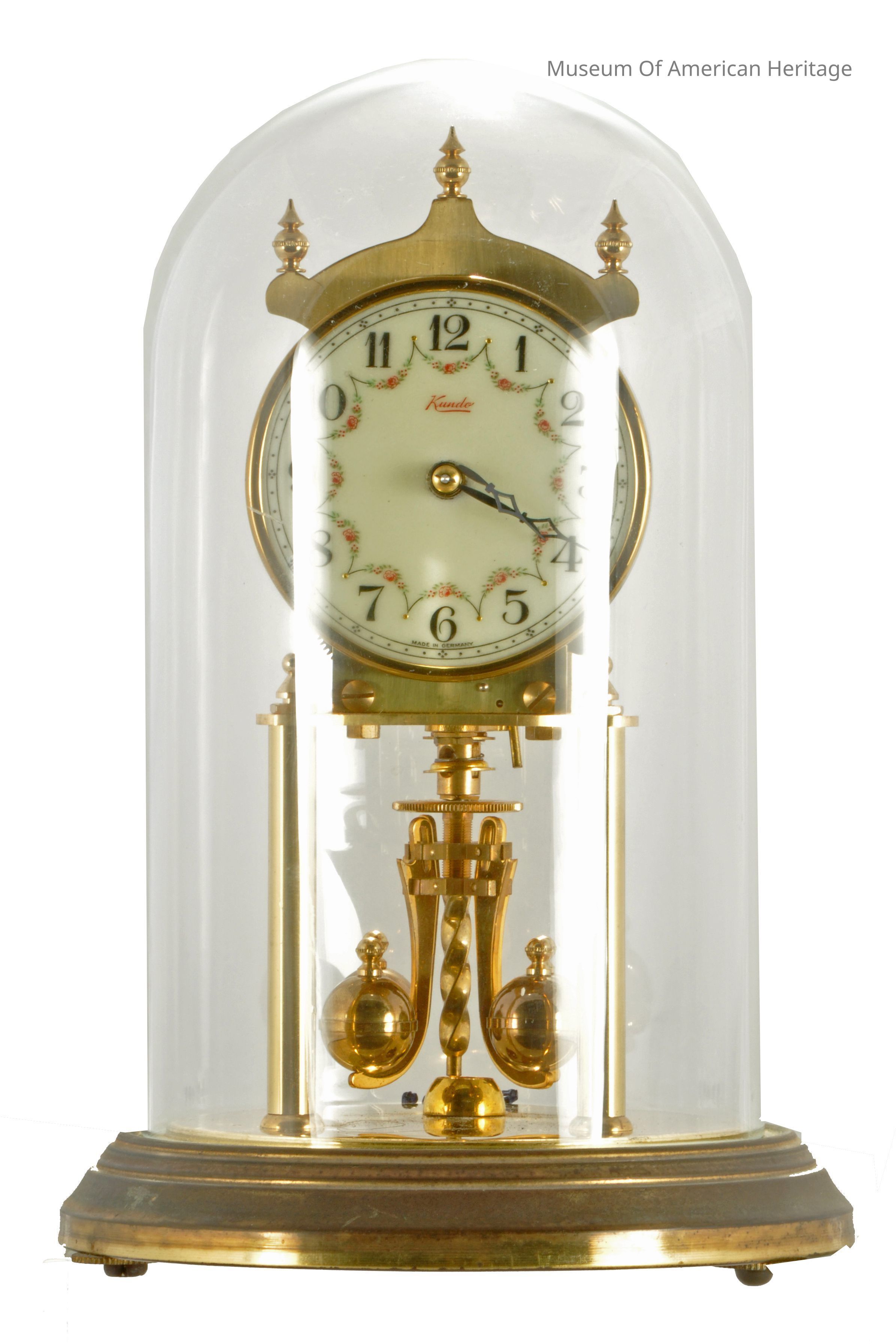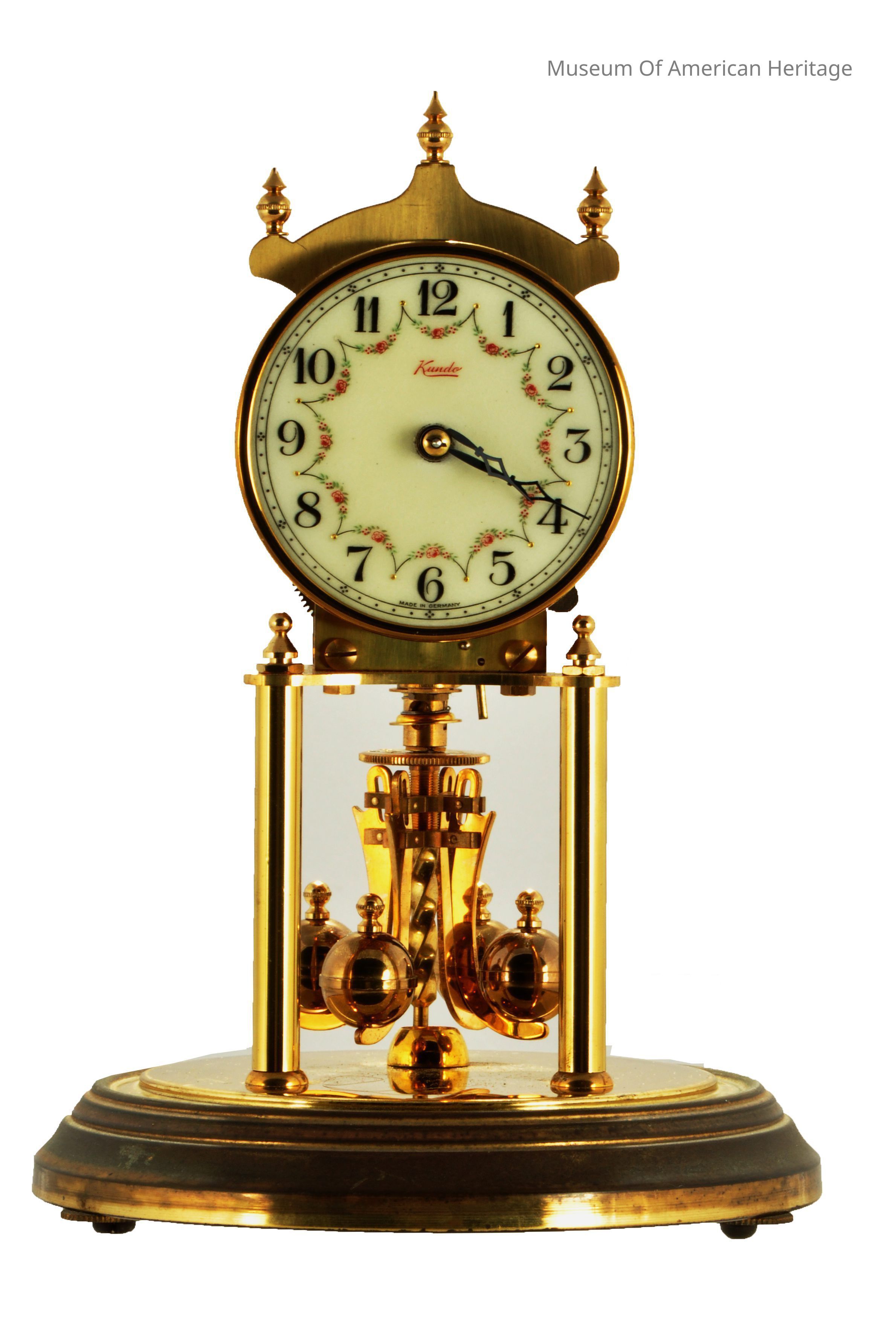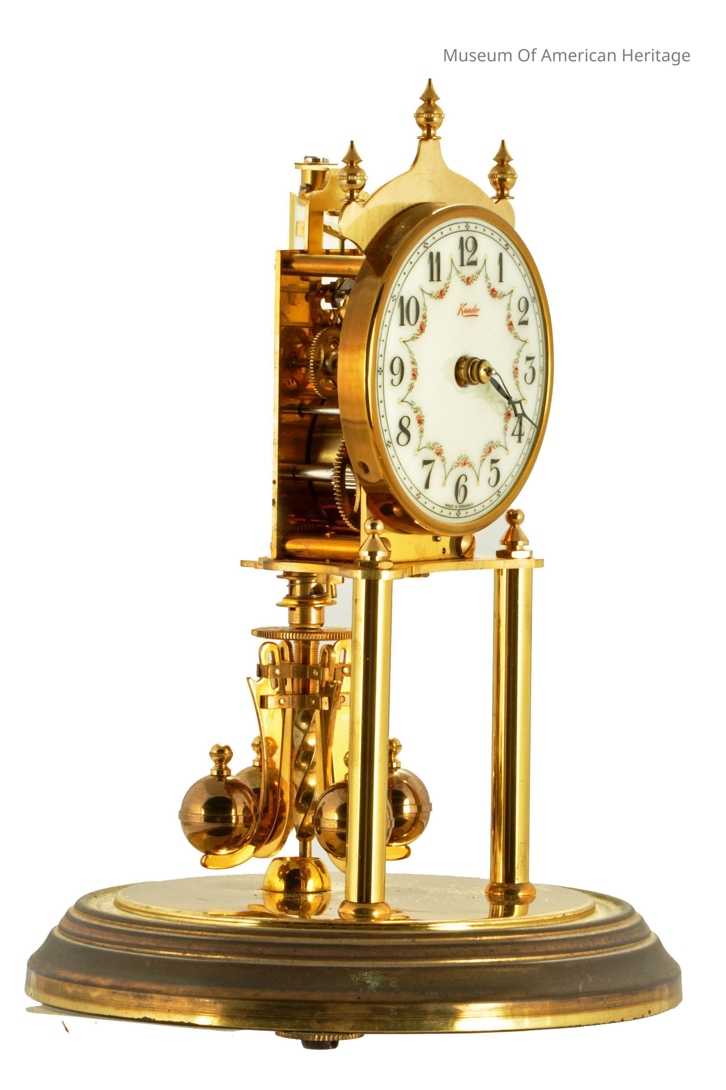 10 jewels, unadjusted, black numerals on white face, floral motif on face, 30 day?, four balls on rotating pendulum.