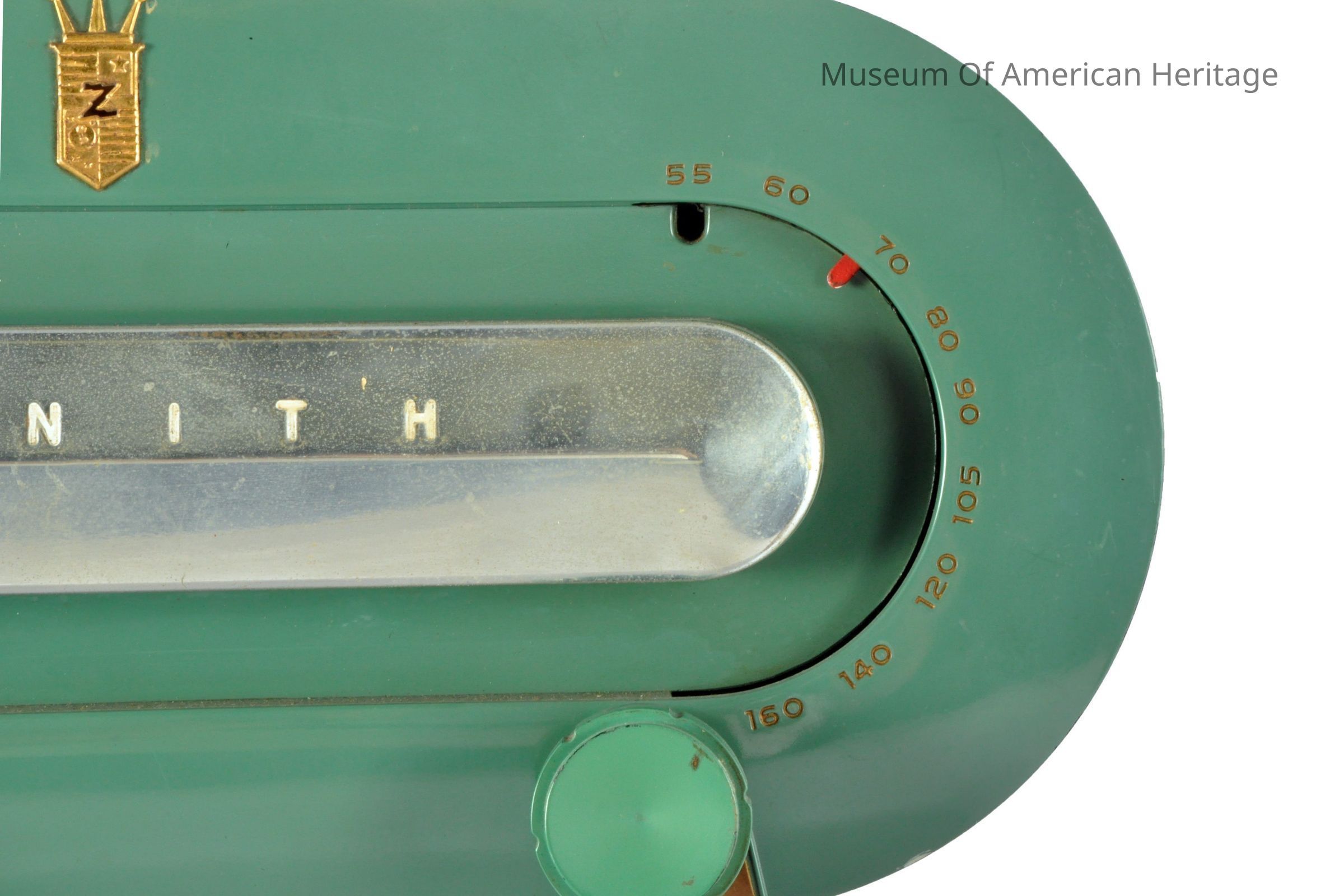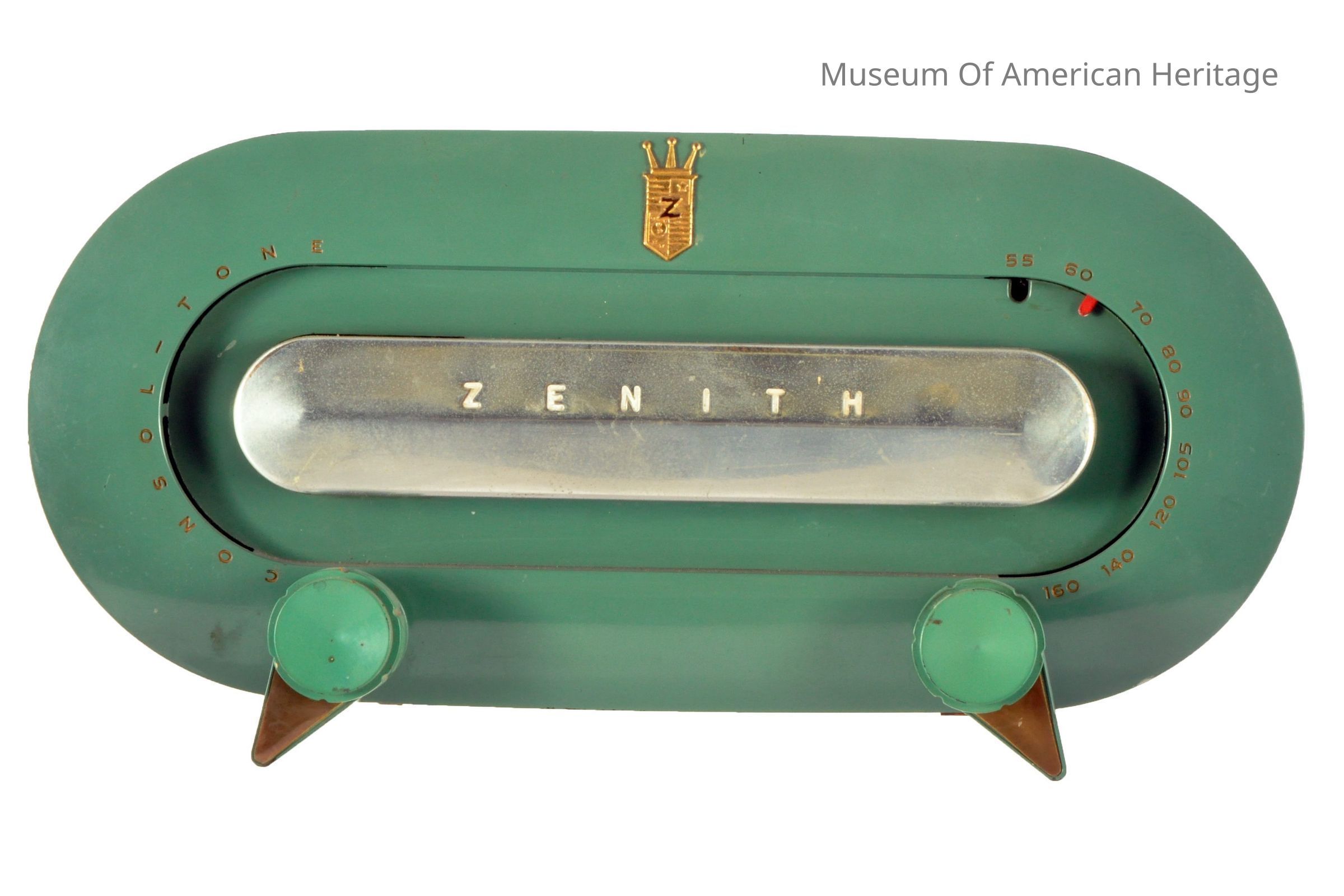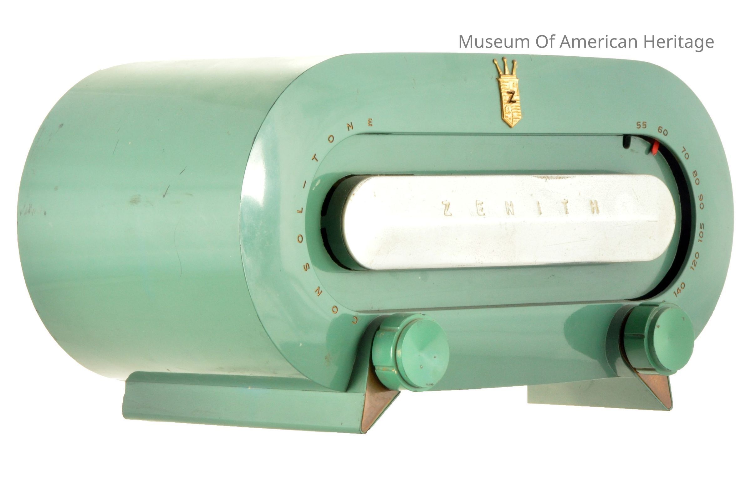 This radio stands out from other models made of bakelite due to its vibrant green color as opposed to the dark browns and blacks most common in bakelite cases. This model likely dates to the early 1950 and is an AM band only radio.