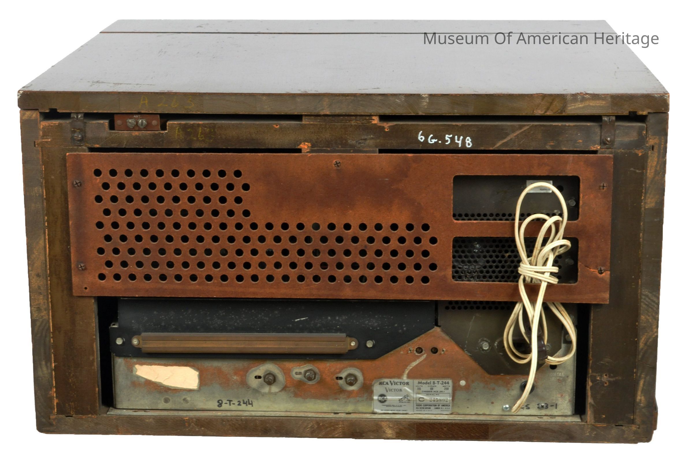 Mahogany veneer, 110v ac 60 cy, 250 watt, 9 picture, double doors.