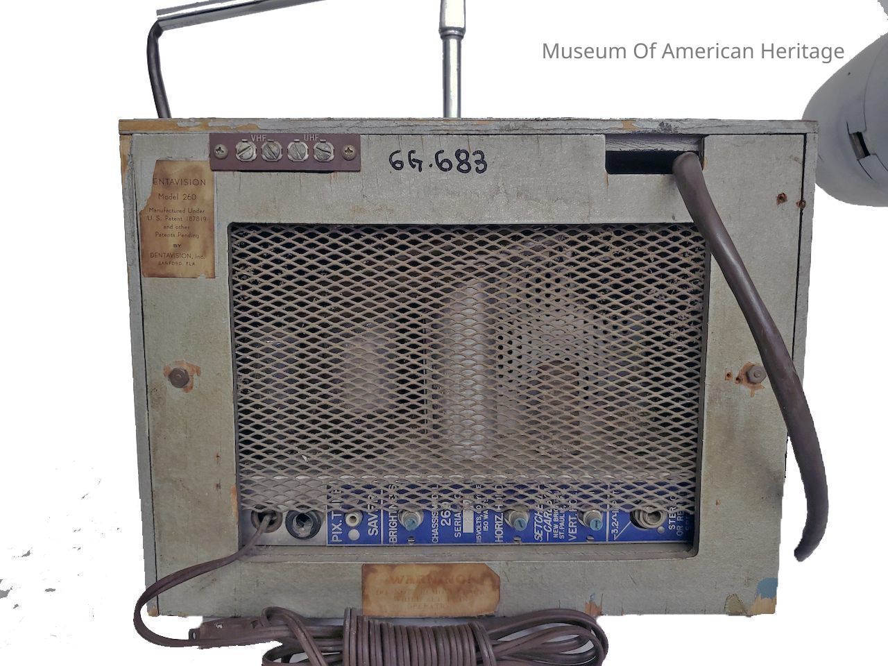 This unique television was designed for use in dentists offices, so that patients could watch television while having their teeth worked on. This television was slightly before its time and sold poorly, very few of them remain. This television is made up of parts from three different manufacturers, including a Sylvania picture tube.
